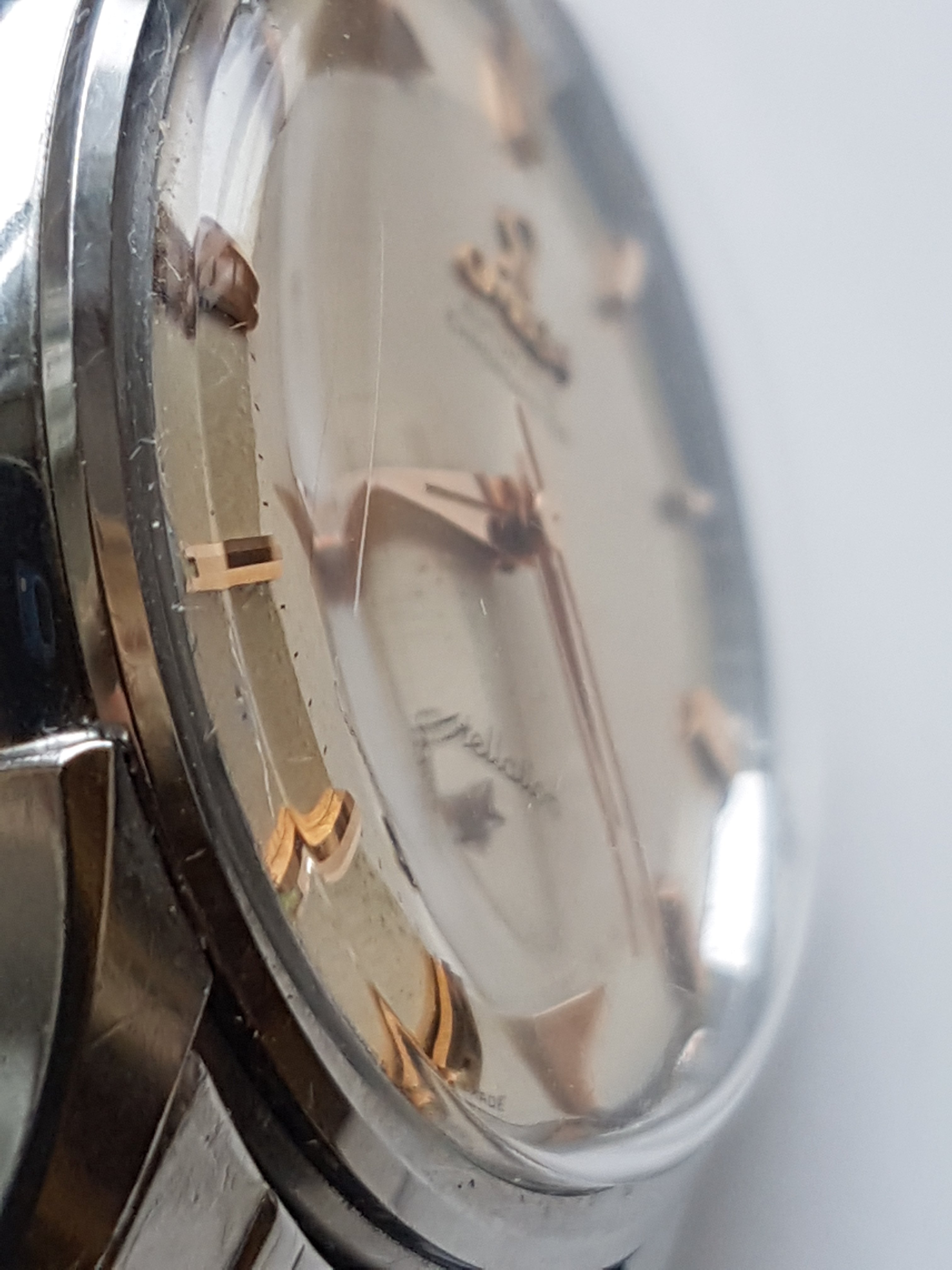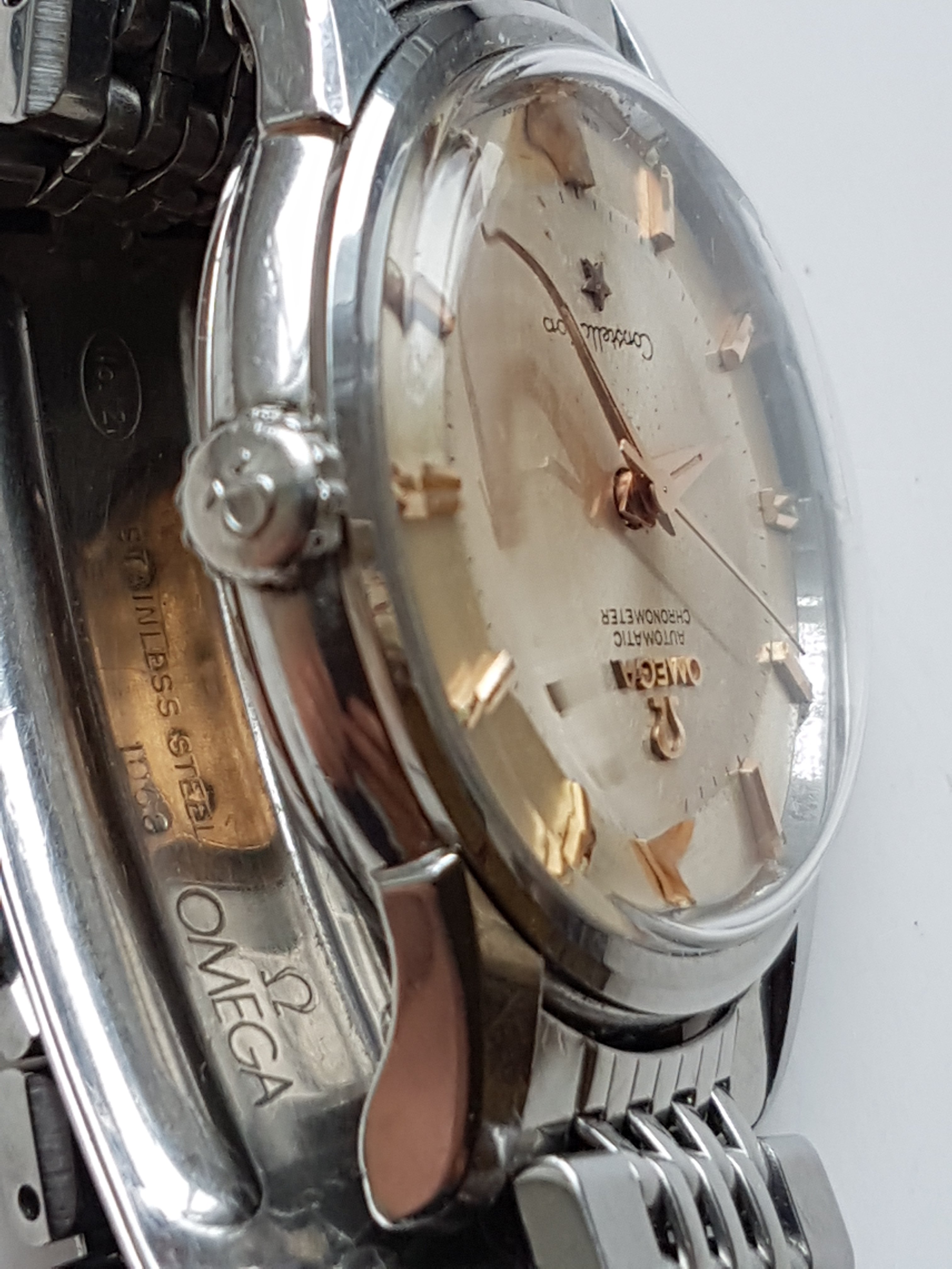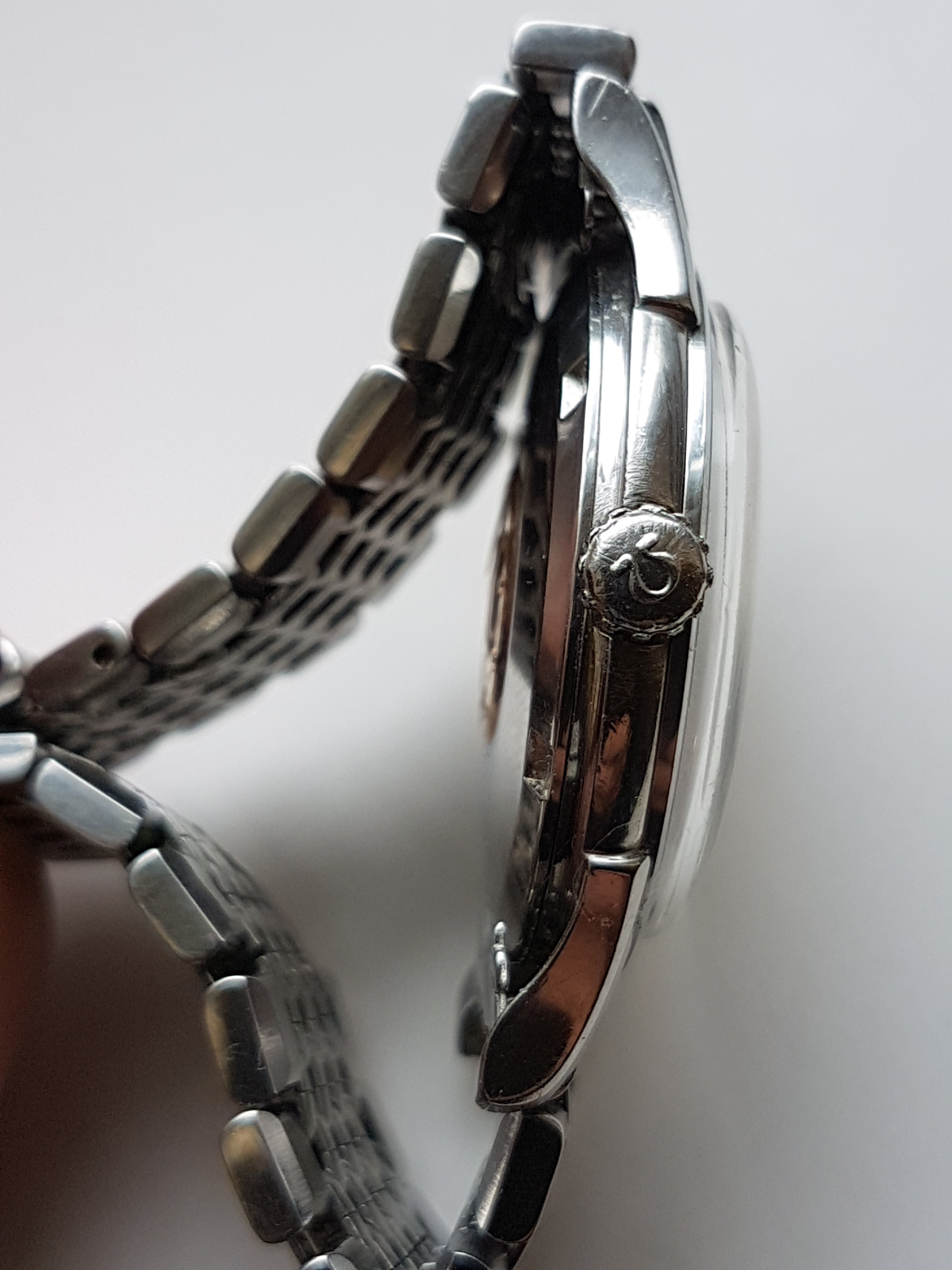 The watch is very nice but not pristine. A previous owner had scuffed the crown quite badly and I considered replacing it but never got round to this. The case has the usual minor scratches. There is slight spotting and bubbling to the dial. It's not noticeable except close up and is the same now as it was when I bought the watch 9 years ago. The (presumably original) Omega crystal has a scratch between 8 and 9, and either a scratch or a crack between 7 and 8 which I've tried to show in a sideways on photo.