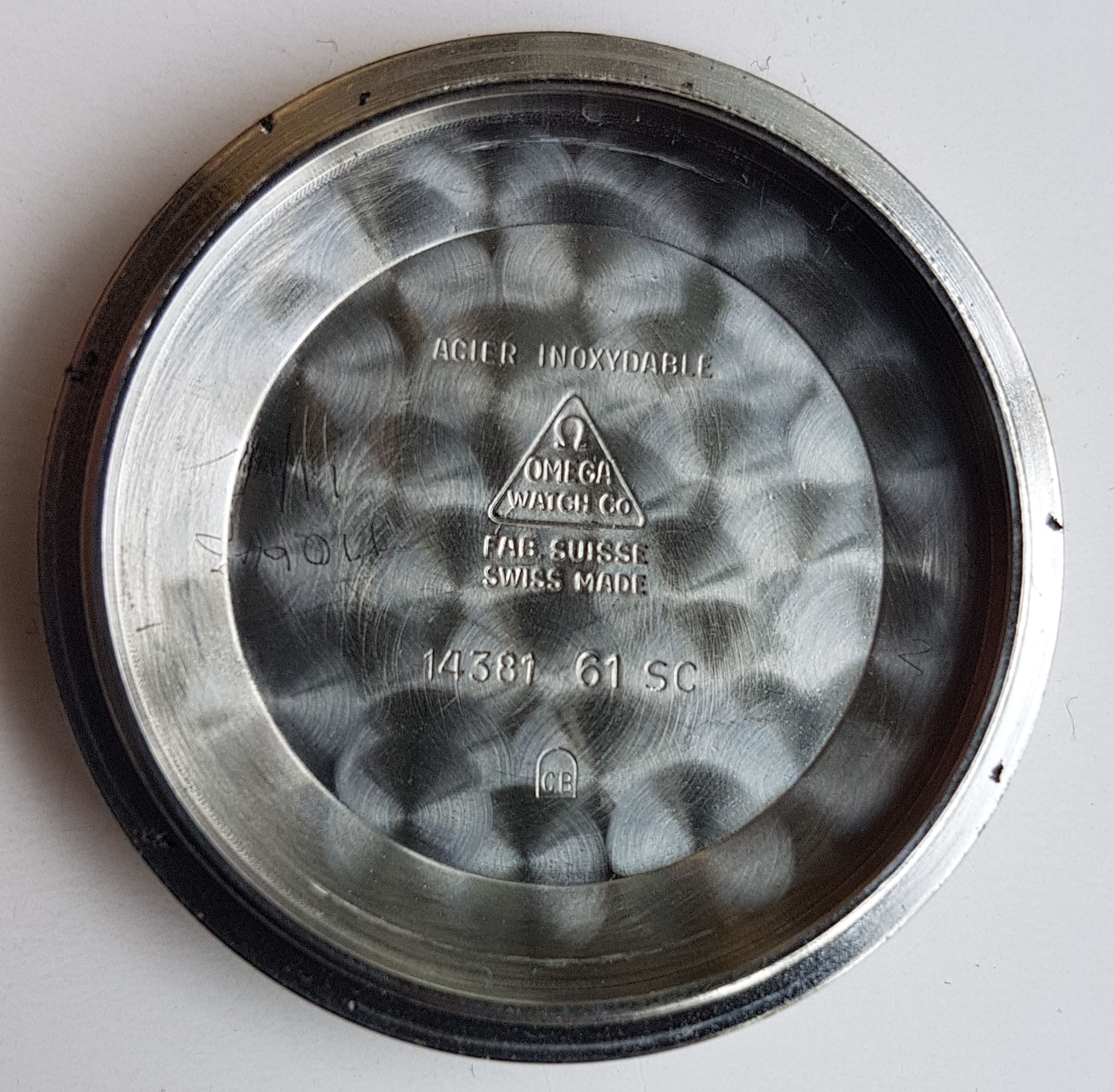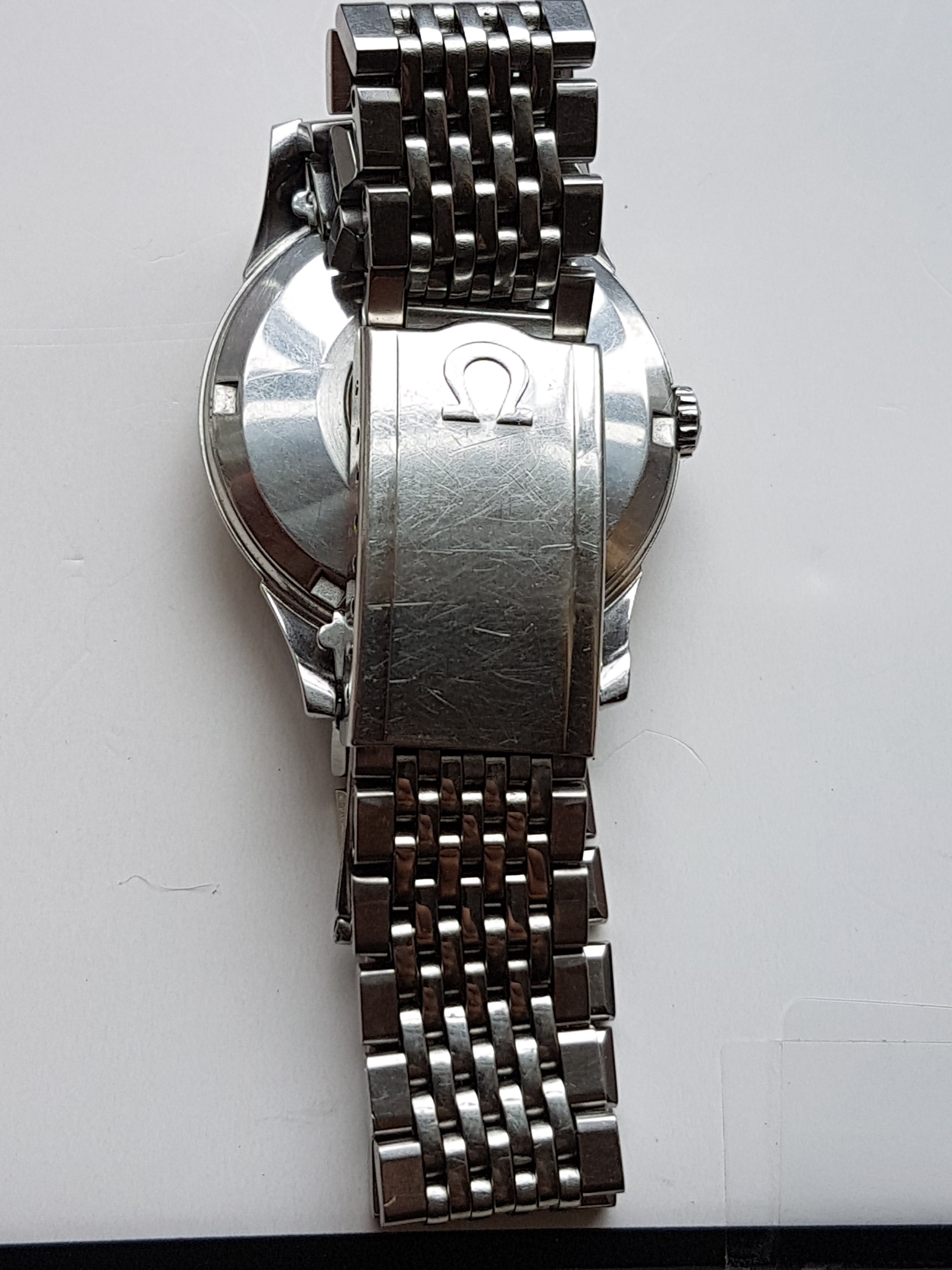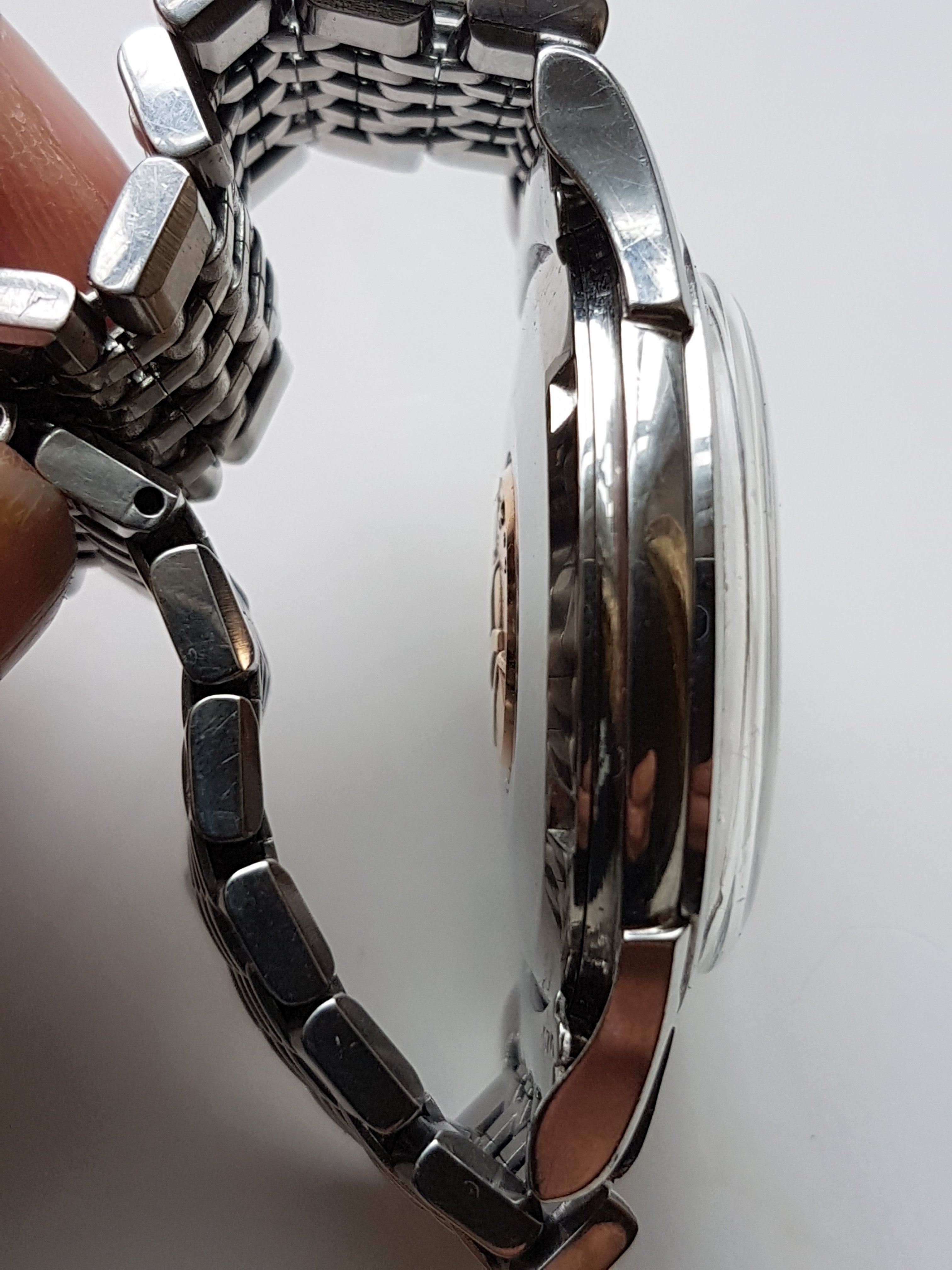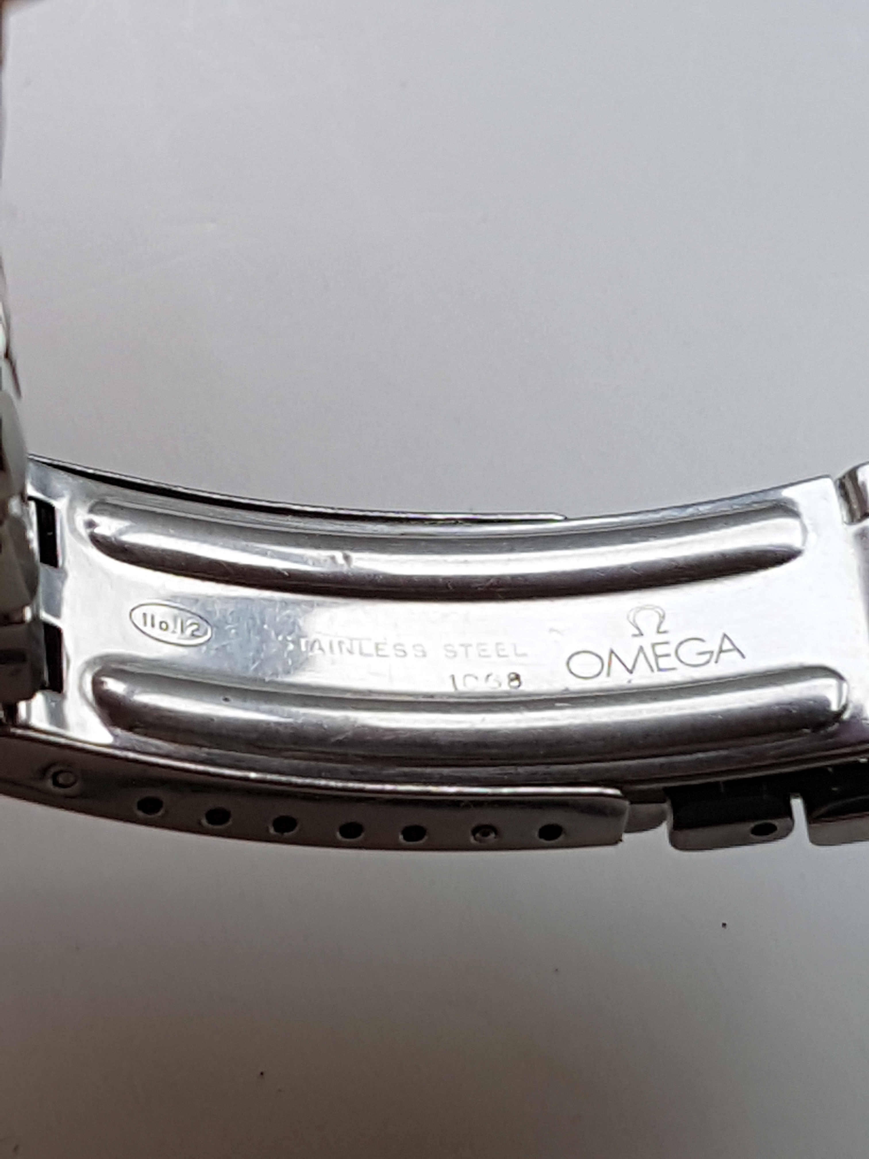 The watch is very nice but not pristine. A previous owner had scuffed the crown quite badly and I considered replacing it but never got round to this. The case has the usual minor scratches. There is slight spotting and bubbling to the dial. It's not noticeable except close up and is the same now as it was when I bought the watch 9 years ago. The (presumably original) Omega crystal has a scratch between 8 and 9, and either a scratch or a crack between 7 and 8 which I've tried to show in a sideways on photo.