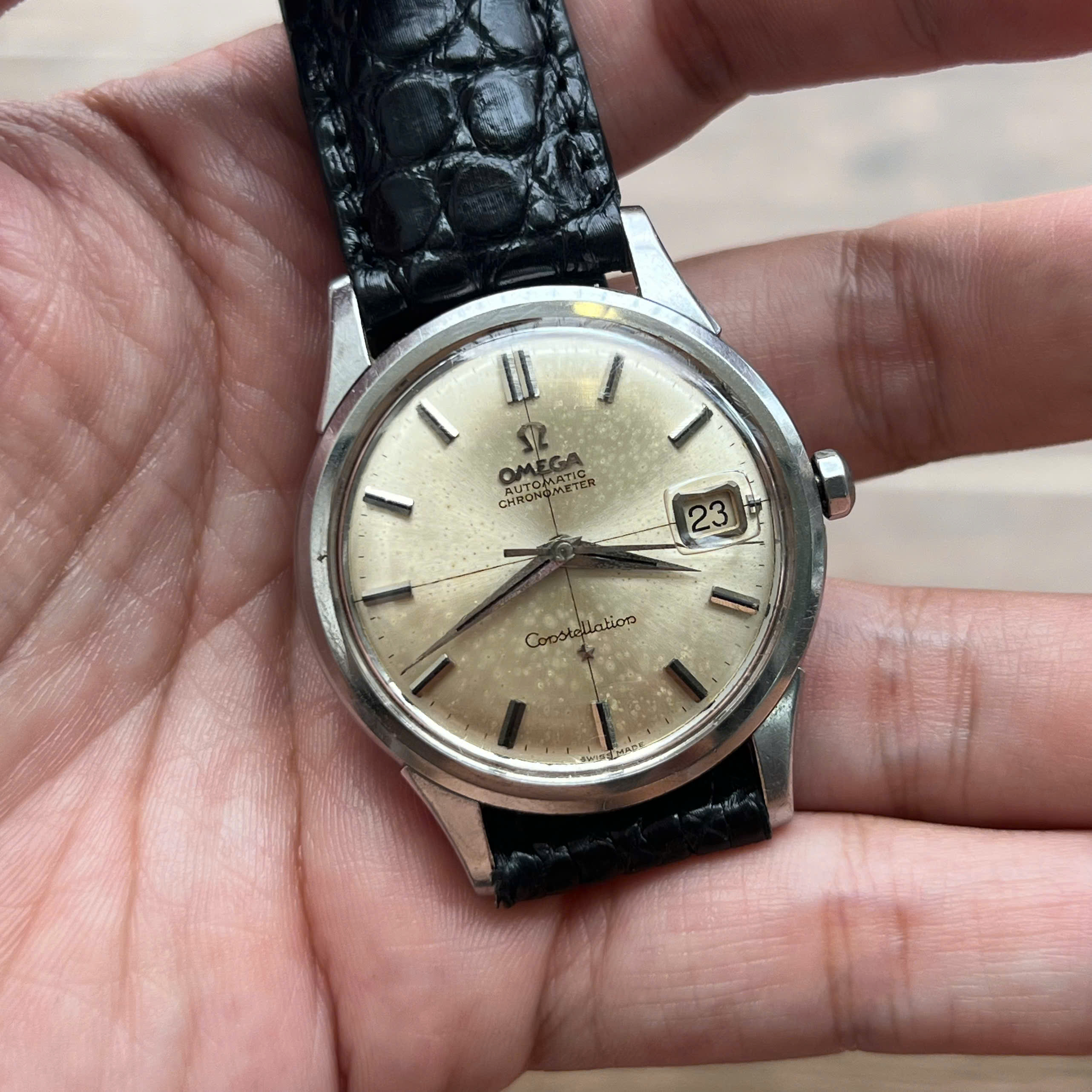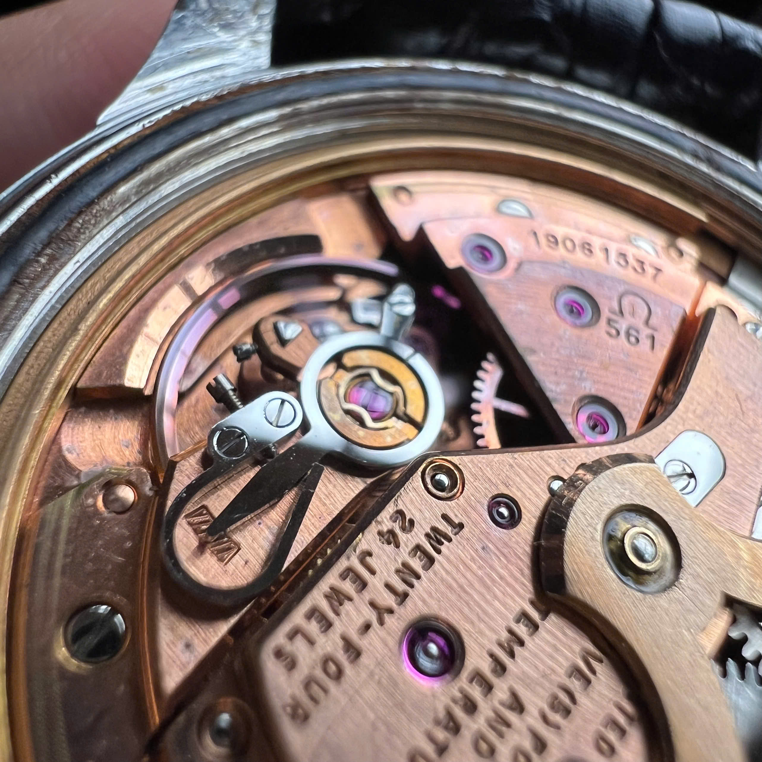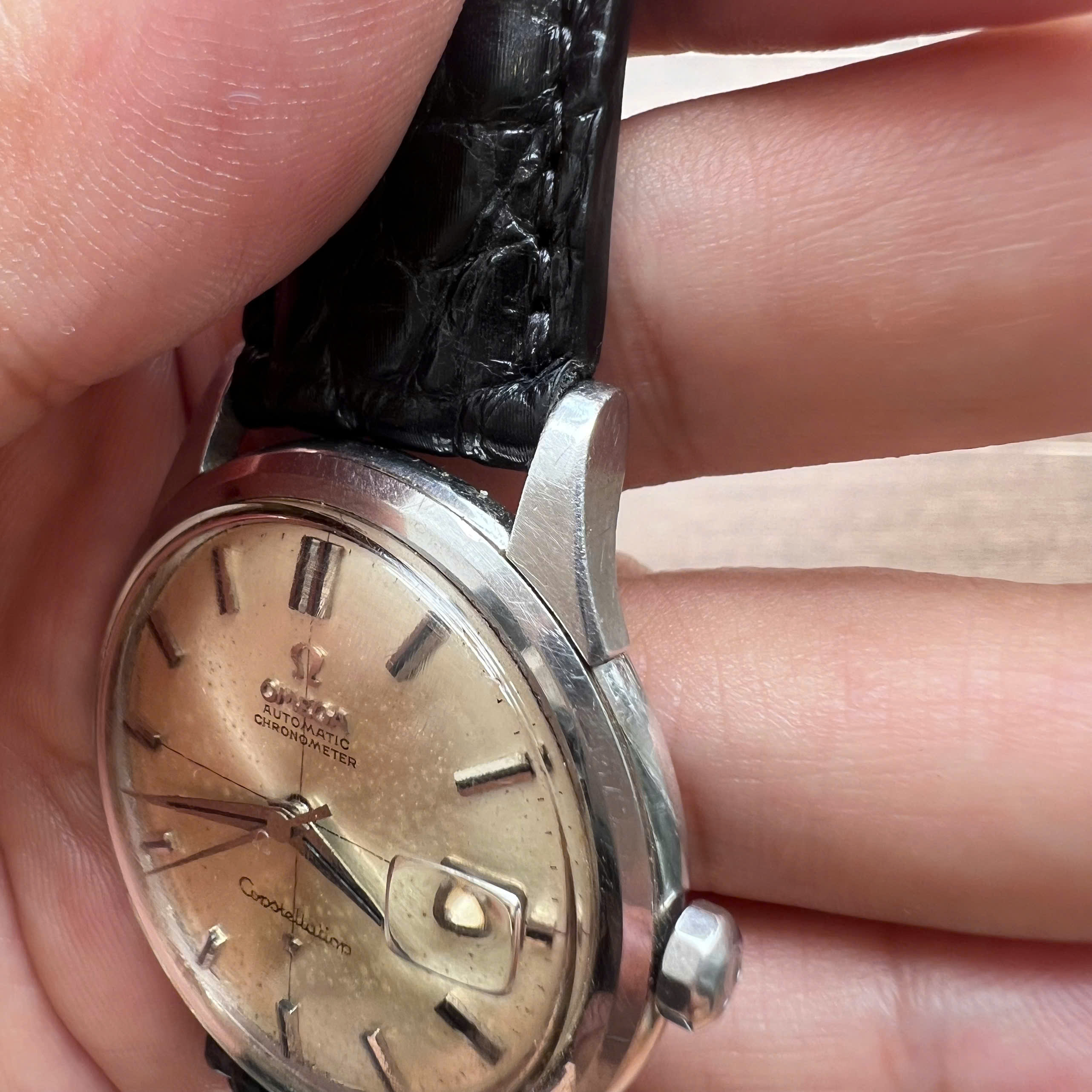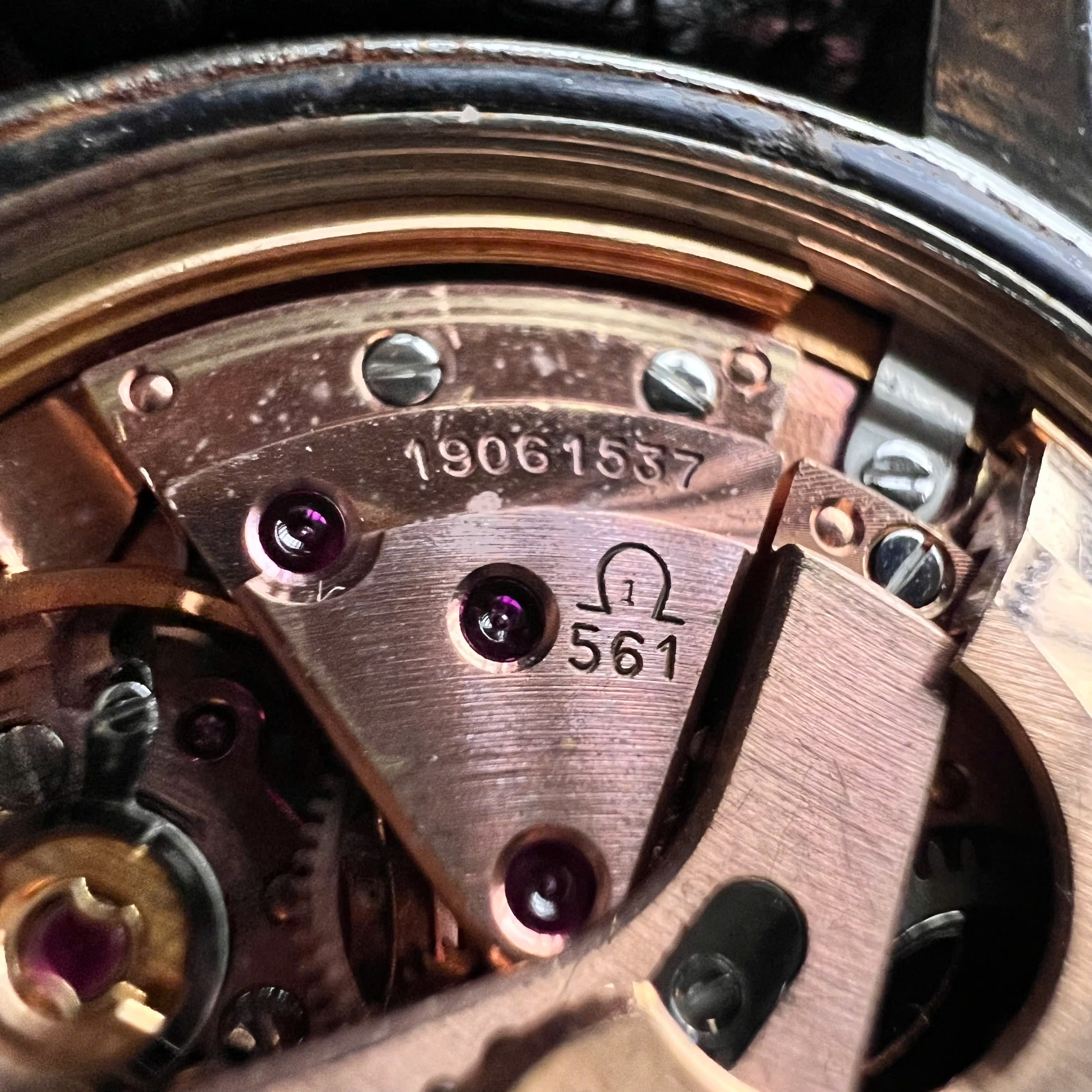 - Movement: Omega Cal. 561, watch is running, winding is smooth, date jump as it should, semi quickset date checked. Service history is unknown. Serial number is in 19 mils range, which dated the watch to aproximately 1962.