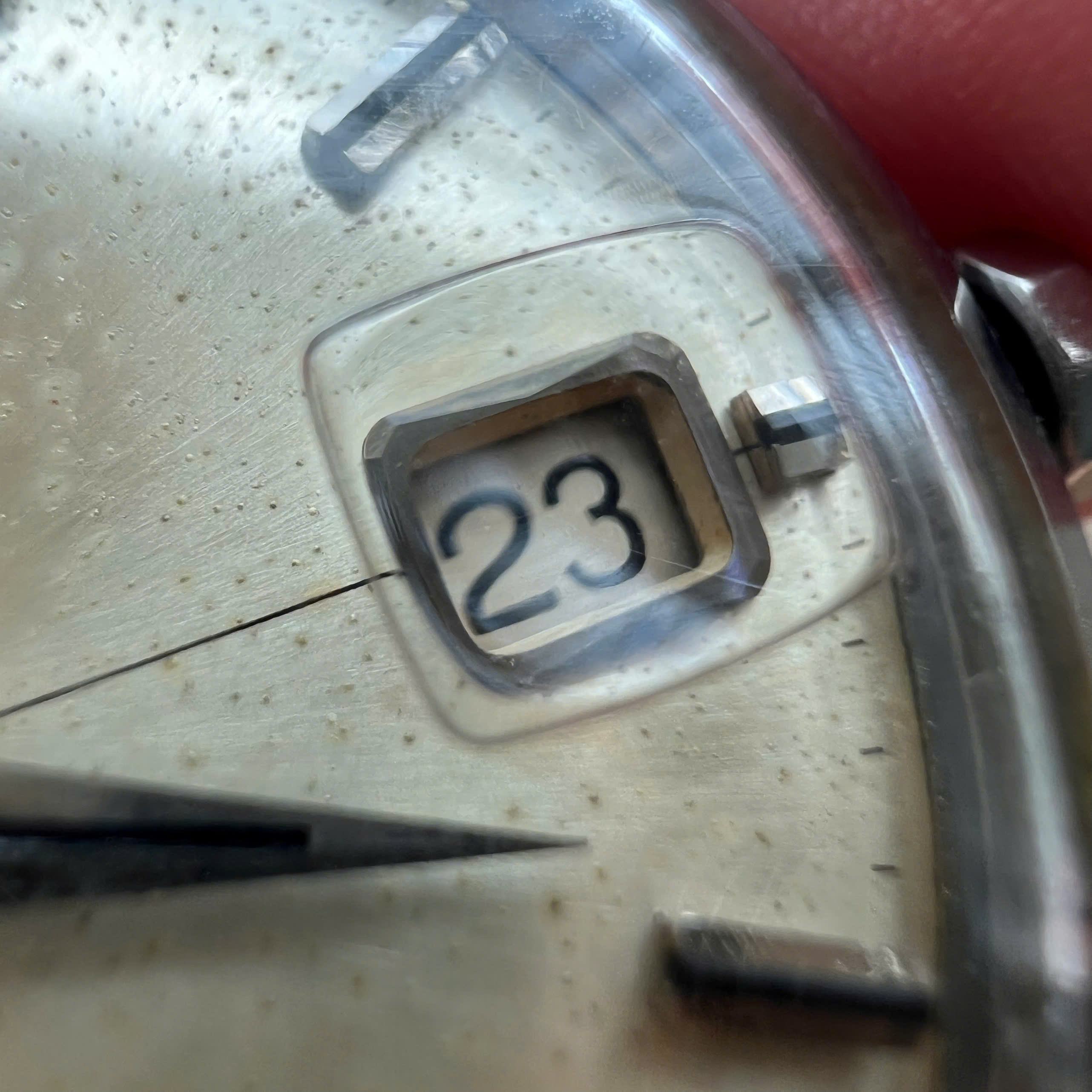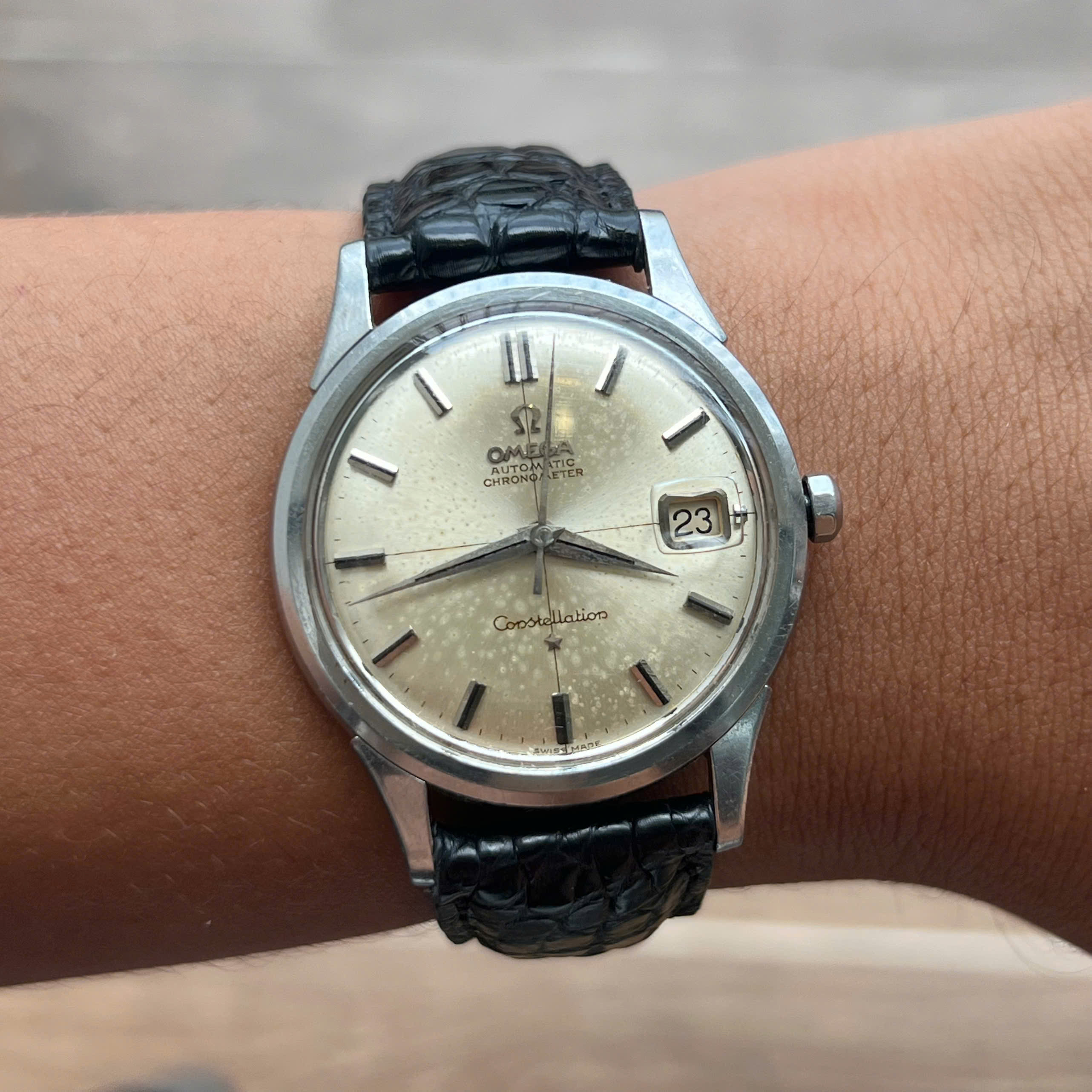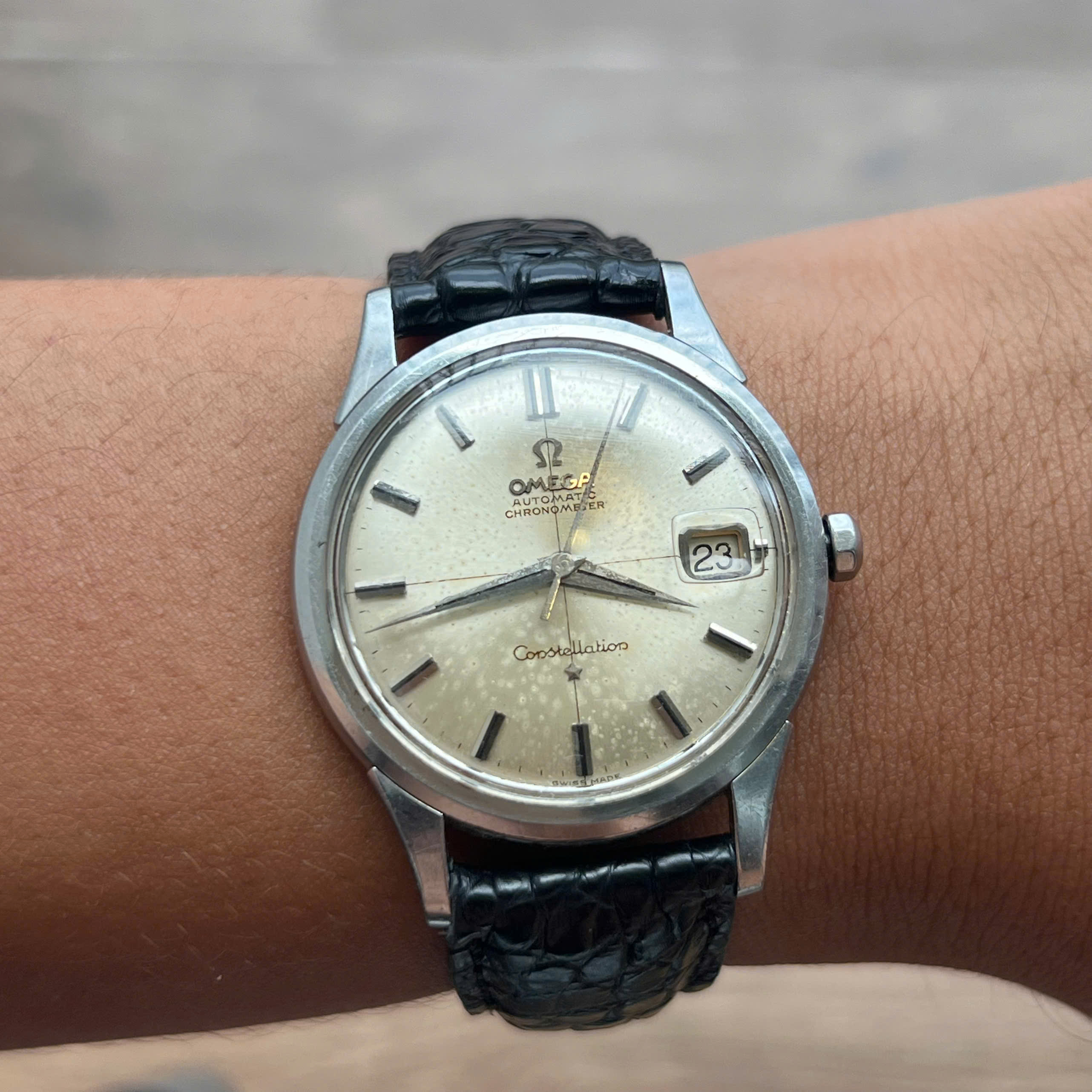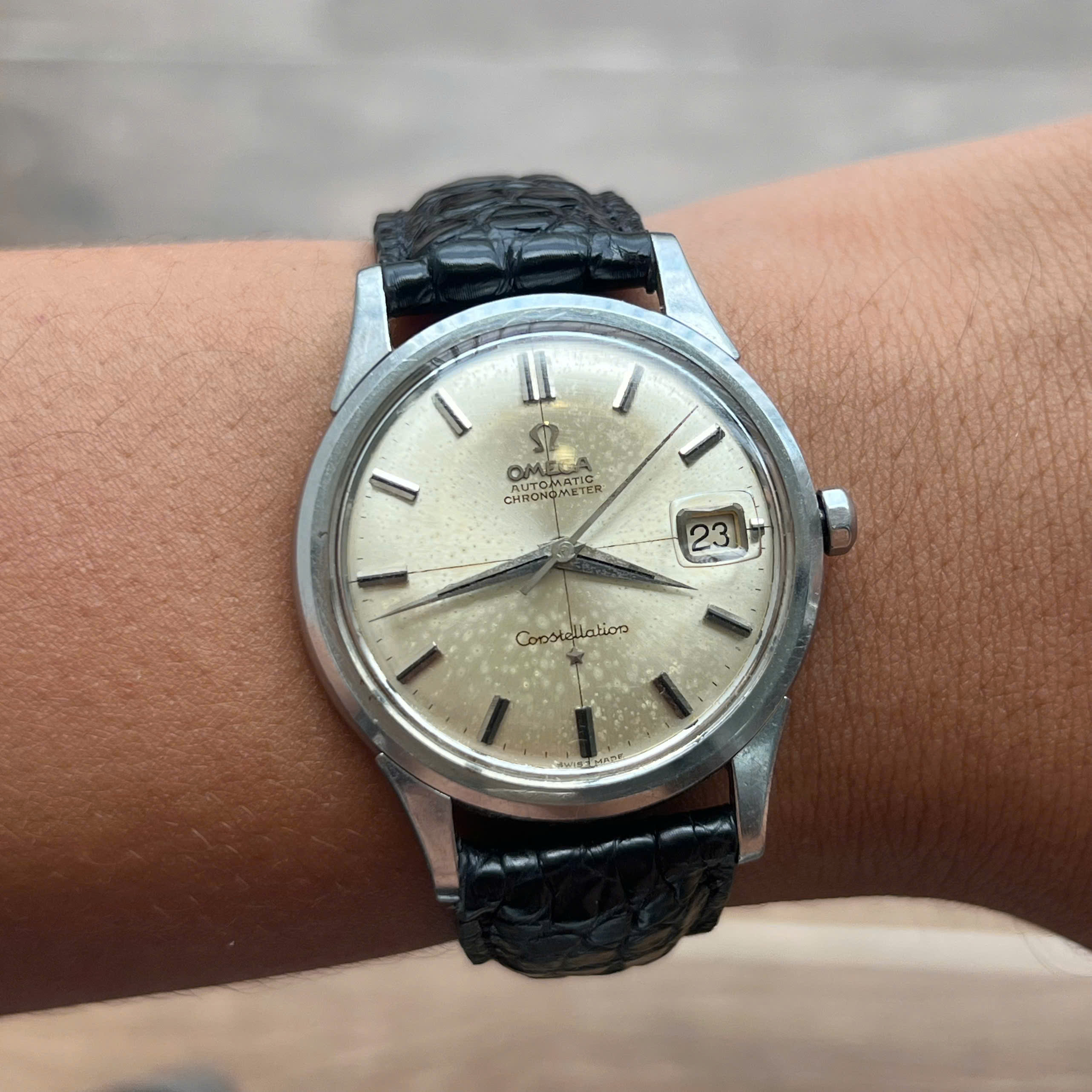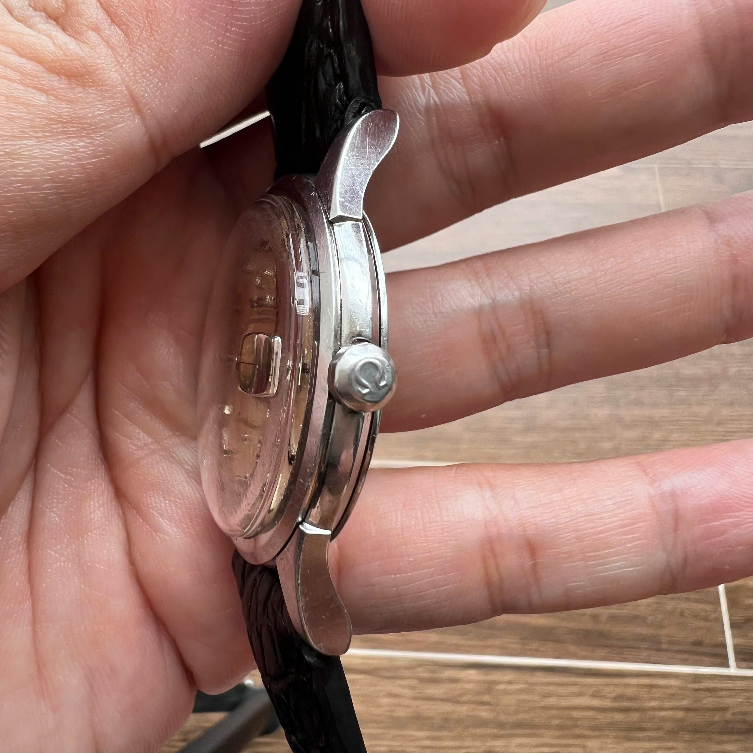 - Movement: Omega Cal. 561, watch is running, winding is smooth, date jump as it should, semi quickset date checked. Service history is unknown. Serial number is in 19 mils range, which dated the watch to aproximately 1962.