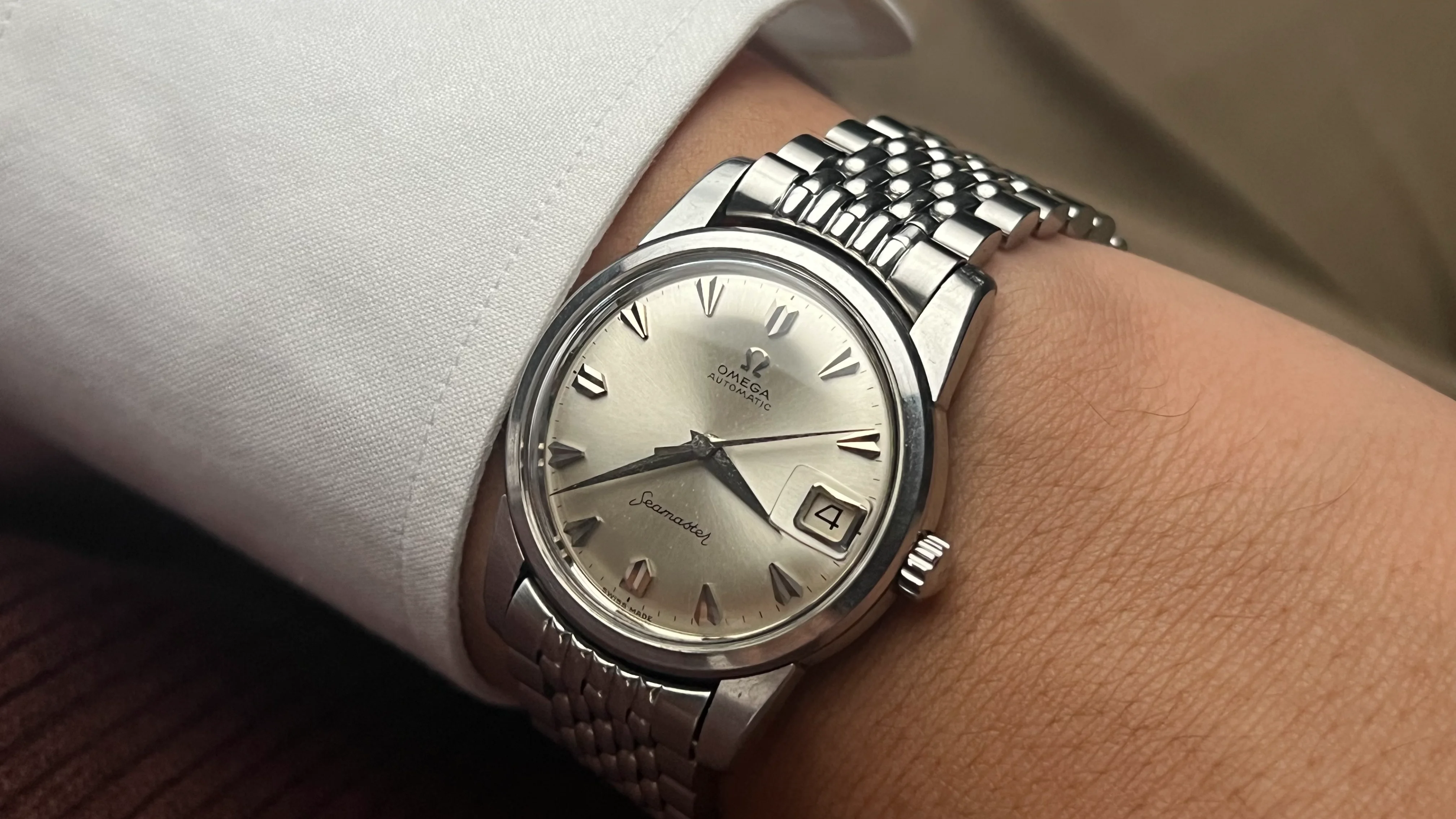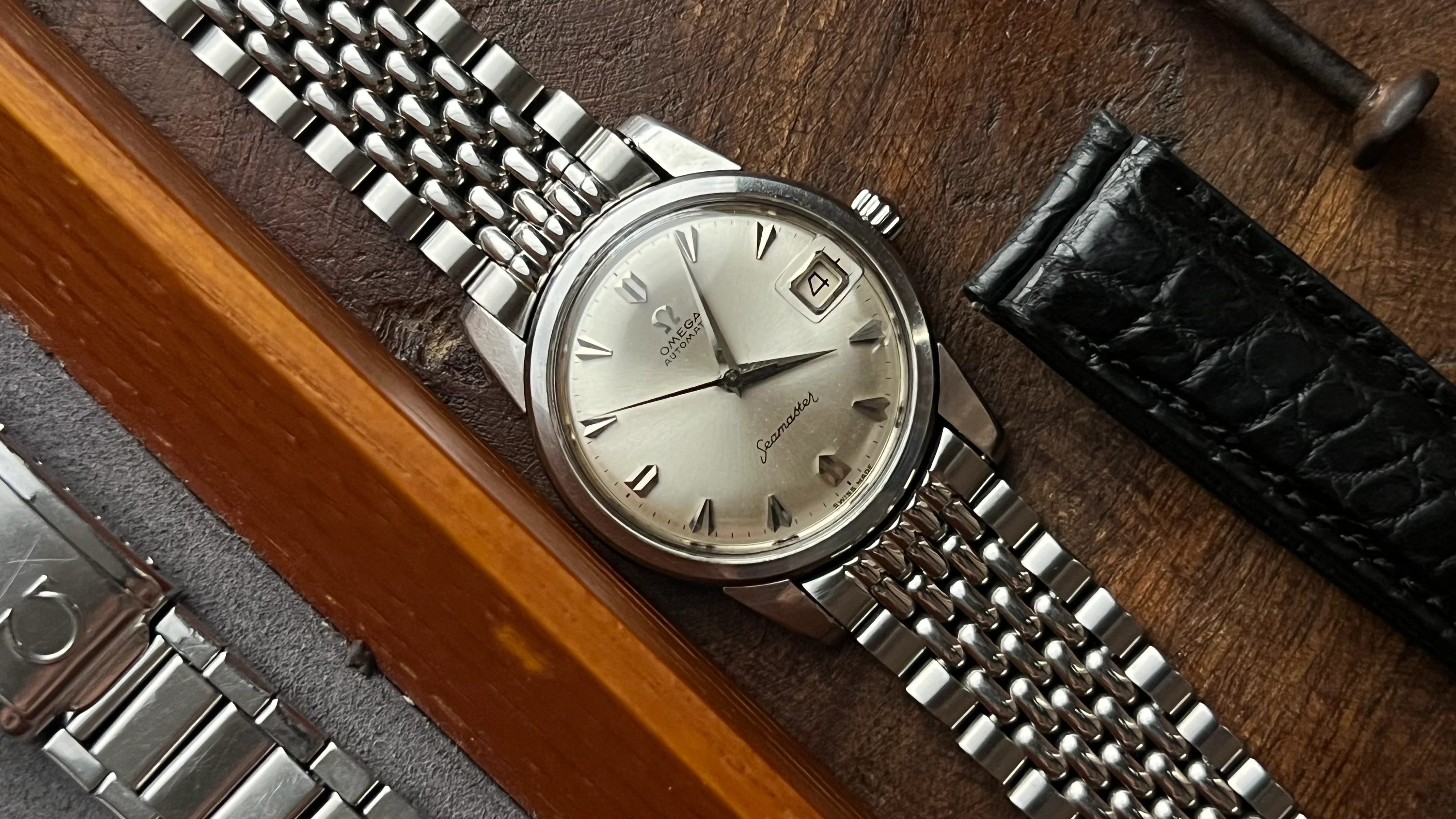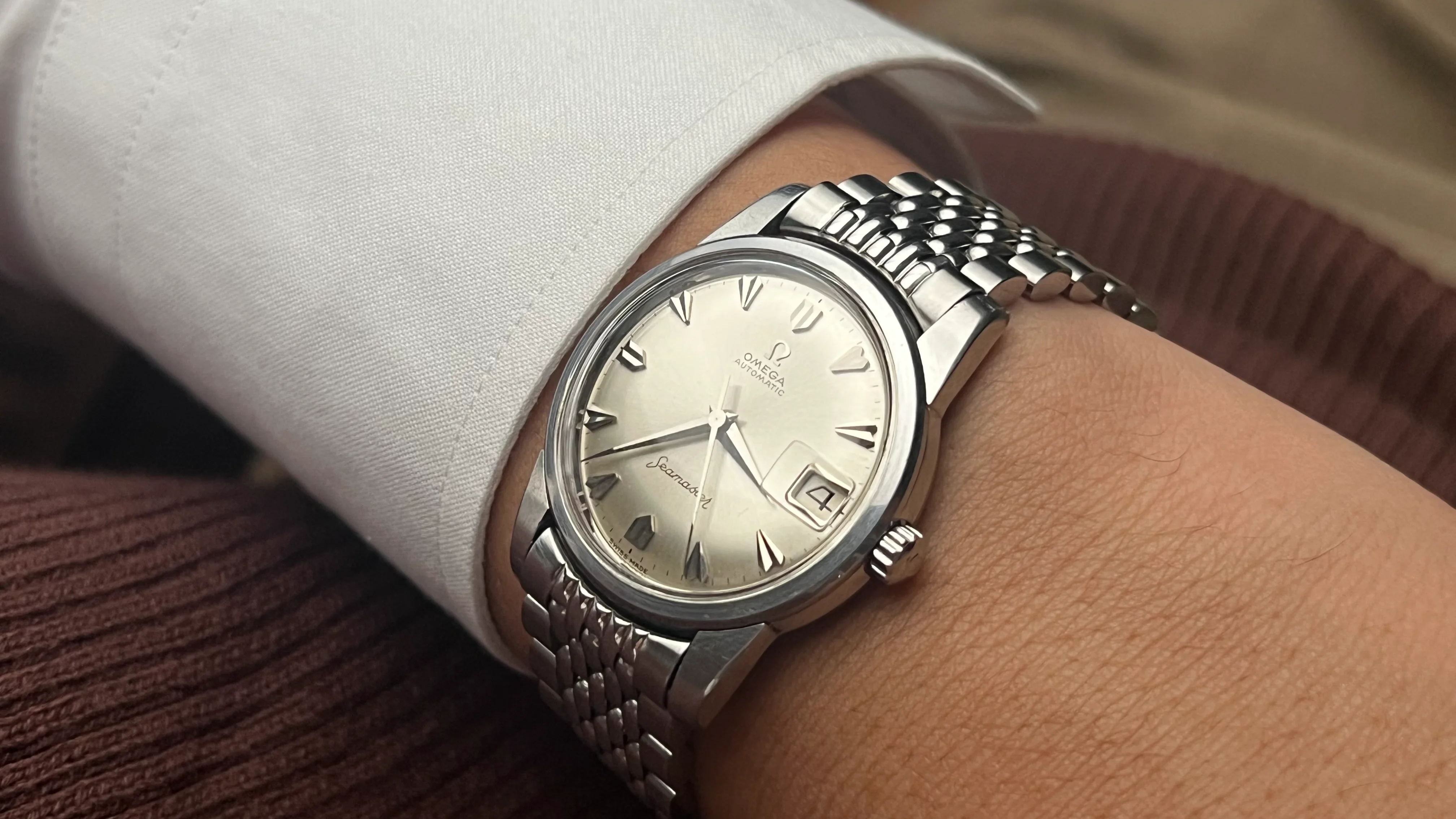 It comes on the original Omega beads-of-rice bracelet, ref. 1036 with No. 11 endlinks, fitting approximately a 7" wrist.