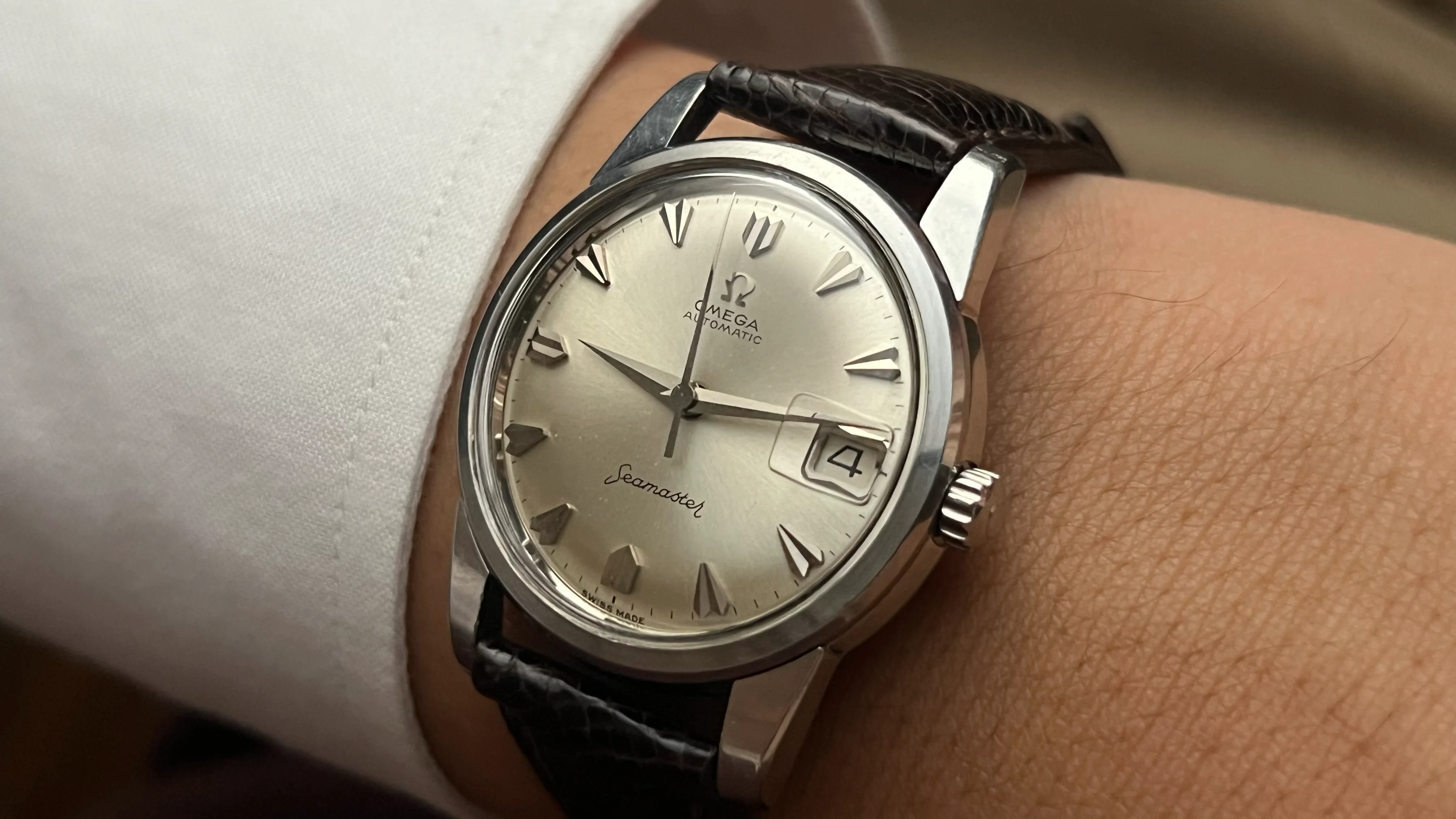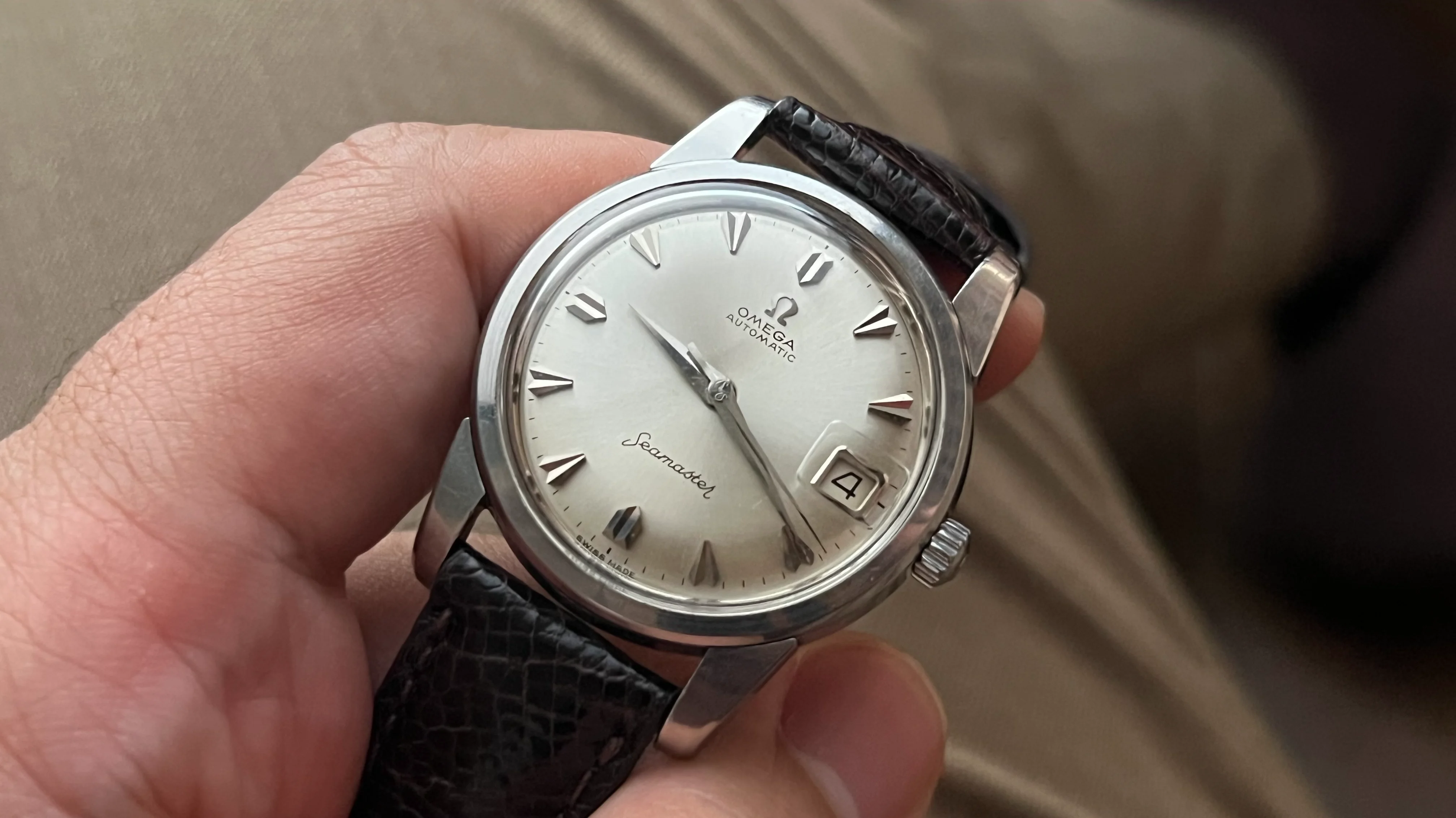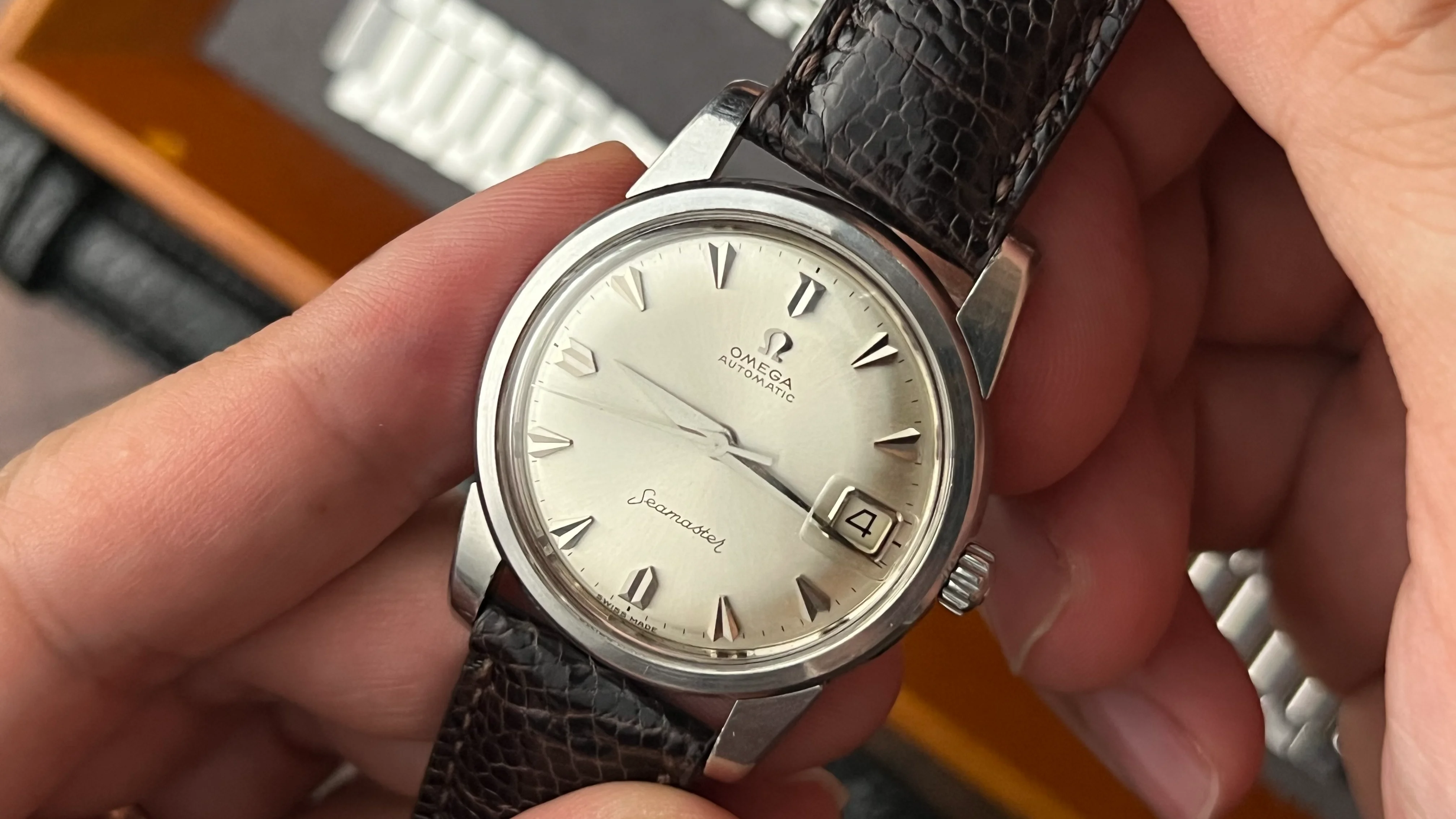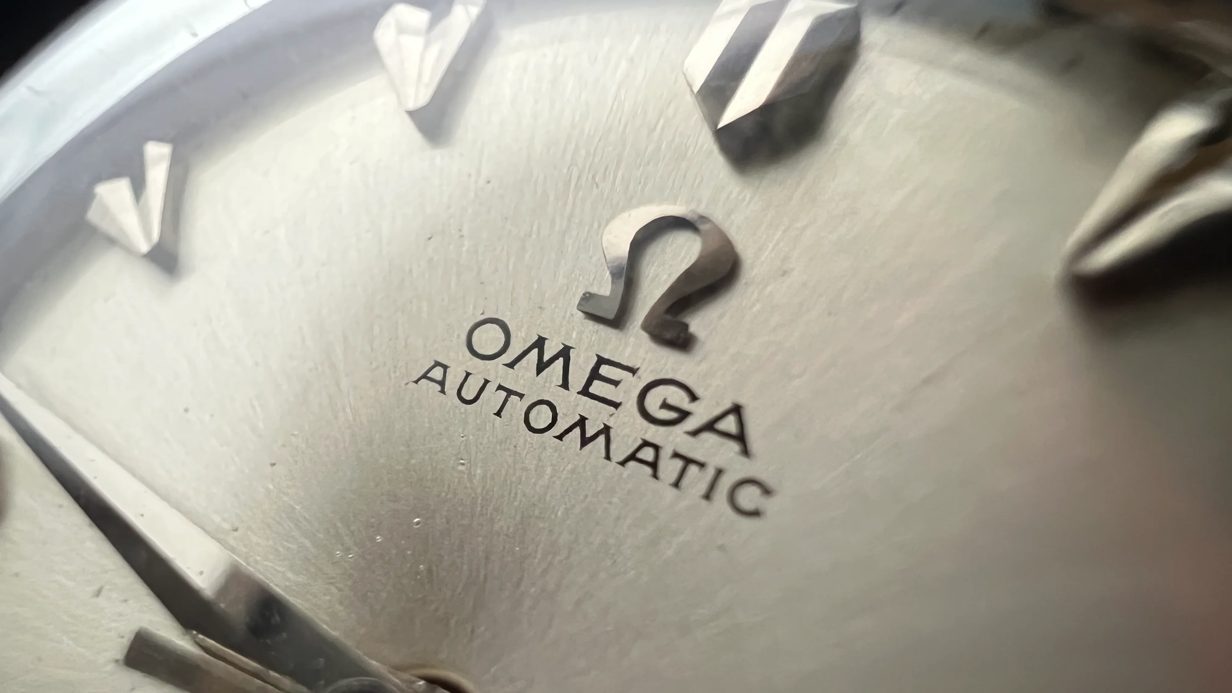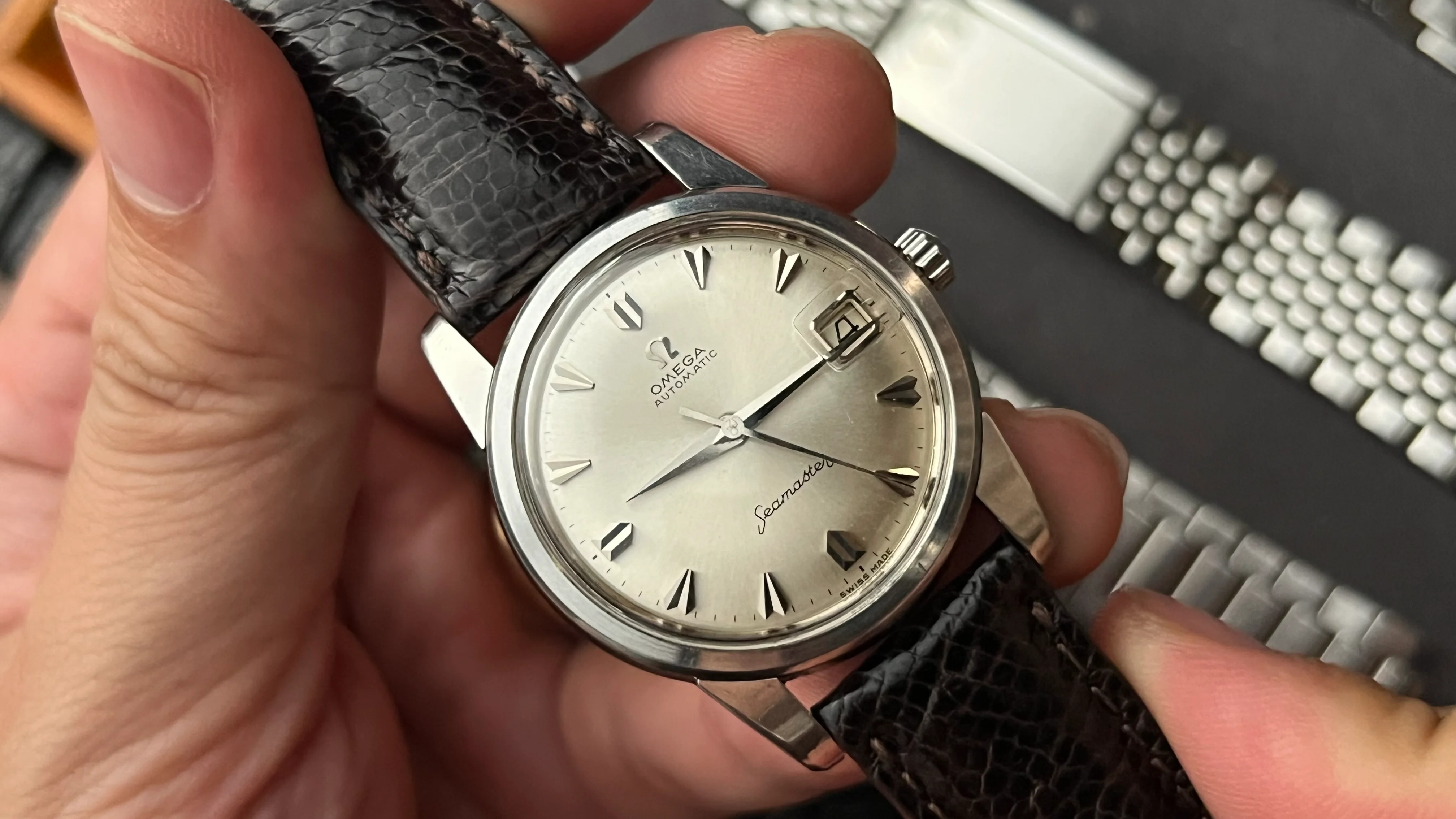 This one has an original silver sunburst dial with applied arrowhead markers, which is an uncommon dial variant for this reference. The dial is overall clean and attractive, with only a few tiny specks visible under close inspection.