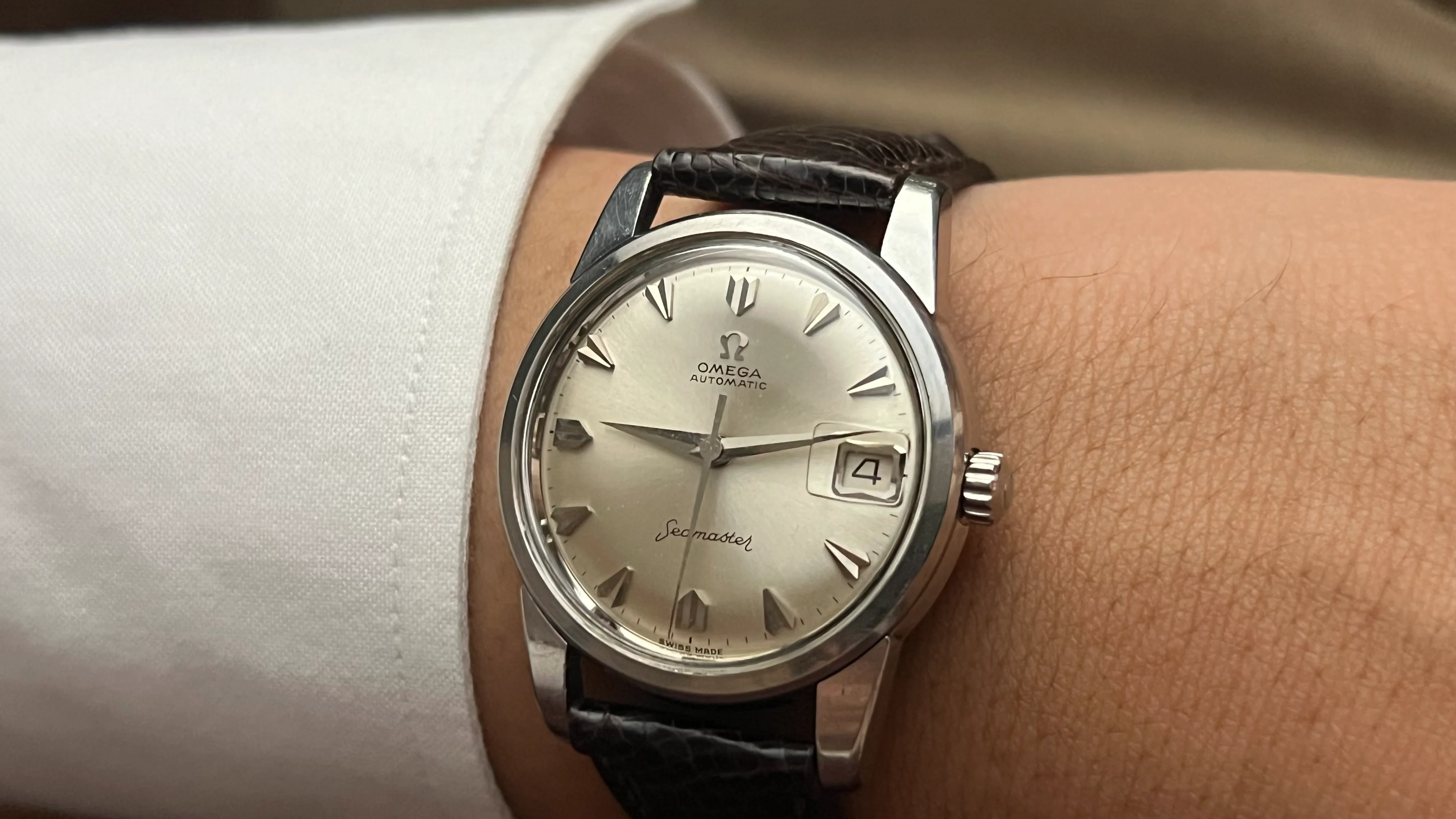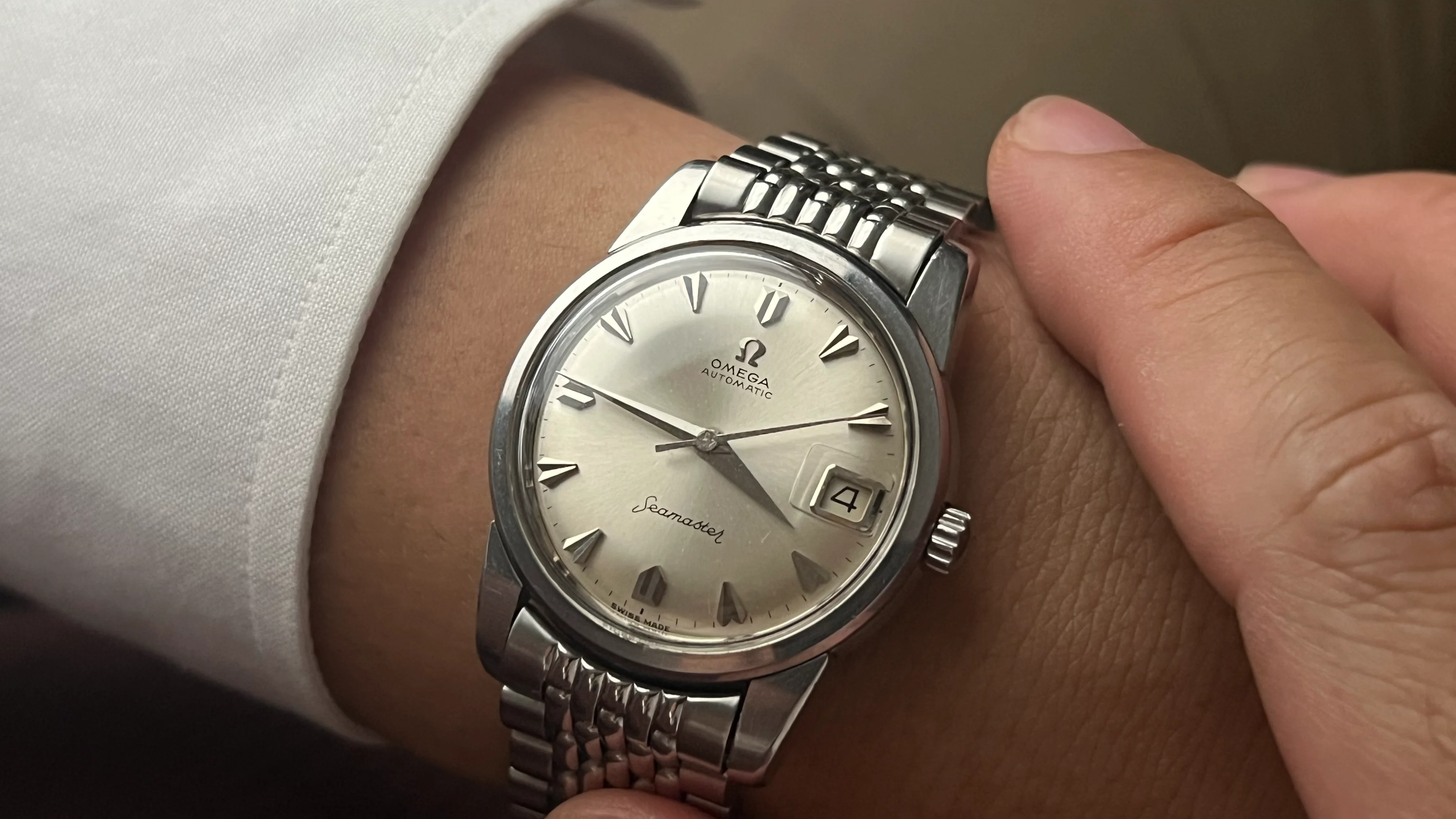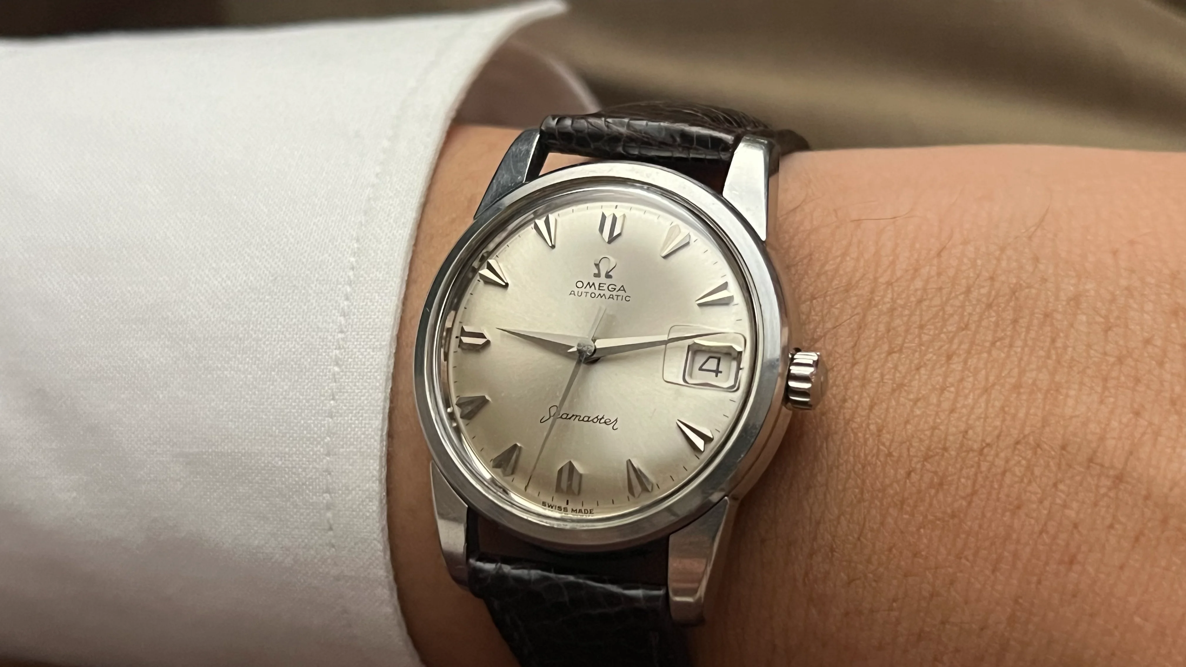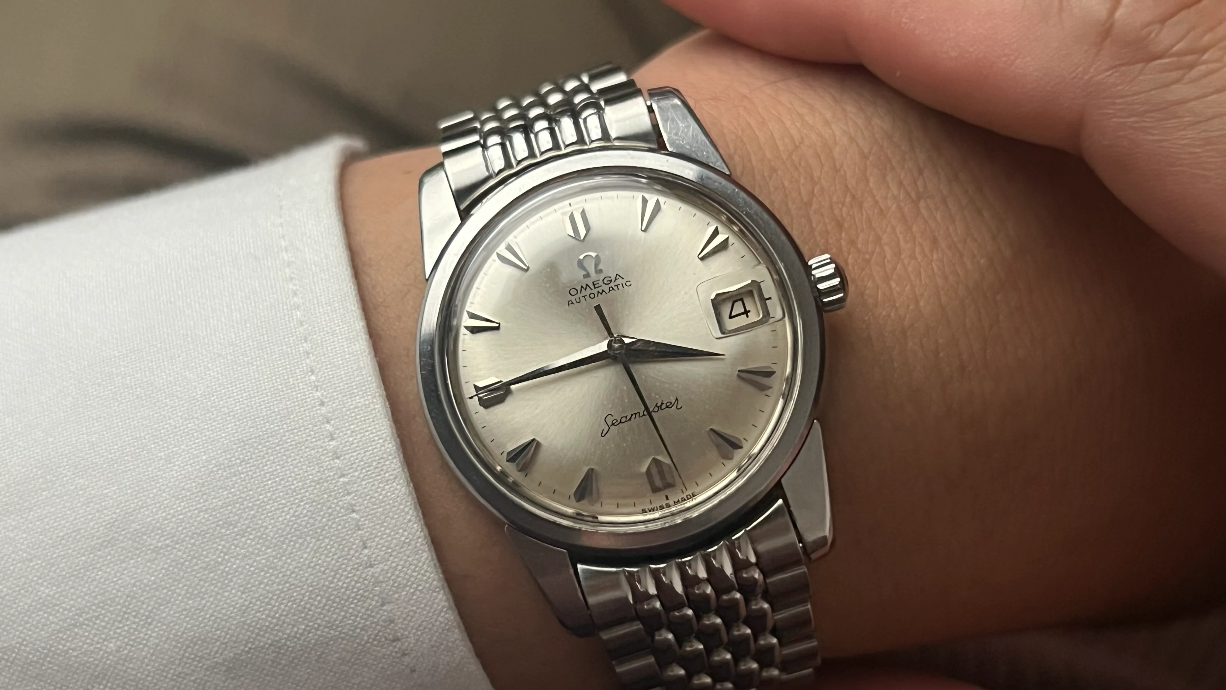 This one has an original silver sunburst dial with applied arrowhead markers, which is an uncommon dial variant for this reference. The dial is overall clean and attractive, with only a few tiny specks visible under close inspection.