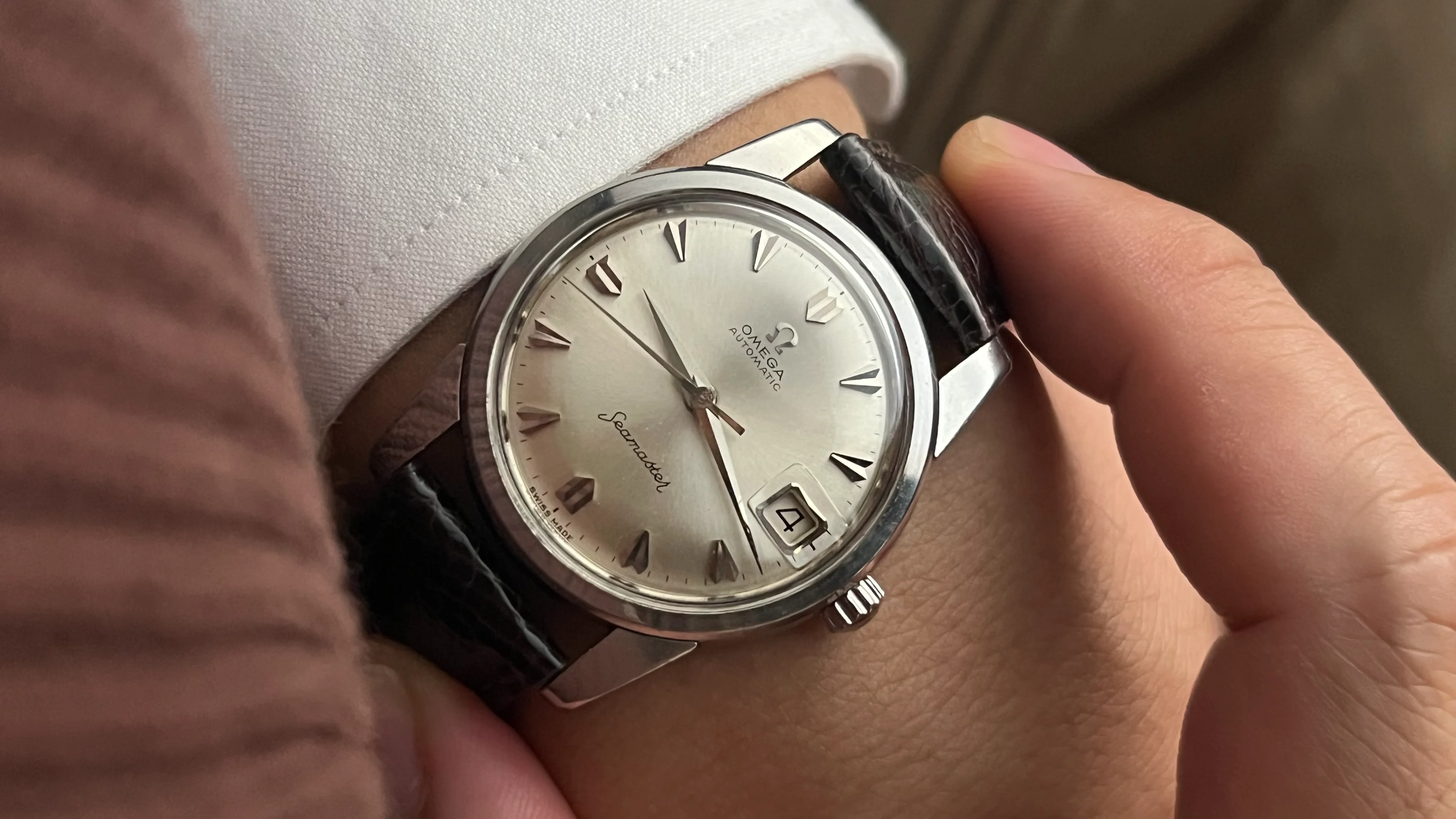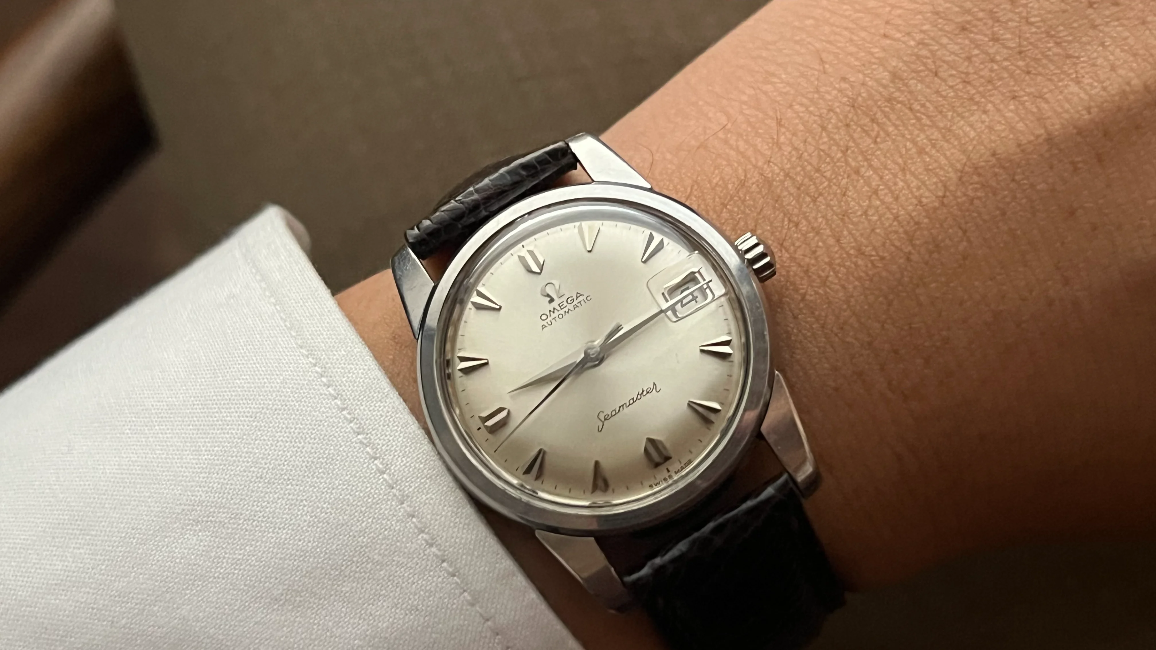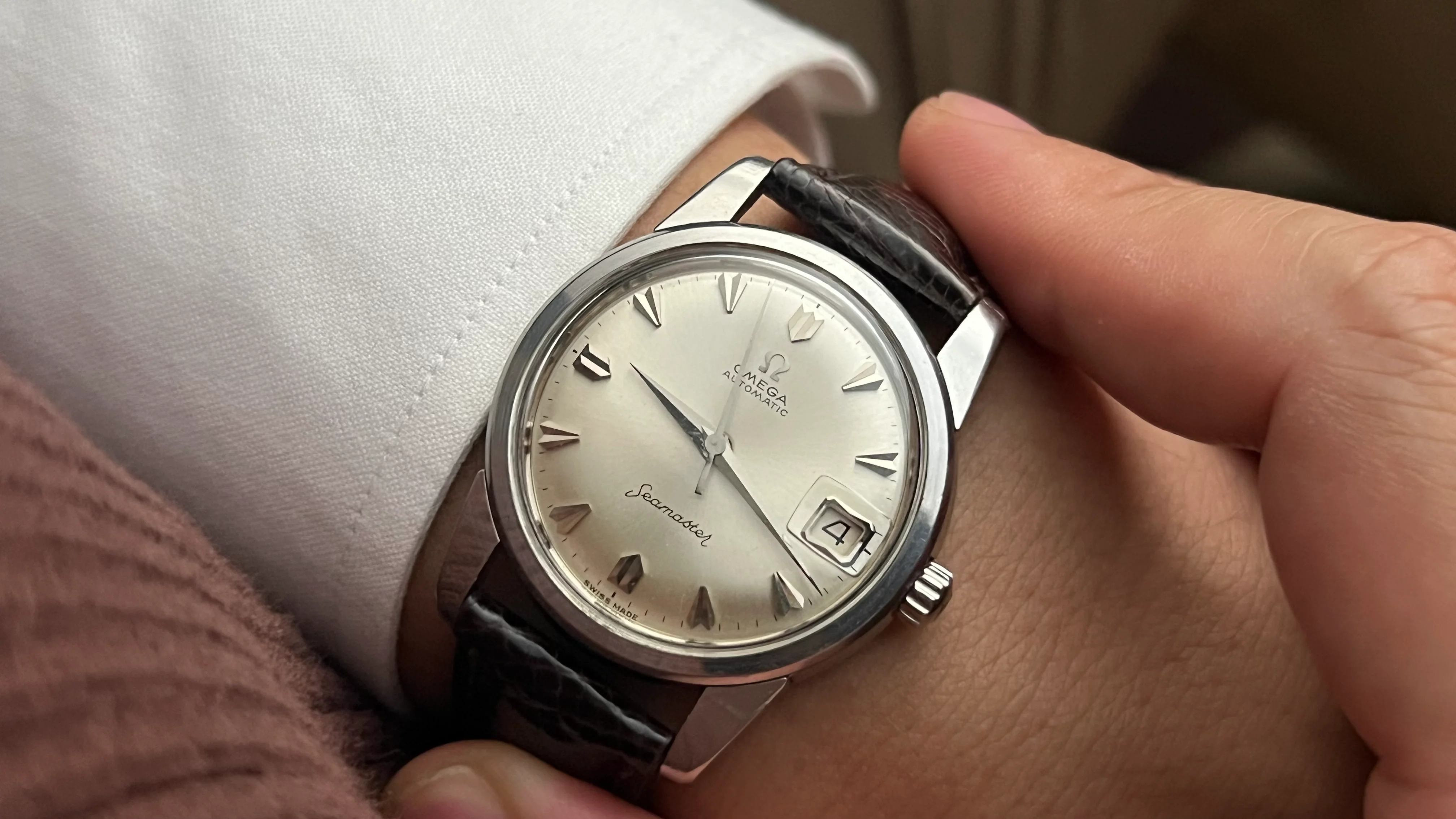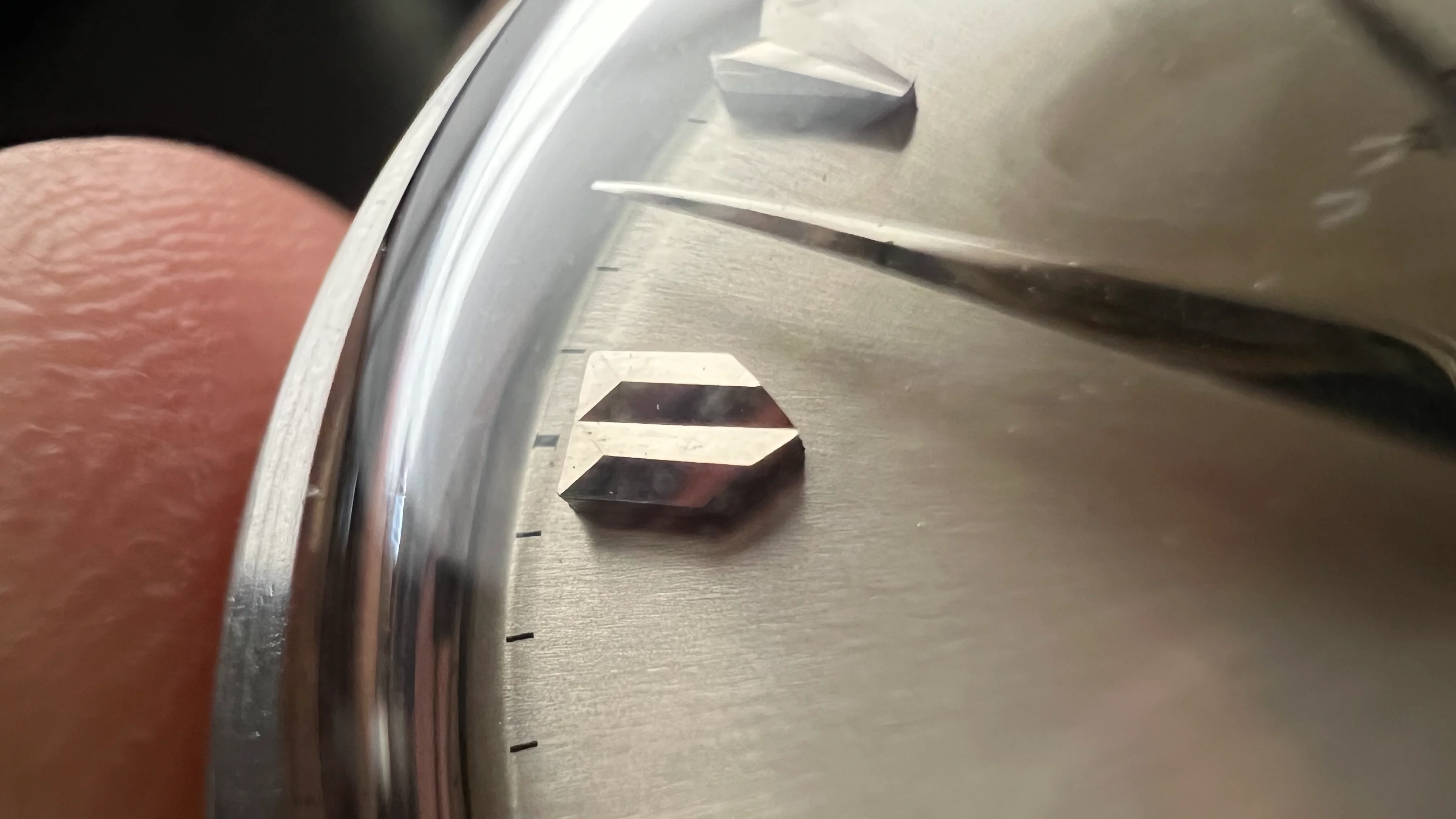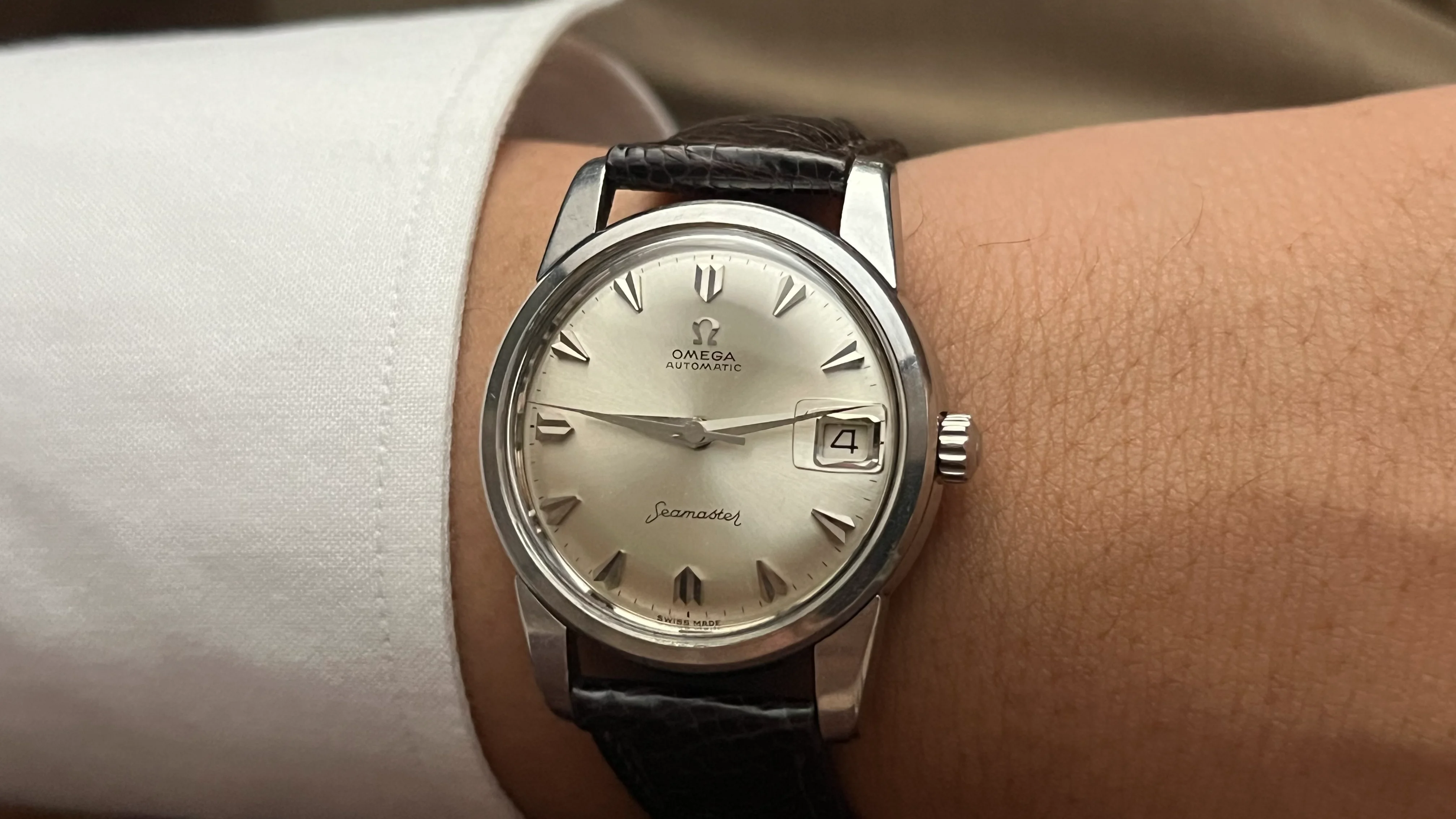 This one has an original silver sunburst dial with applied arrowhead markers, which is an uncommon dial variant for this reference. The dial is overall clean and attractive, with only a few tiny specks visible under close inspection.