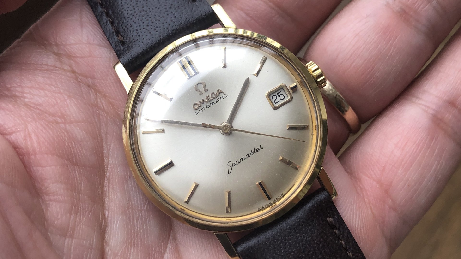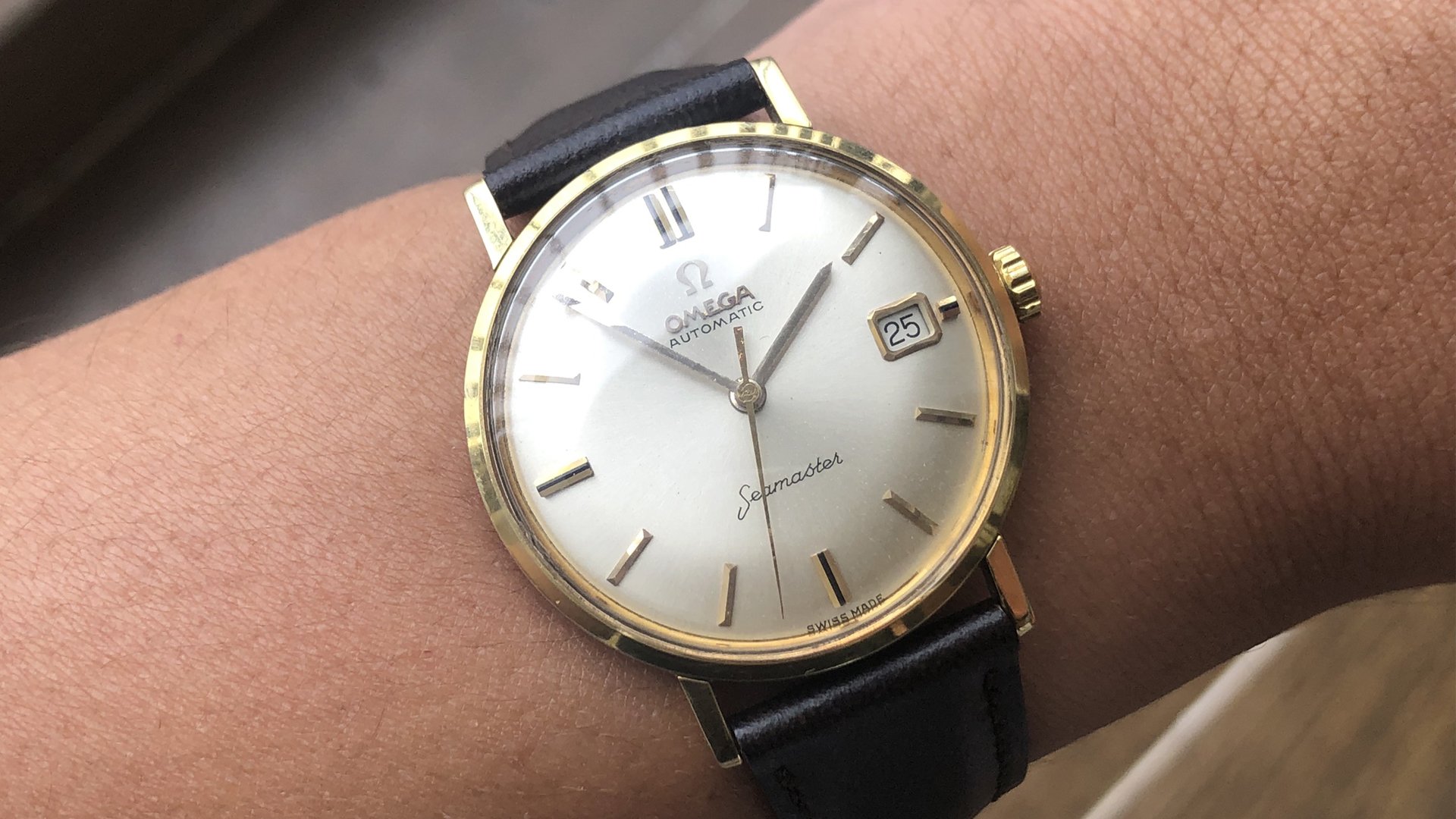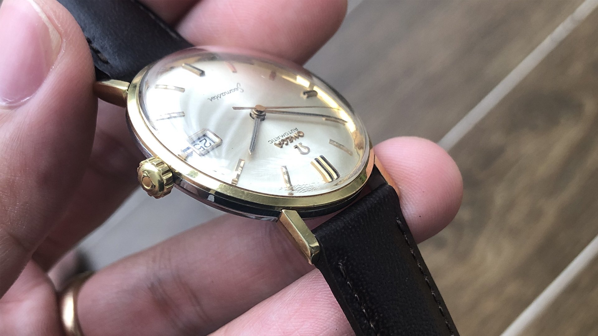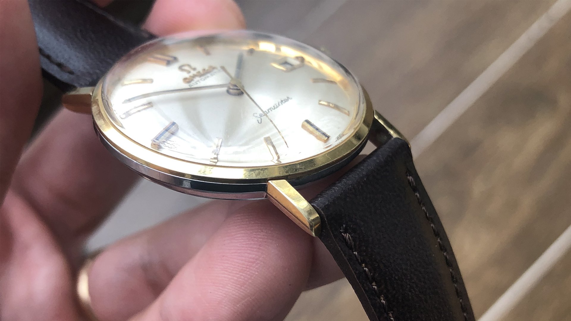 - Dial: The original dial is in very good condition, almost spotless. The markers are very unique, featuring gold markers combined with special 3-6-9-12 markers that have onyx inserts. It has the correct set of gold baton hands. Everything is combined so well; it's as dressy as a 60-year-old Omega can get.
