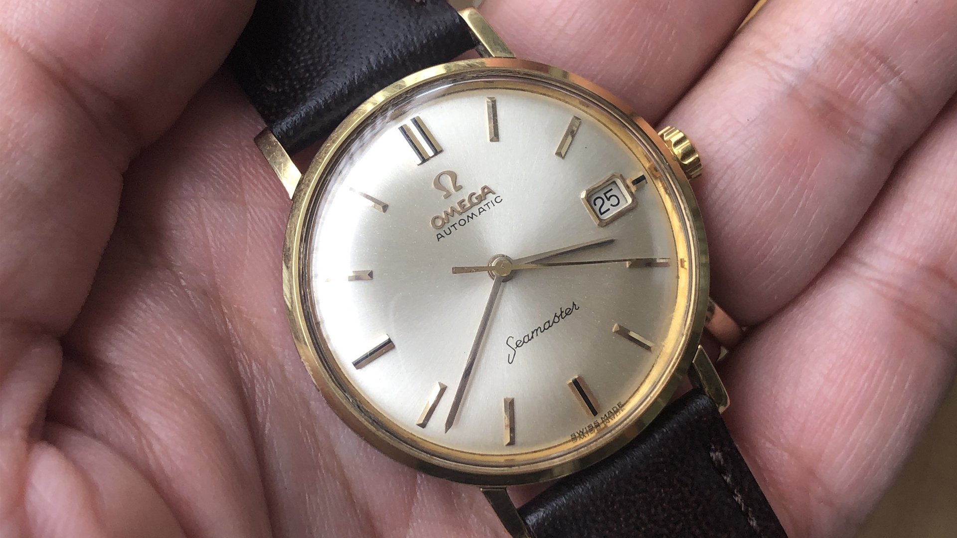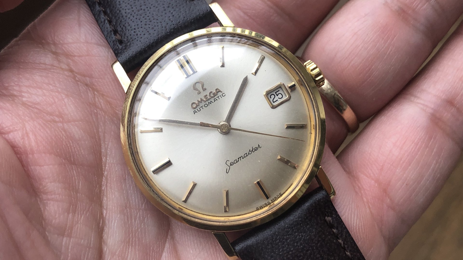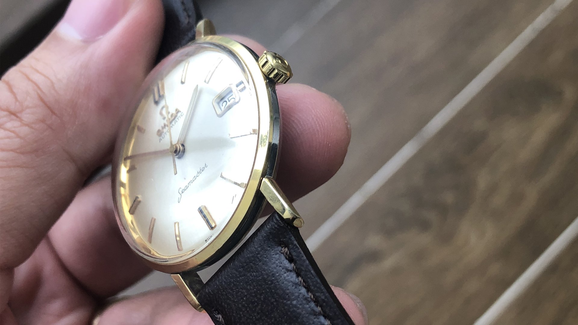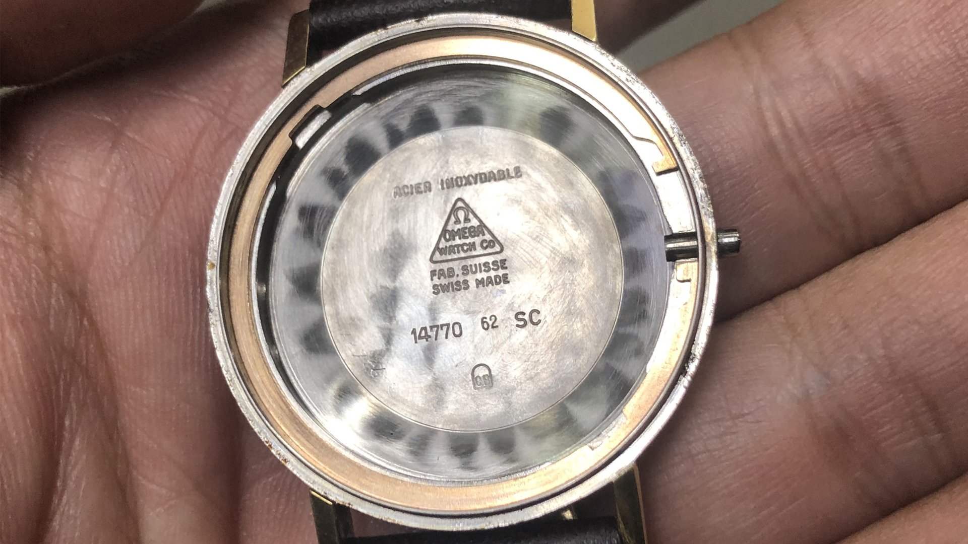 - Dial: The original dial is in very good condition, almost spotless. The markers are very unique, featuring gold markers combined with special 3-6-9-12 markers that have onyx inserts. It has the correct set of gold baton hands. Everything is combined so well; it's as dressy as a 60-year-old Omega can get.