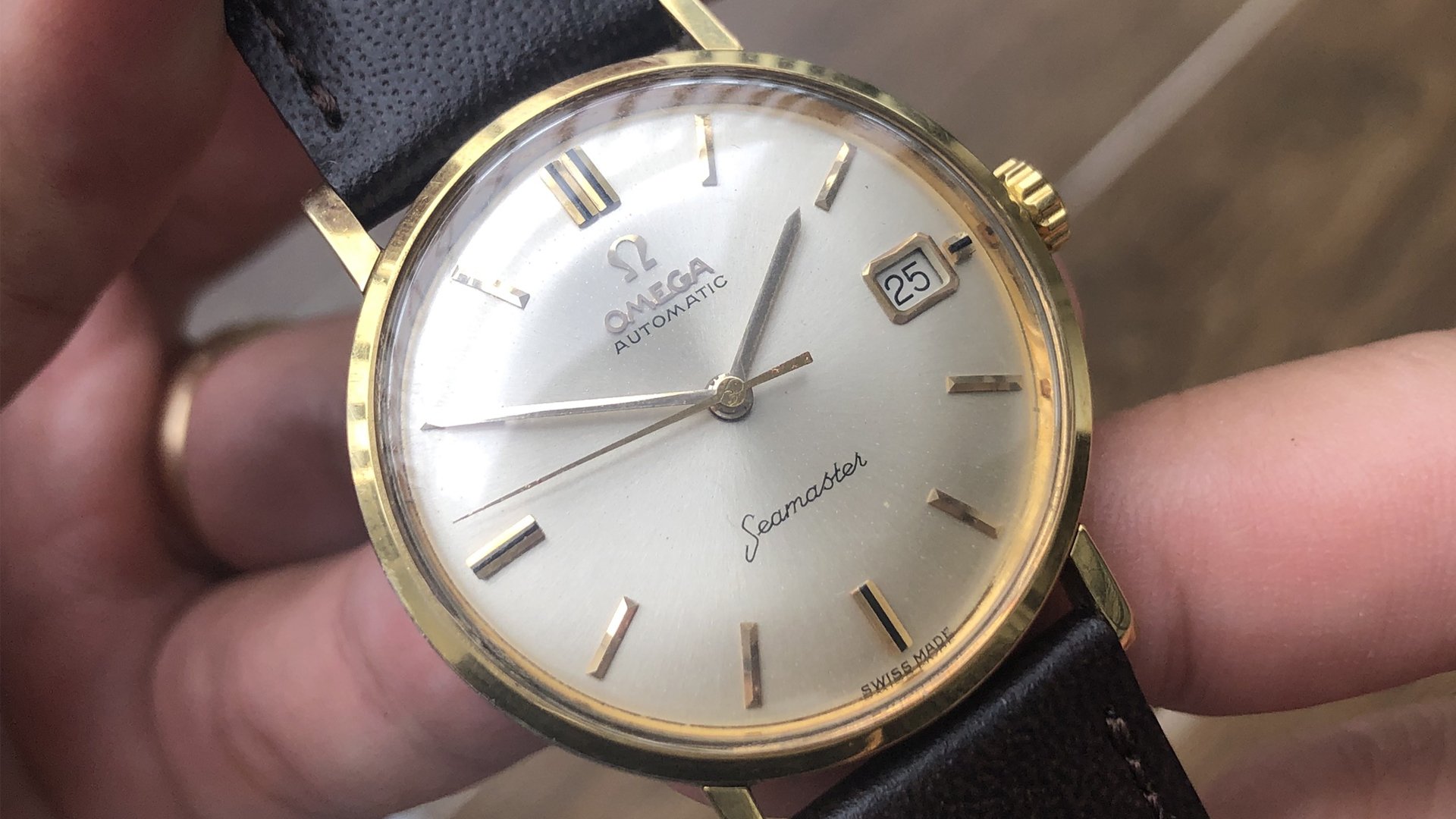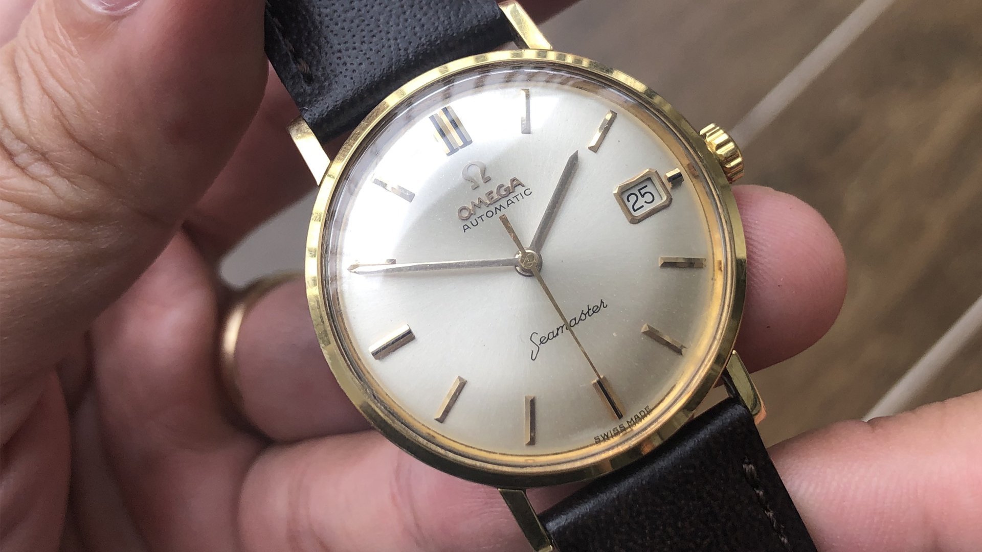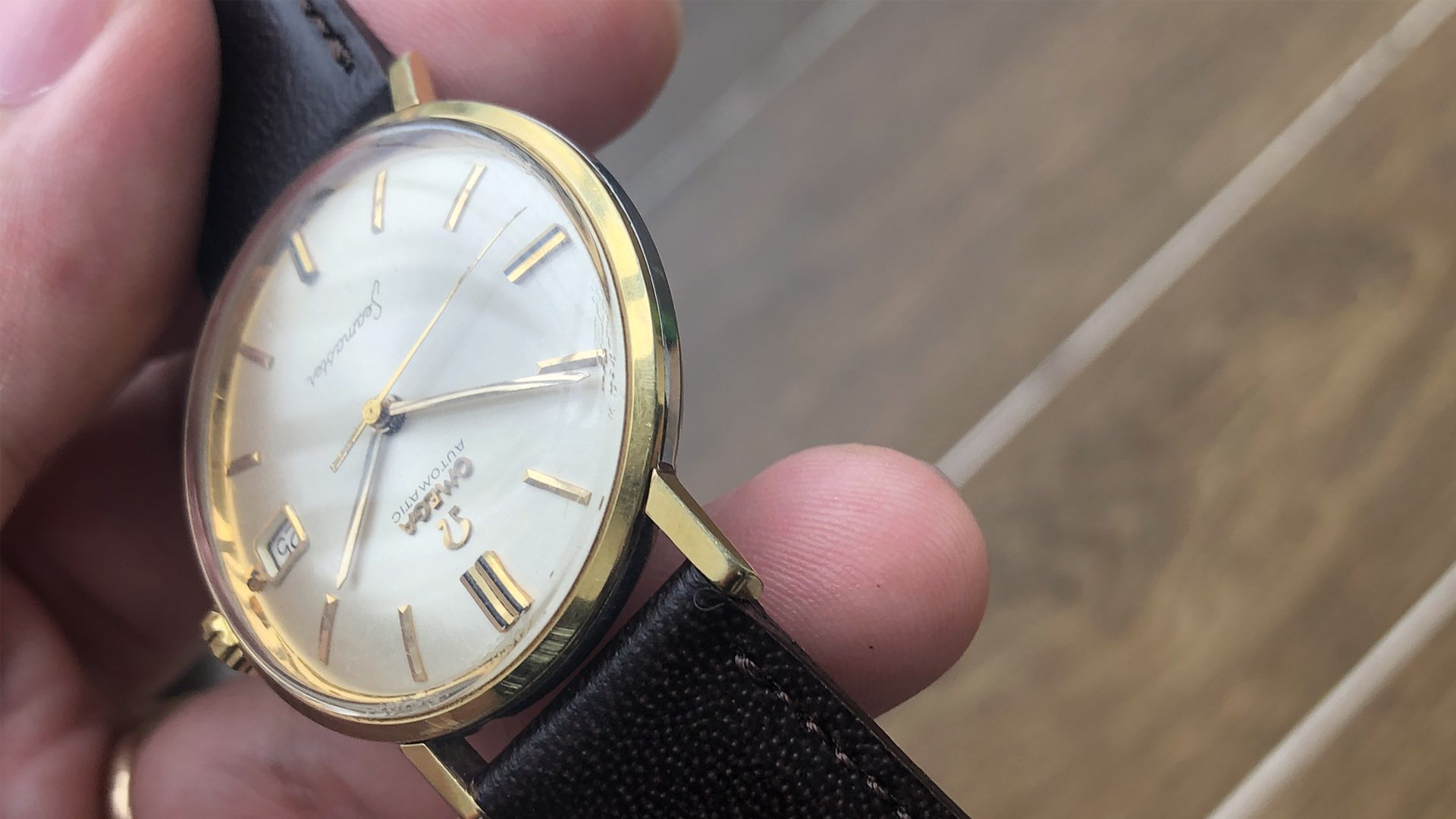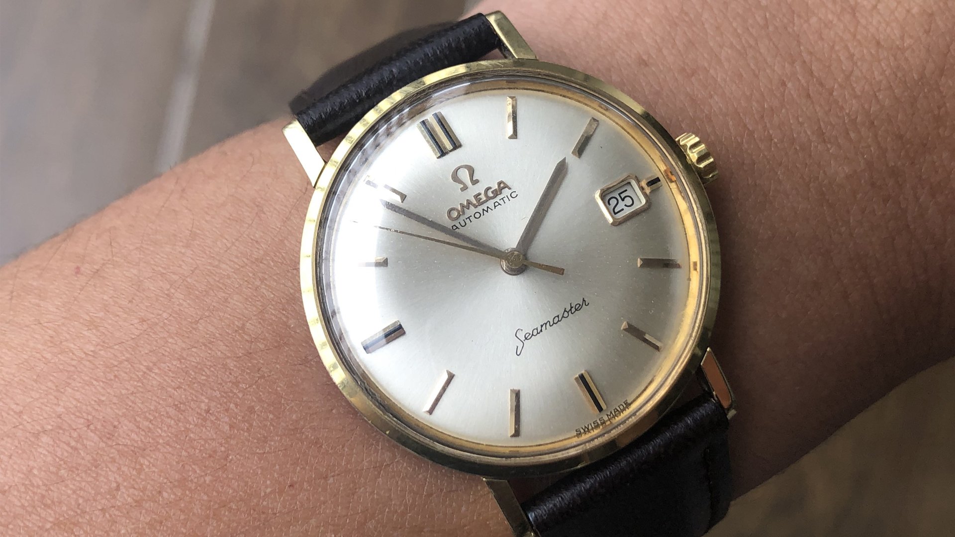 - Dial: The original dial is in very good condition, almost spotless. The markers are very unique, featuring gold markers combined with special 3-6-9-12 markers that have onyx inserts. It has the correct set of gold baton hands. Everything is combined so well; it's as dressy as a 60-year-old Omega can get.
