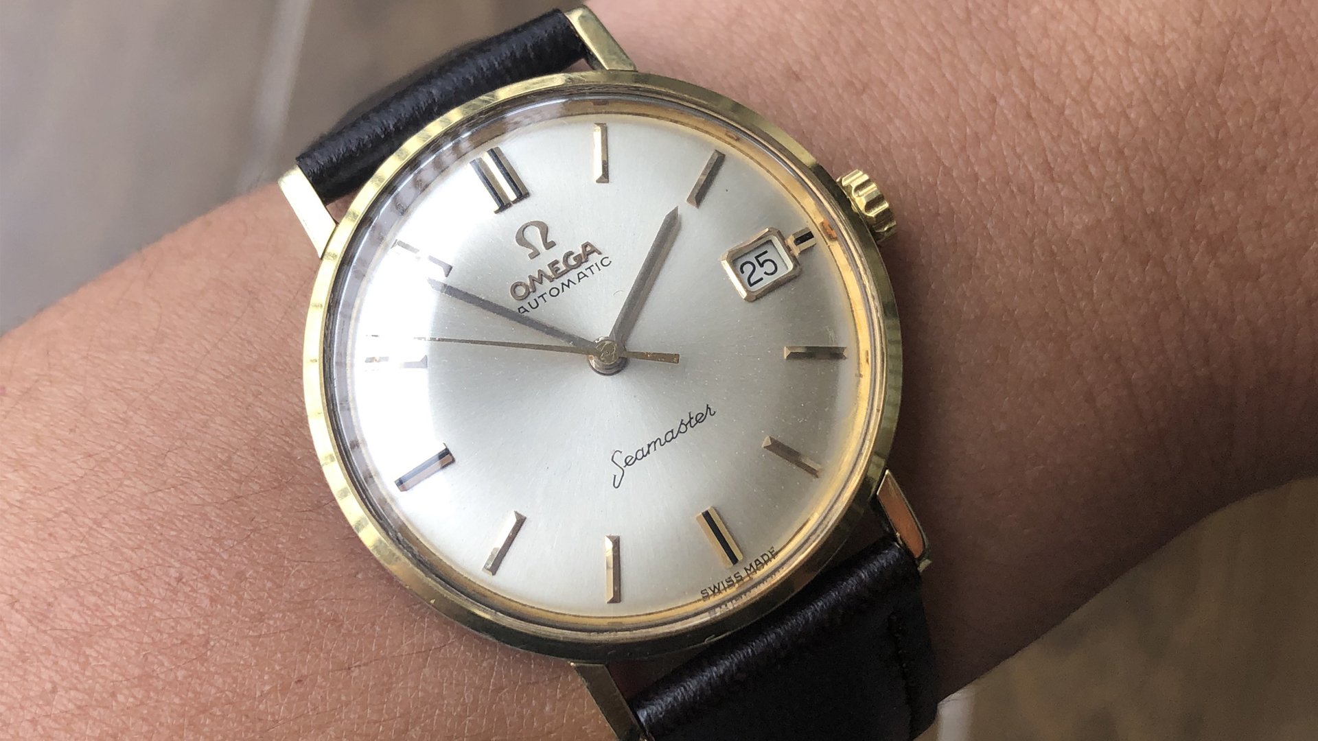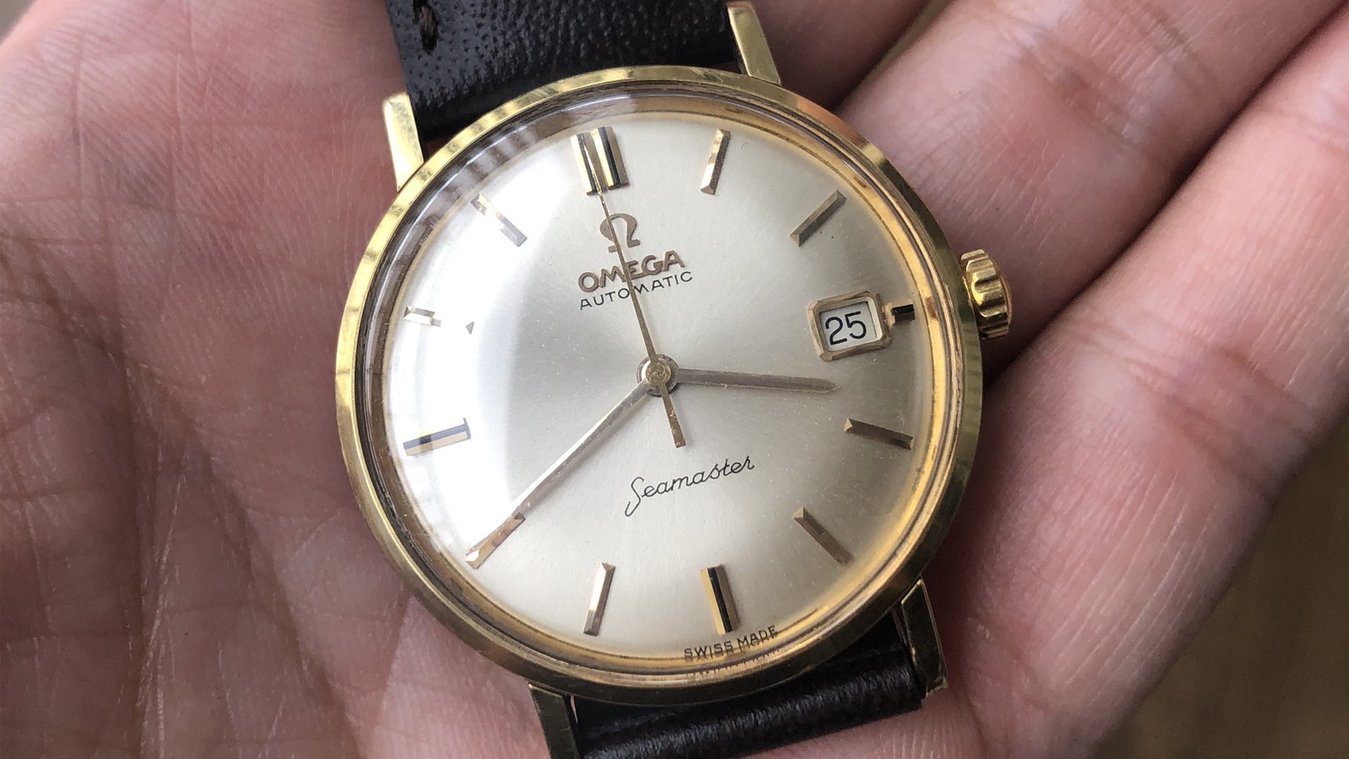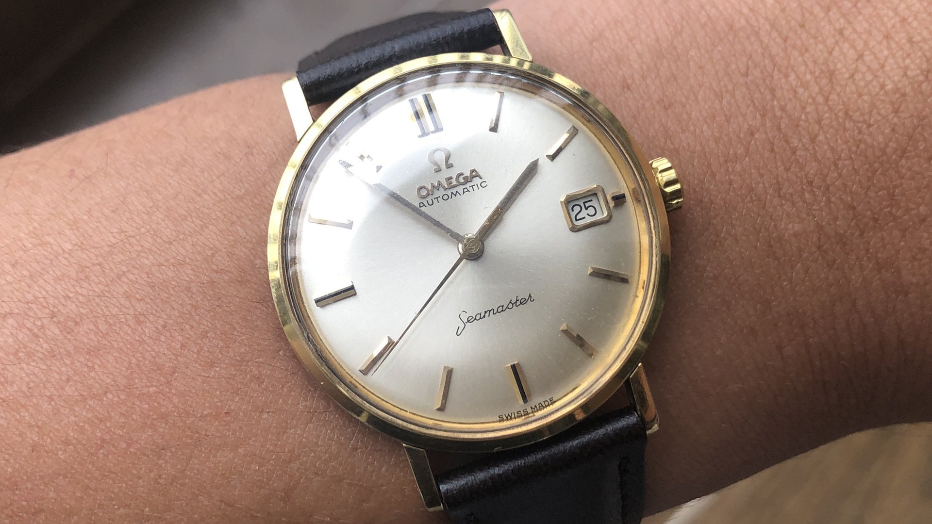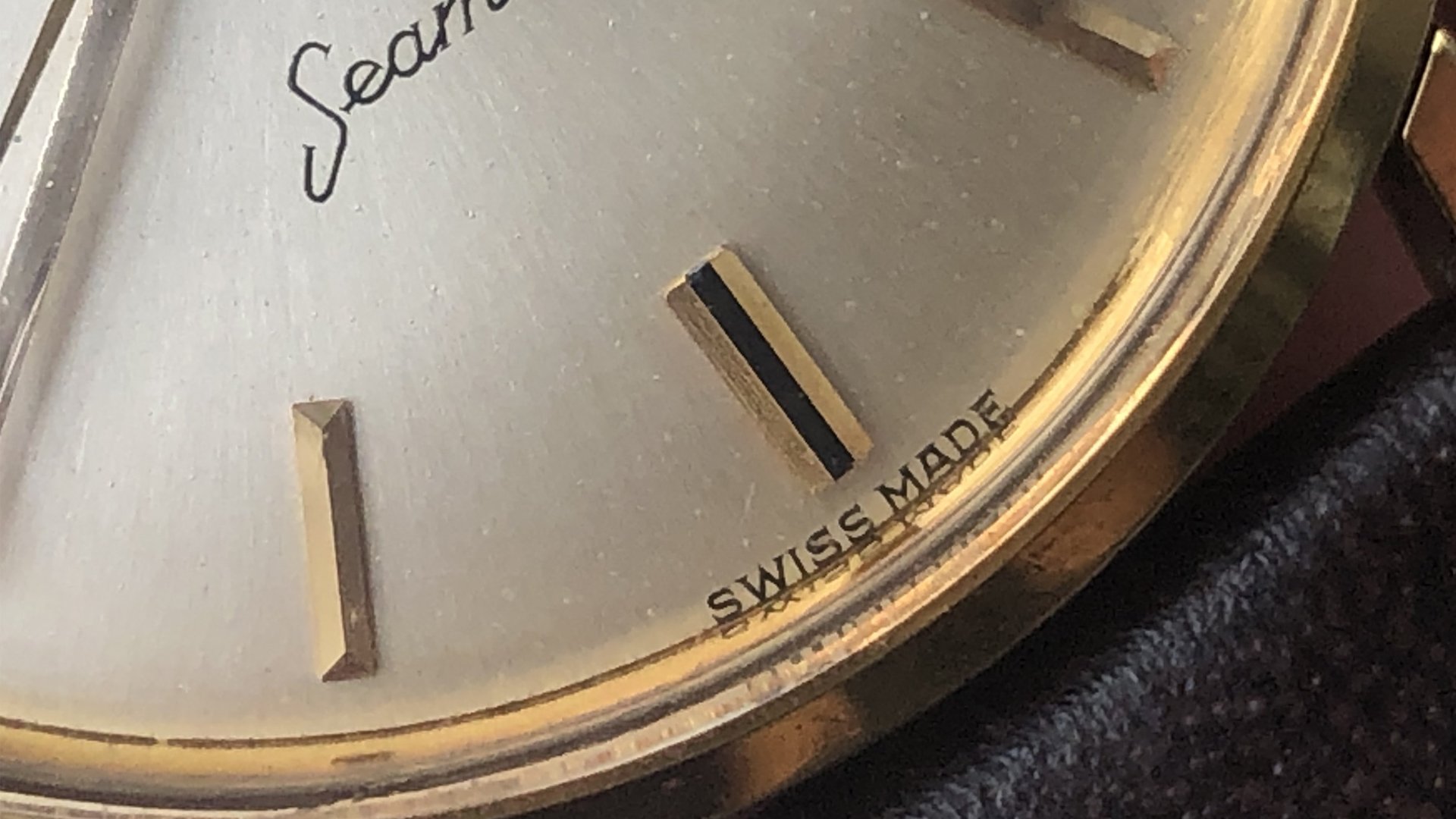 - Case: The 34.5mm gold-capped case over stainless steel is in good condition; the edges of the lugs are still visible. It may have been very lightly polished in the past. Again, the stick lug design brings a very nice vintage vibe to the watch.