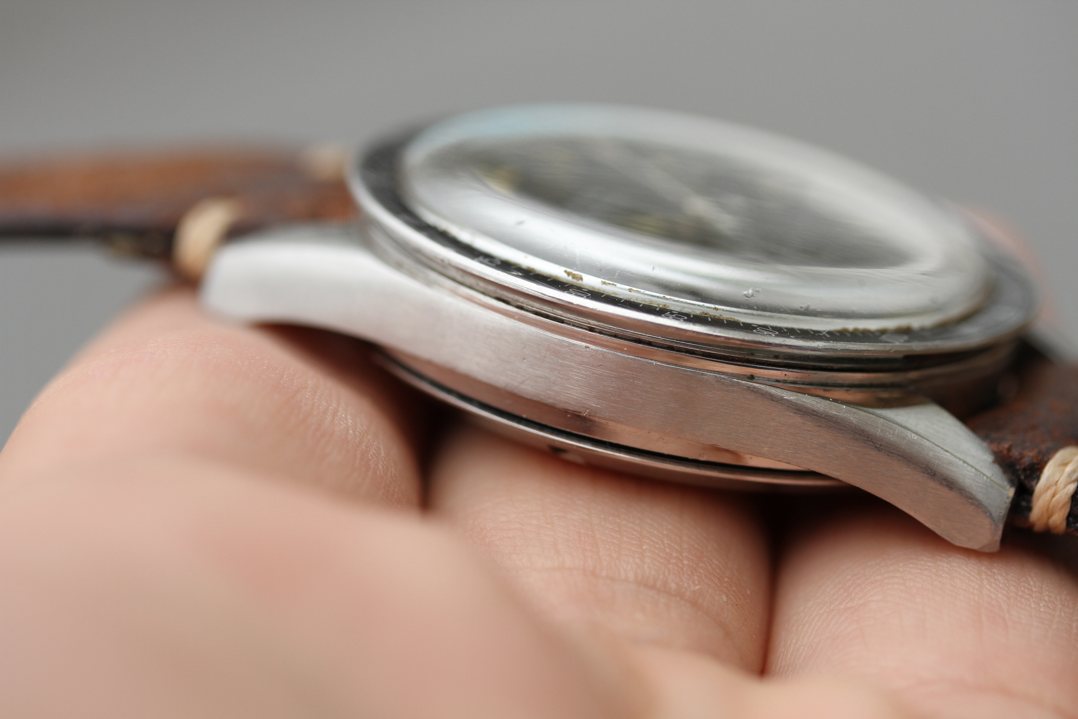 Excellent vintage condition case with no pitting, corrosion or deep scratches. Original chamfers still evident on lugs. Skinny logo crown is period correct with small pushers.