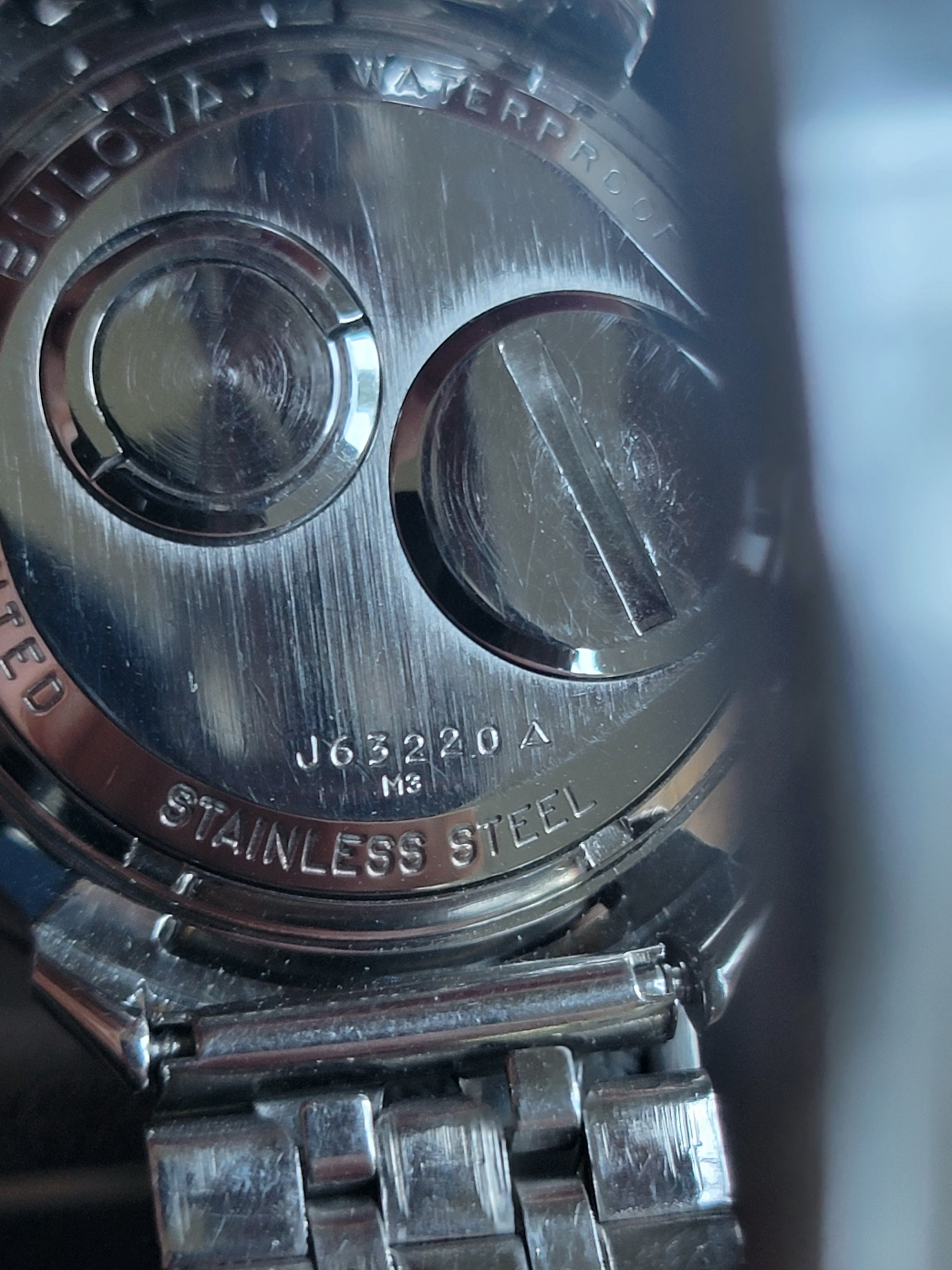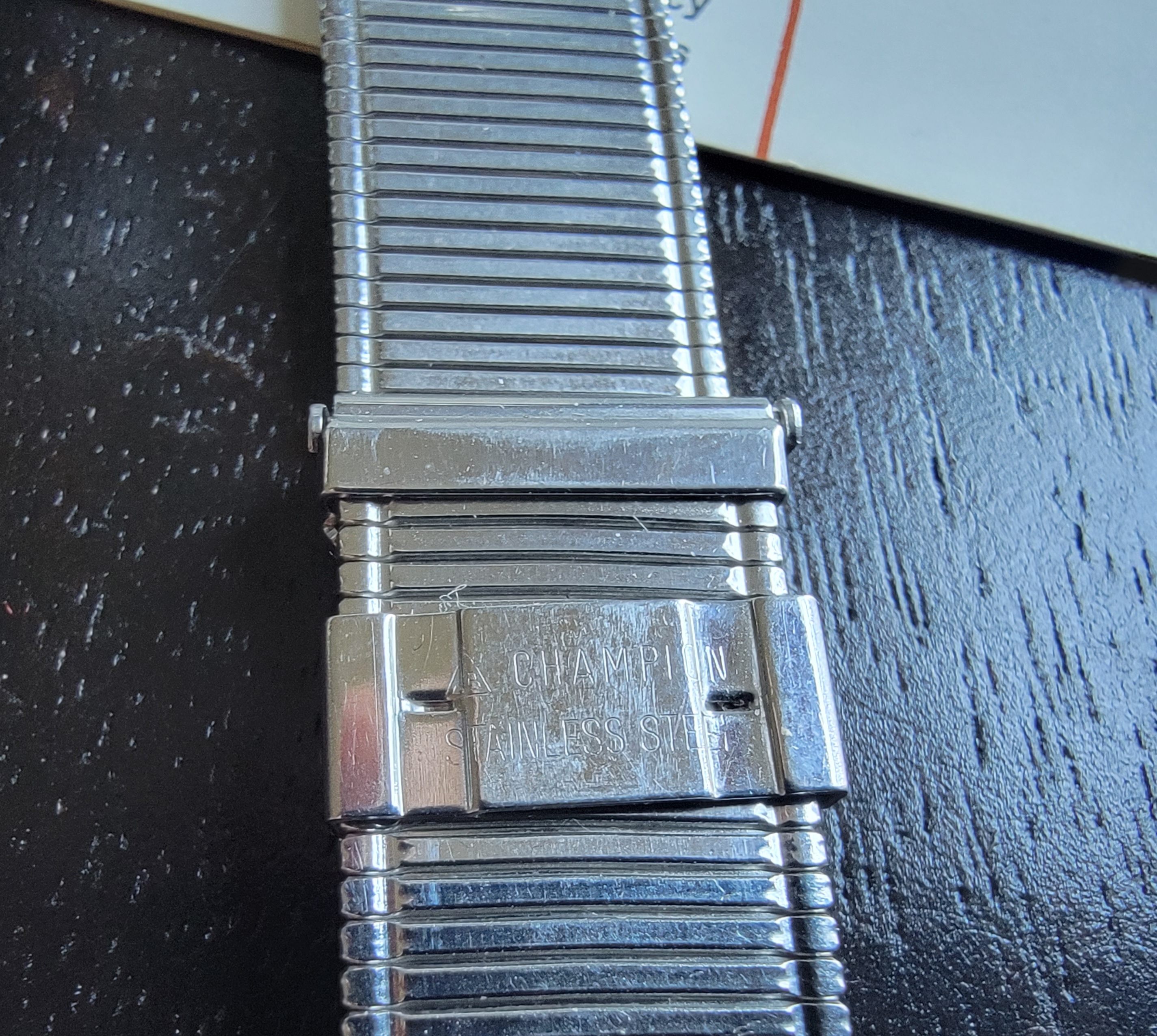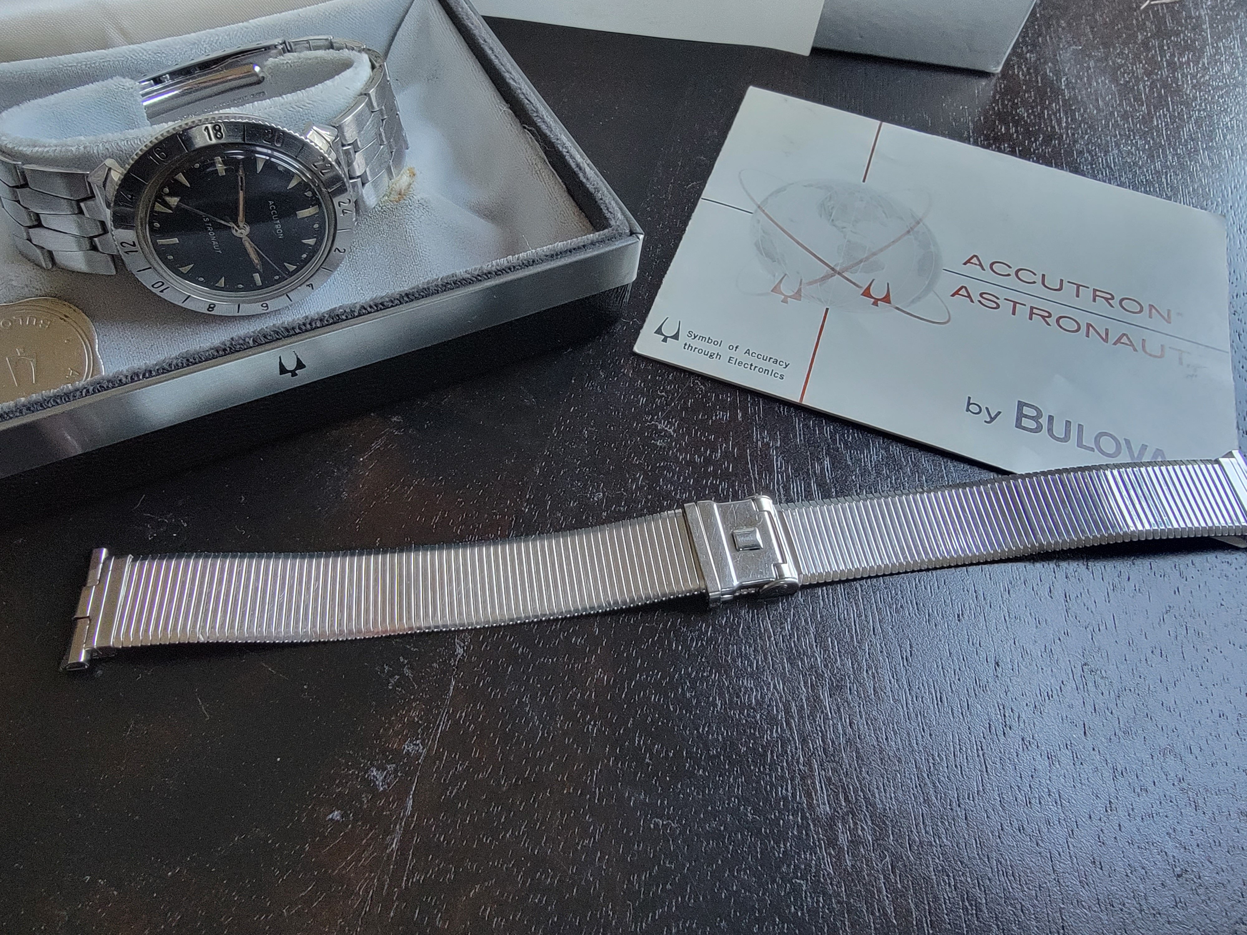 Includes extra vintage Champion Komfit bracelet. The watch is on a coffin bracelet that is not original to the watch. The bracelet is marked Hong Kong, which was not delivered by Bulova on 1963 Astronauts, although the 1963 Astronaut did come with coffin style bracelets.