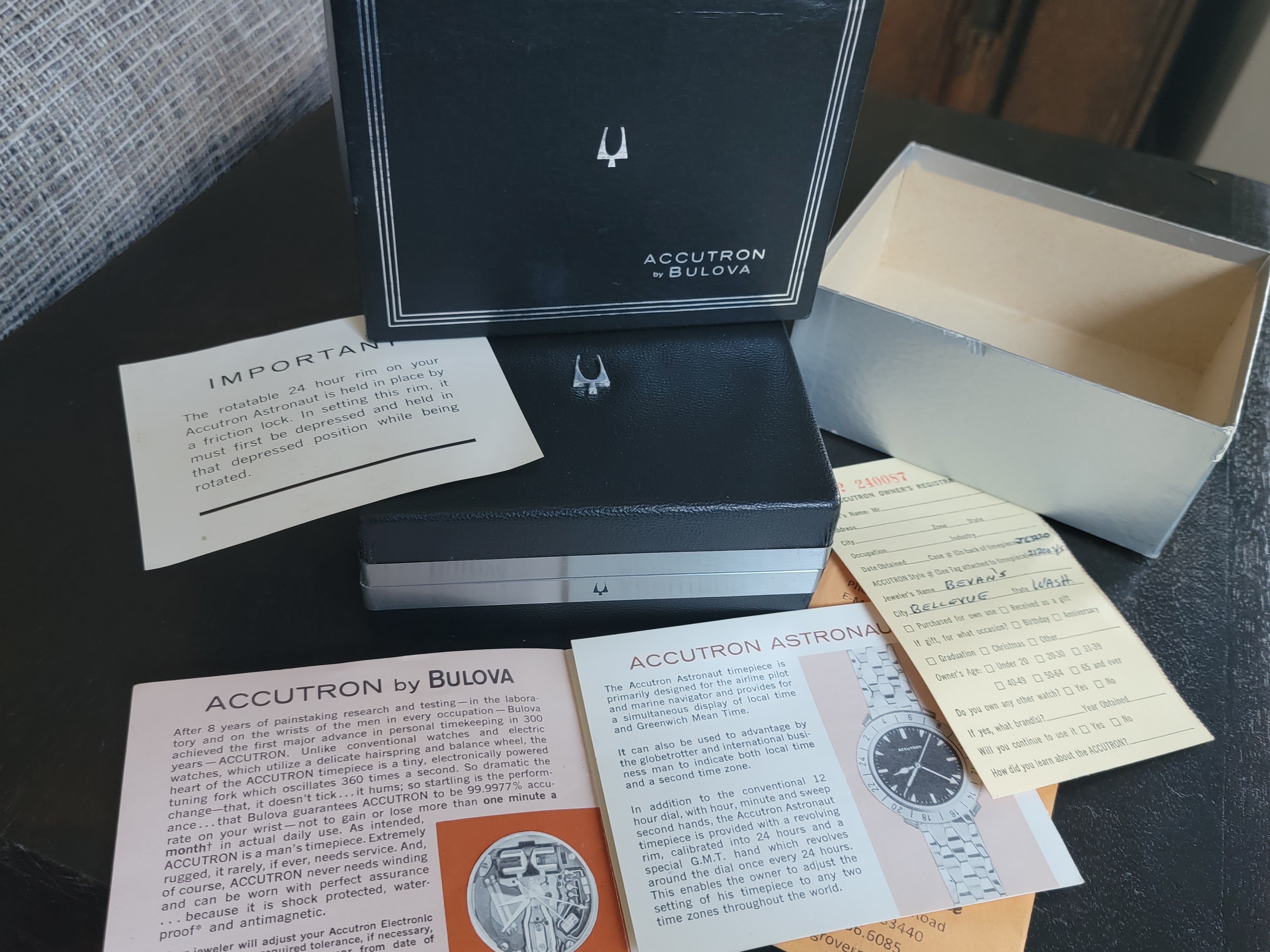 ··"I cut it TWICE and it's still short!"1963 (M3) Accutron Astronaut with box and some papers, including registration card.