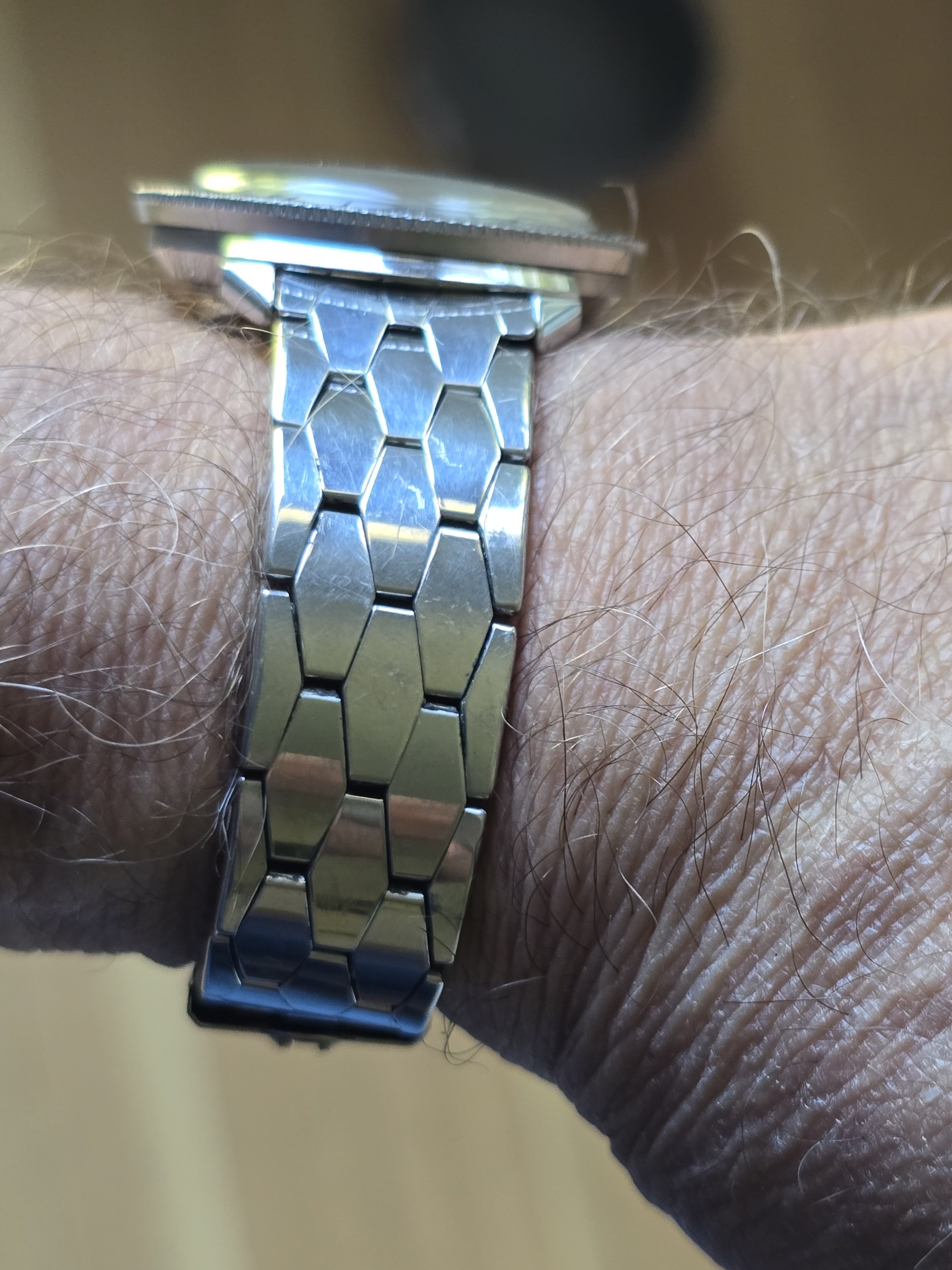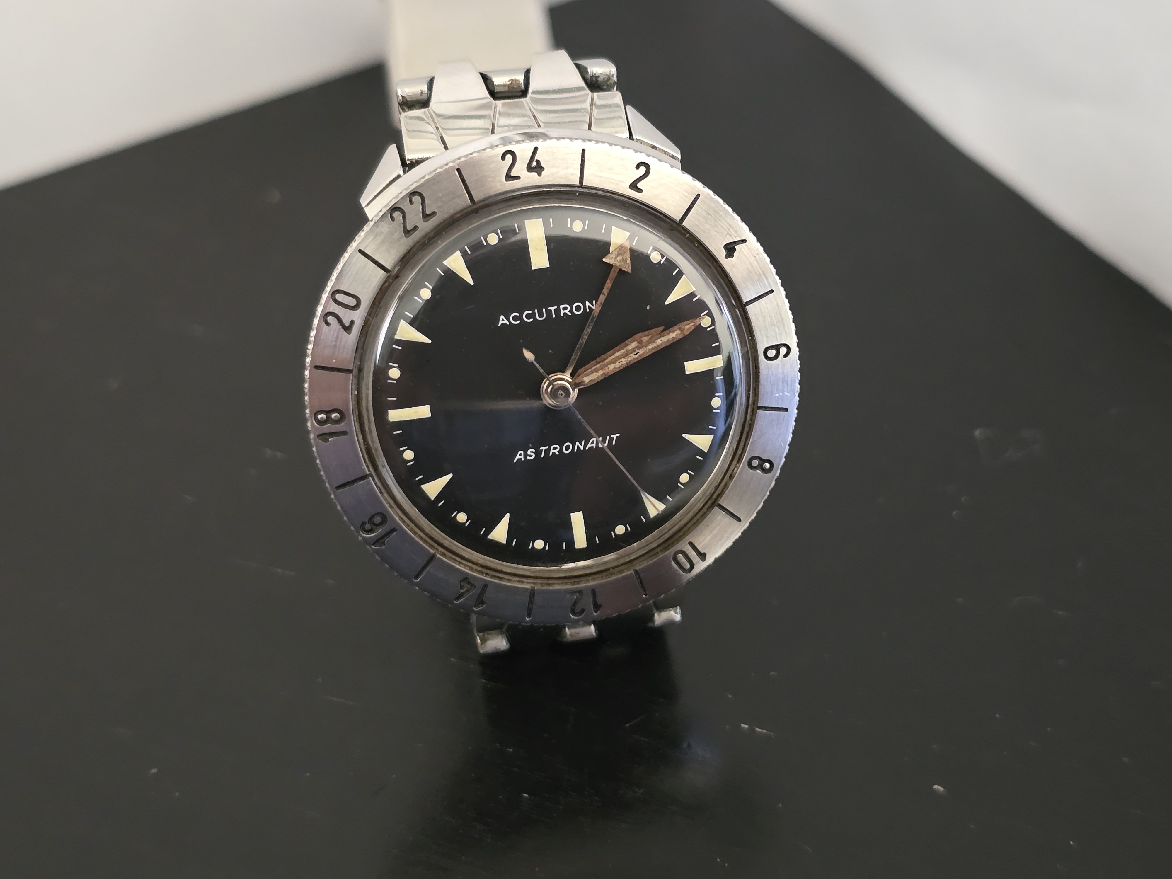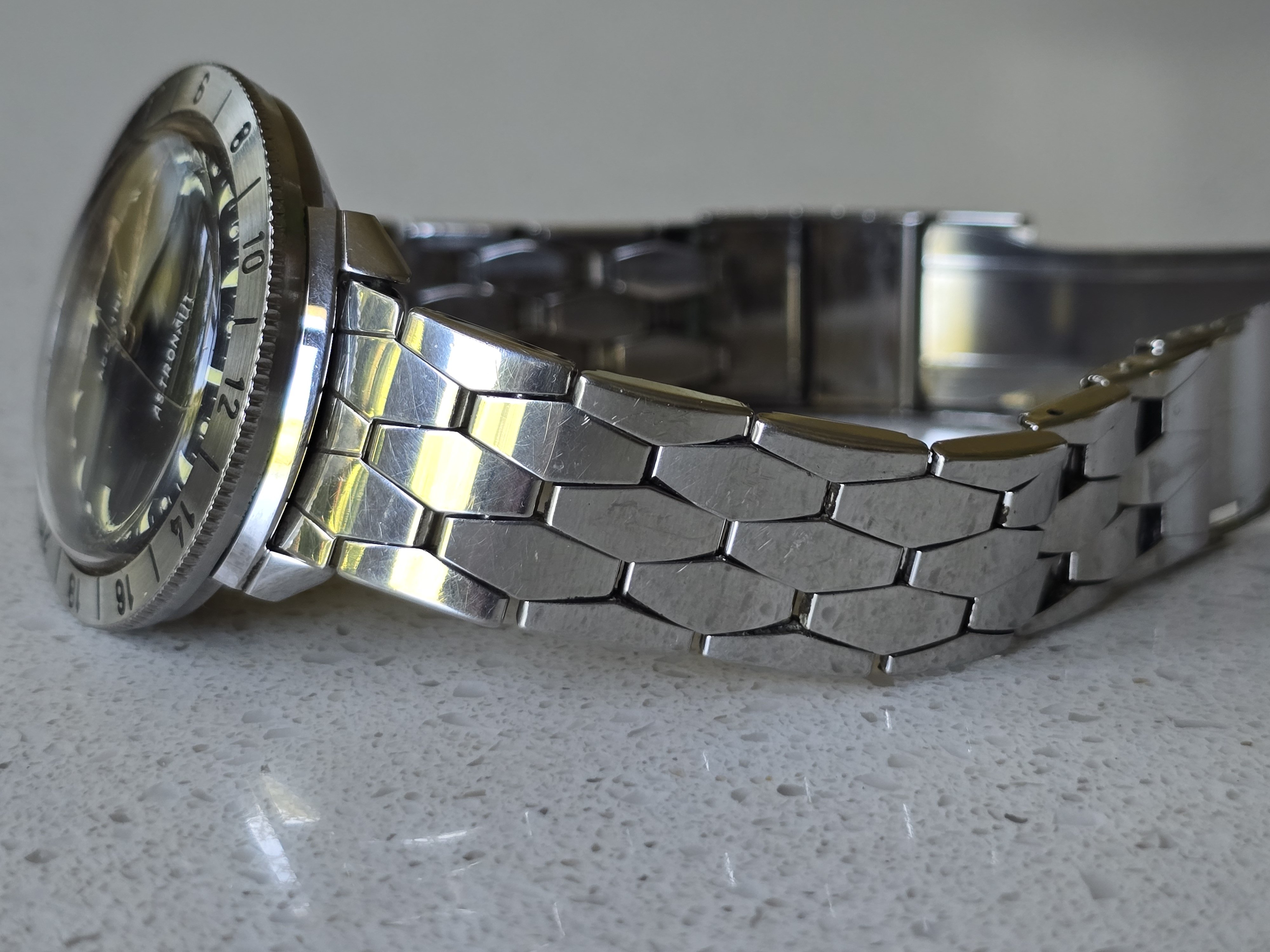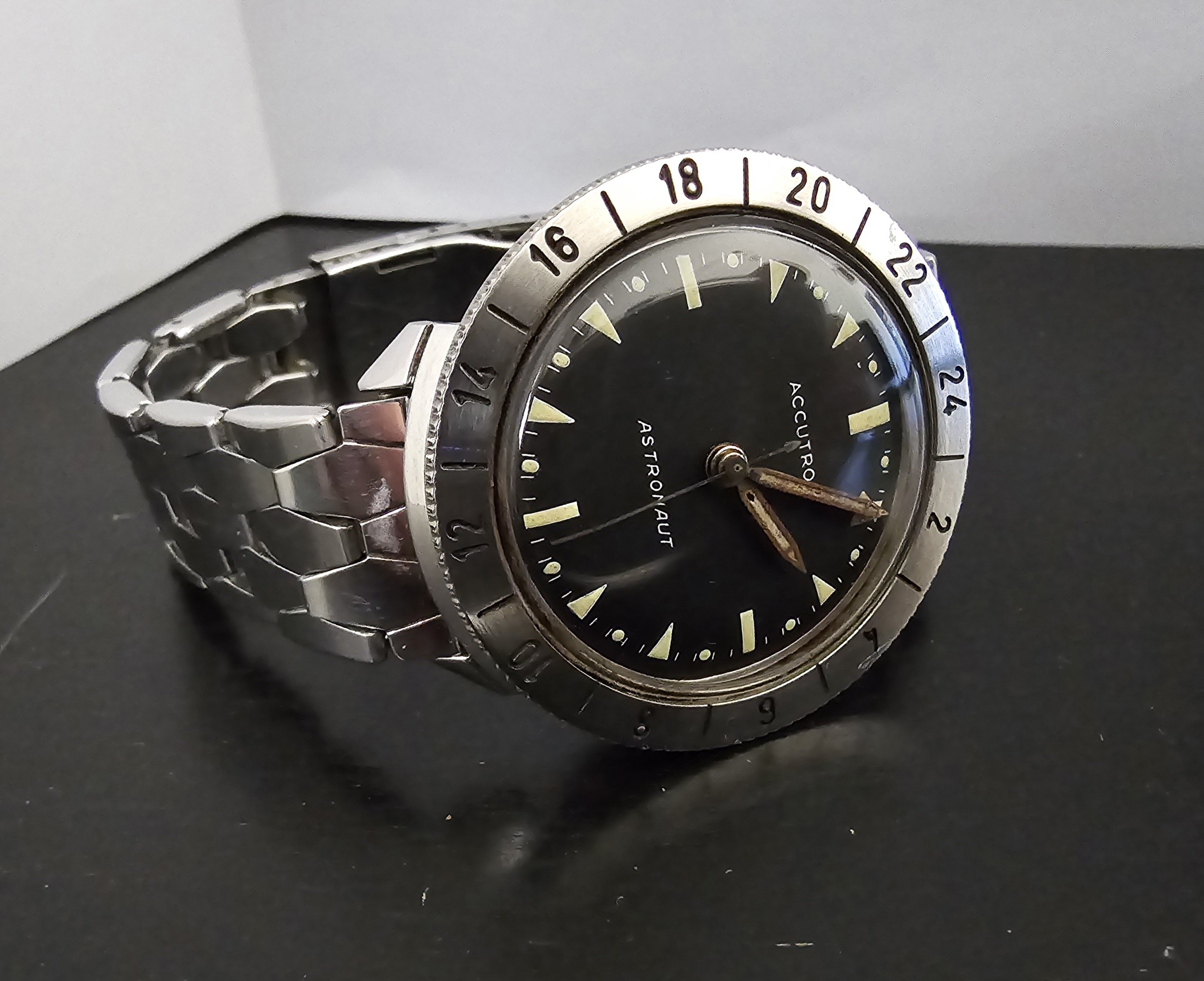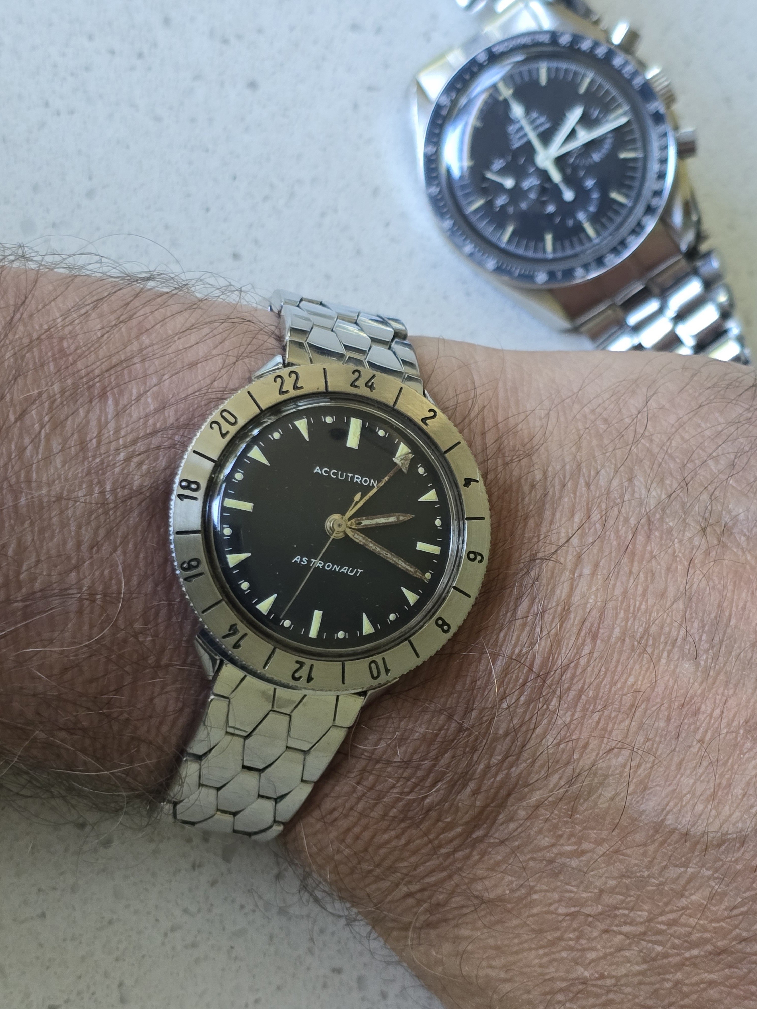 "My Dad was very much into all things space and space related. At the time he wore this watch he worked for Western Union in their new telegraph and telecommunication department in New York City. He was privileged enough to meet several astronauts there over the years including Scott Carpenter, Wally Schirra and John Glenn. When he met John Glenn he was wearing his Breitling Cosmonaute that he ended up wearing into space. He was interested and commented on my Dad's watch." [Note that he may have confused John Glenn with Scott Carpenter, but I thought it impolite to mention it.]