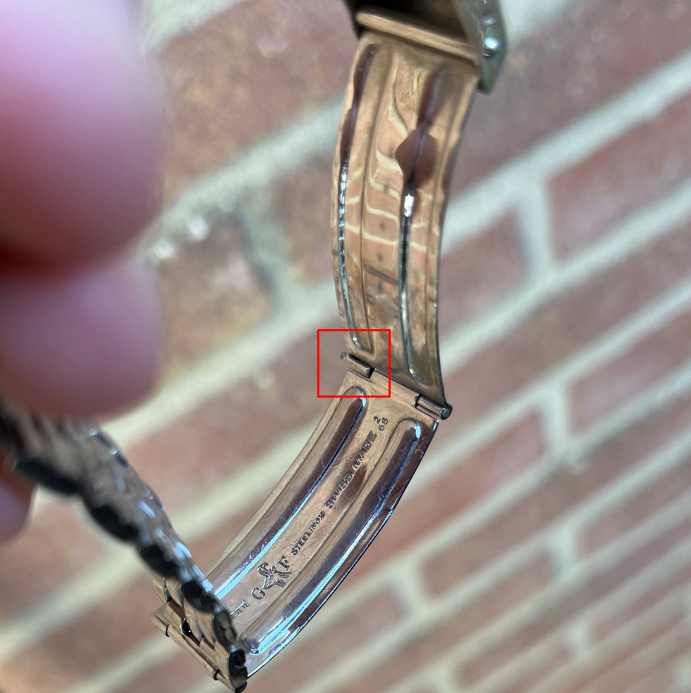 The part of the pin marked in red is missing. The clasp holds on the end. Nothing your local goldsmith or watchmaker couldn't handle.