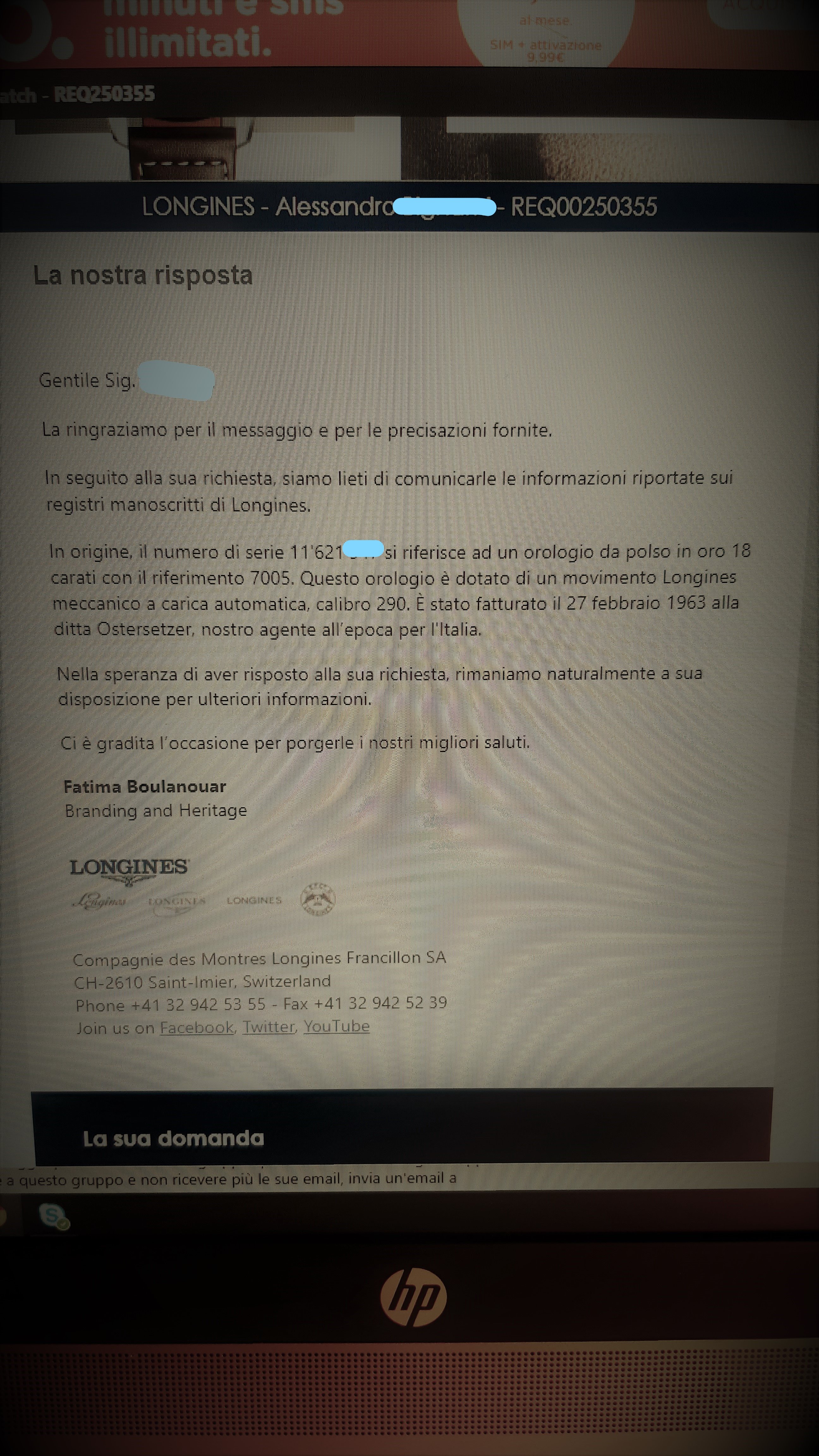 Included in the sale there is an extract from Longines declaring the watch being invoiced to Italy on february, 27th 1963.