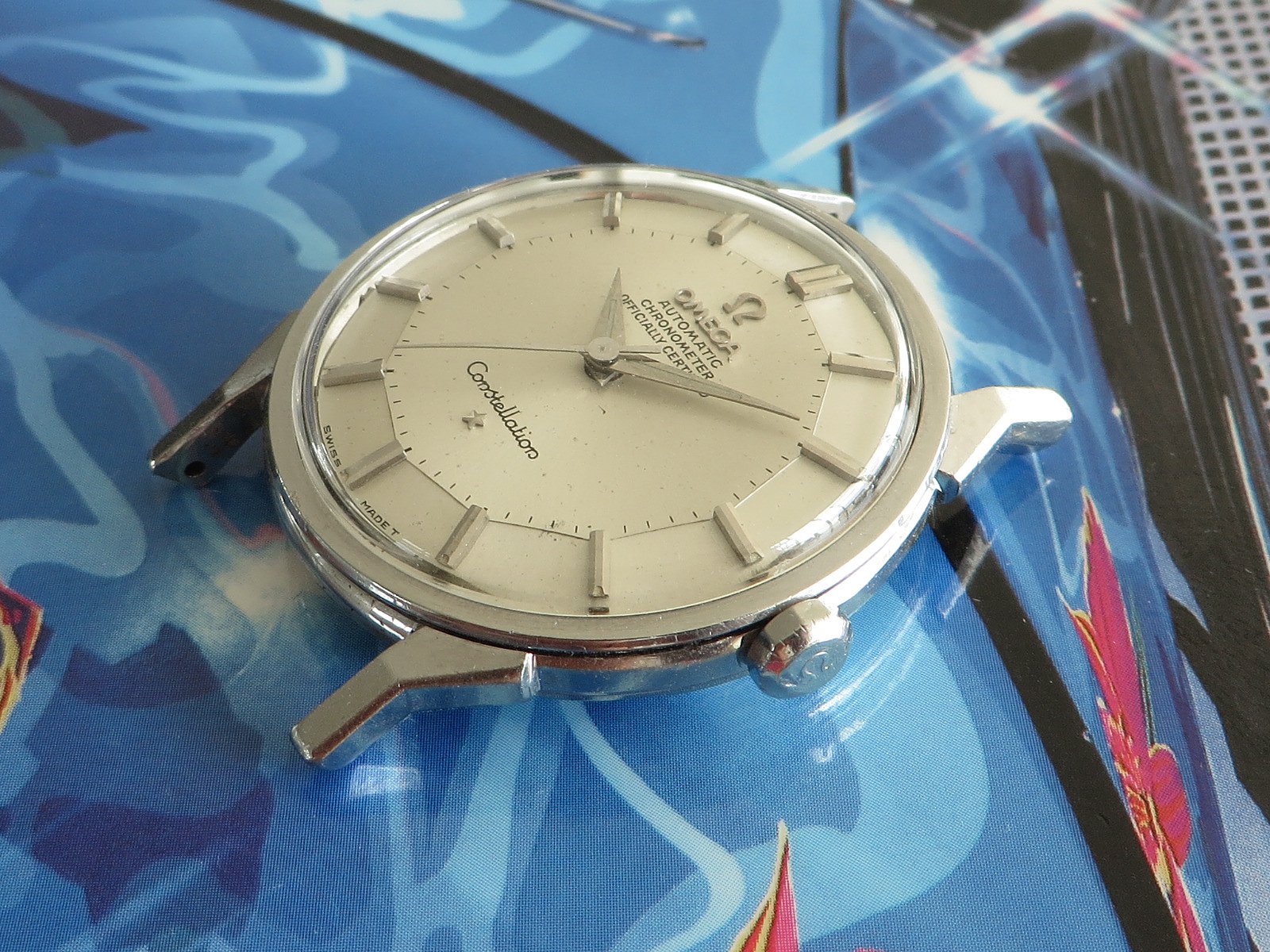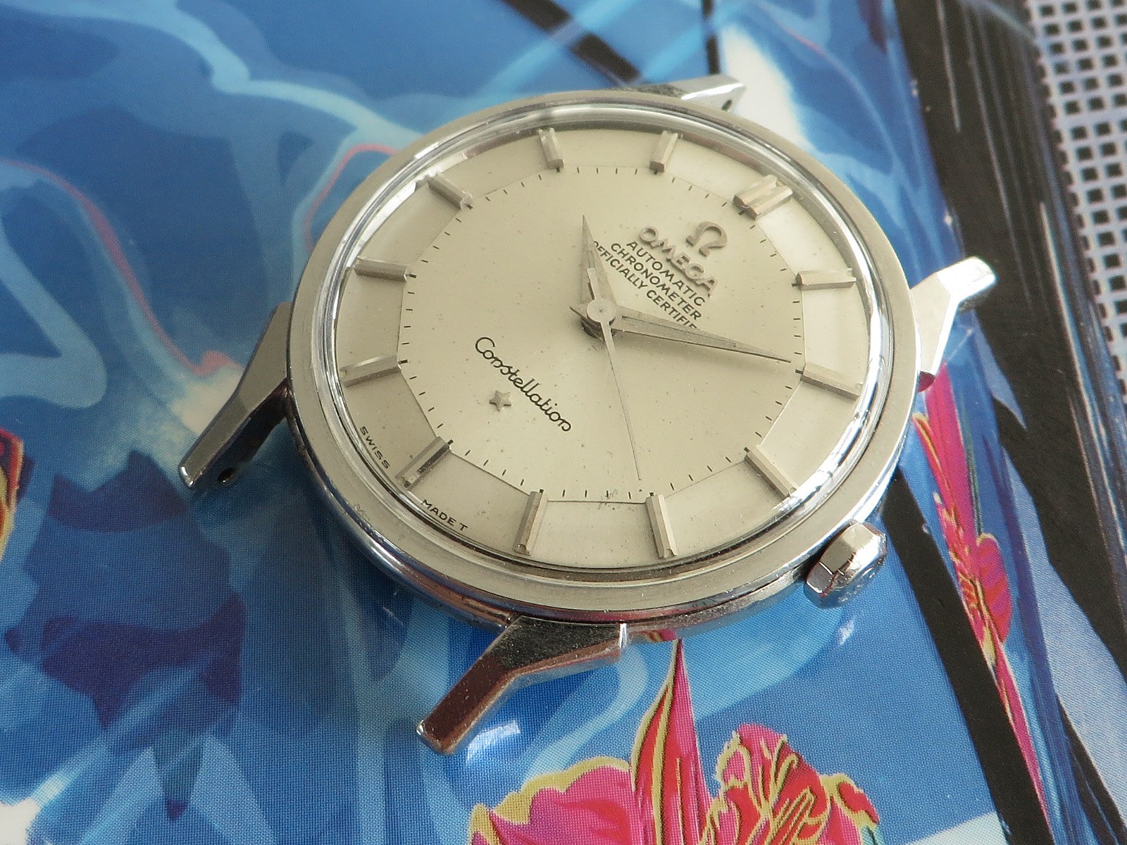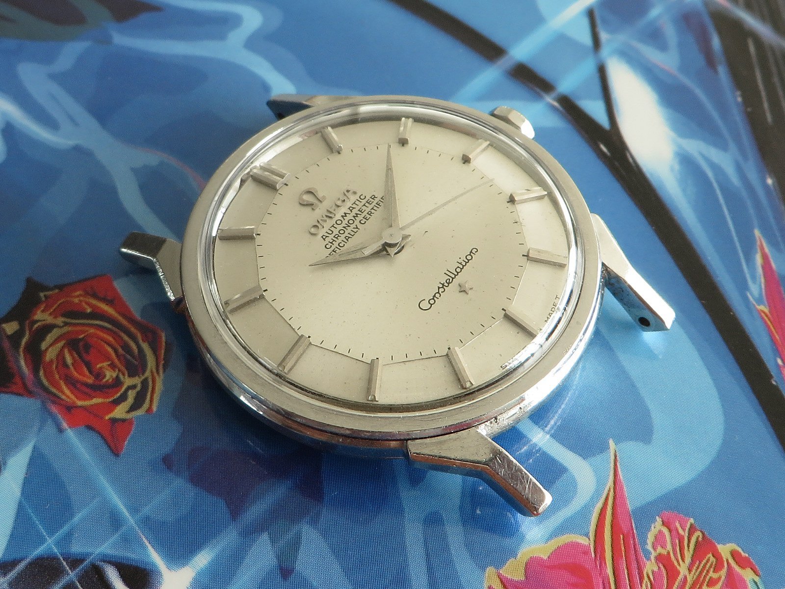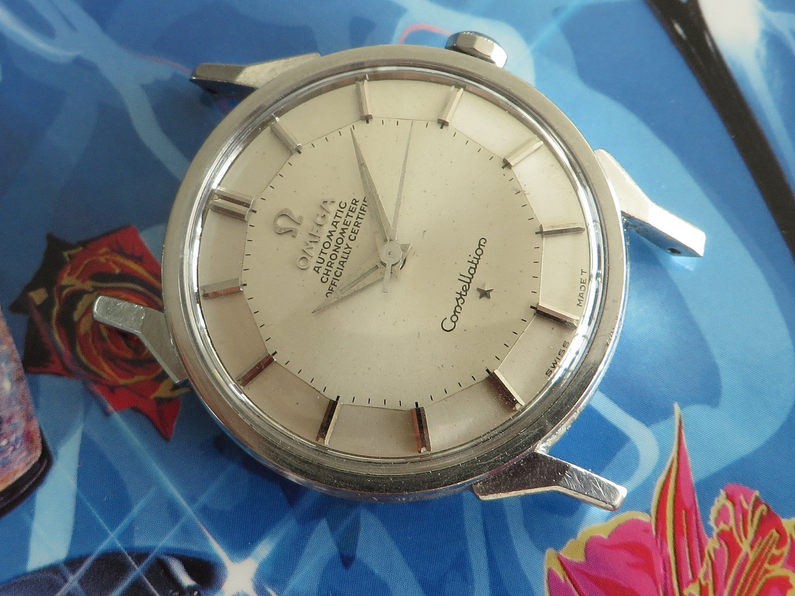 All stainless steel screw back case with distinctive dog leg lugs, correct original signed crown and observatory medallion on the back. Some minor pitting between the lower lugs, but does not appear to have been polished, shows wear from honest use, not a show piece but a very wearable classic Constellation.