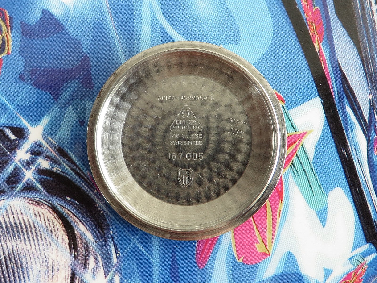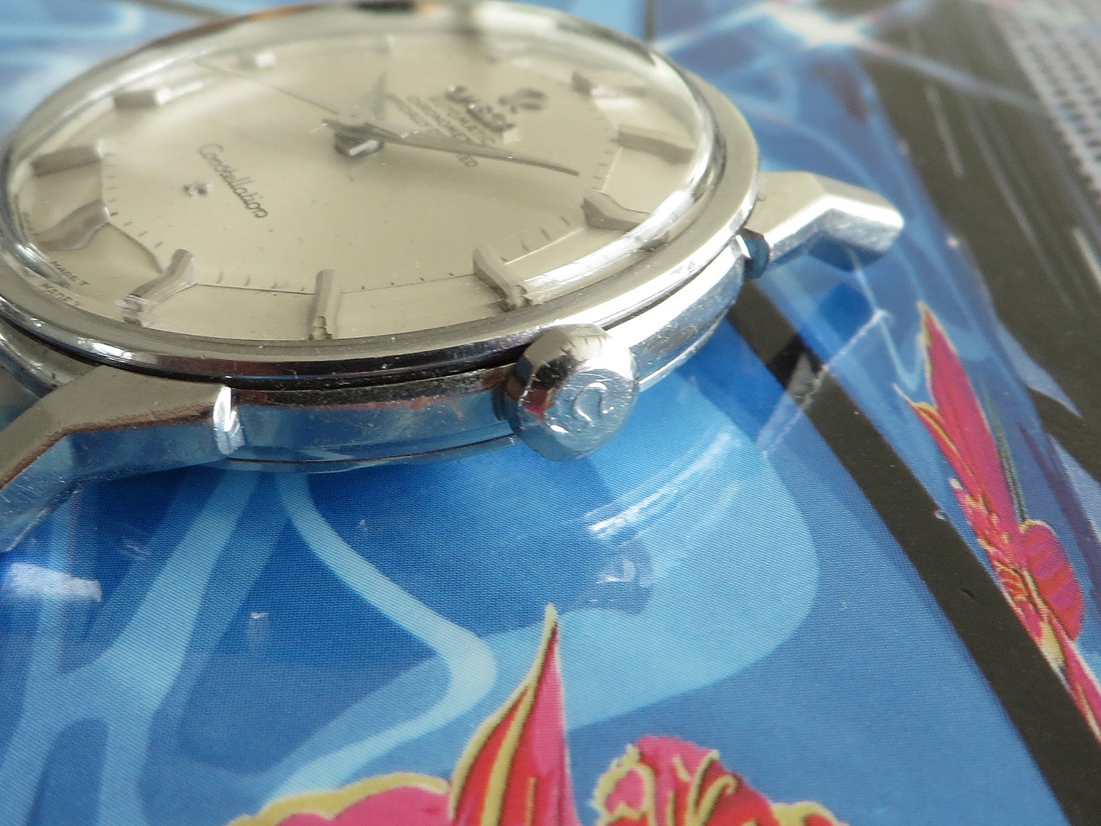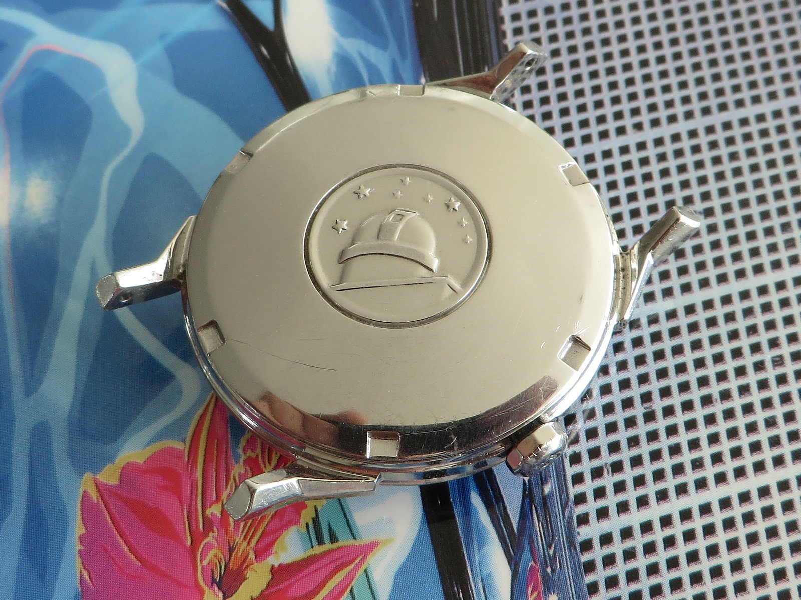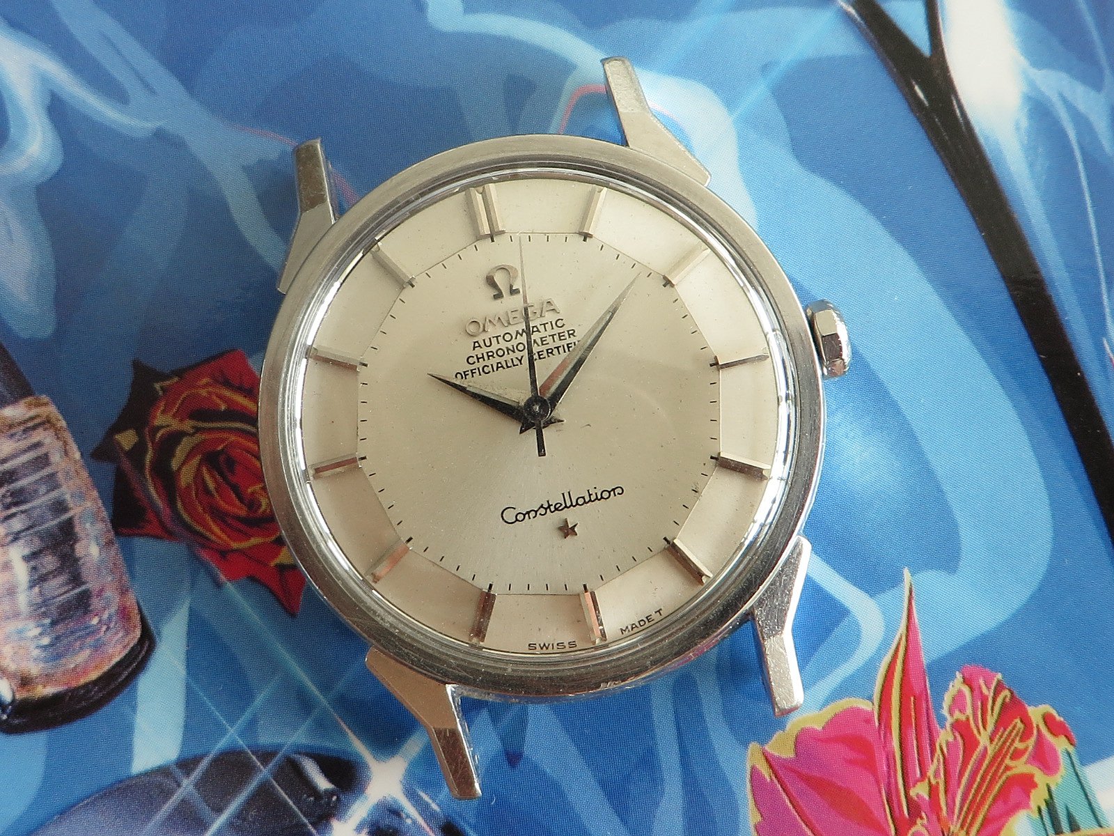 All stainless steel screw back case with distinctive dog leg lugs, correct original signed crown and observatory medallion on the back. Some minor pitting between the lower lugs, but does not appear to have been polished, shows wear from honest use, not a show piece but a very wearable classic Constellation.