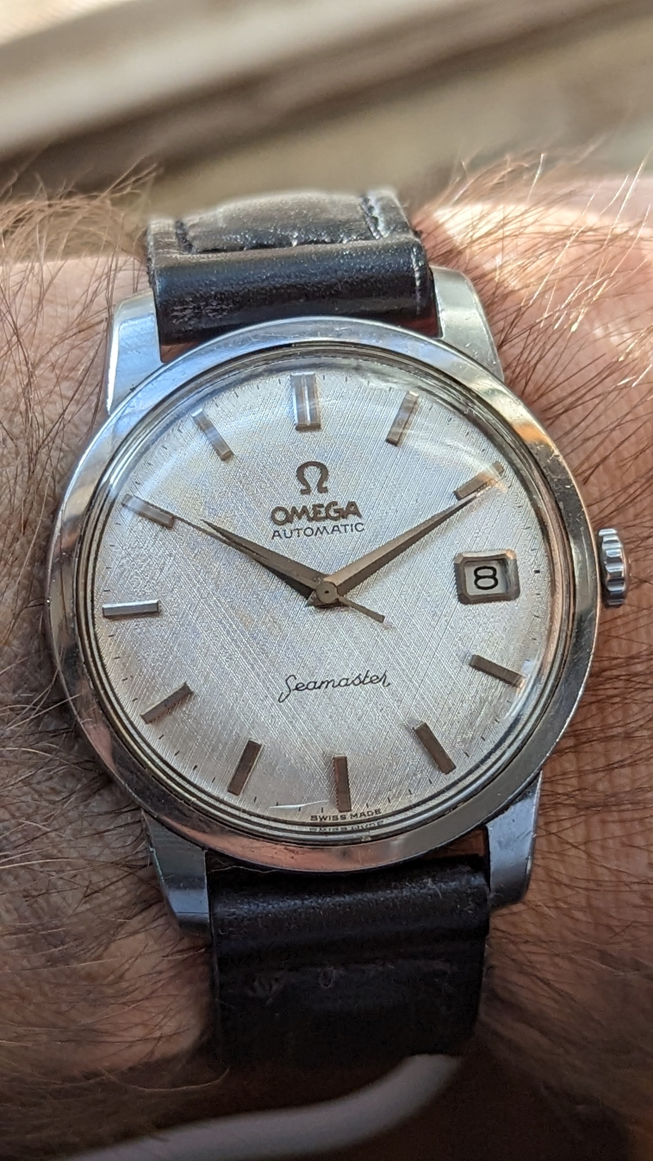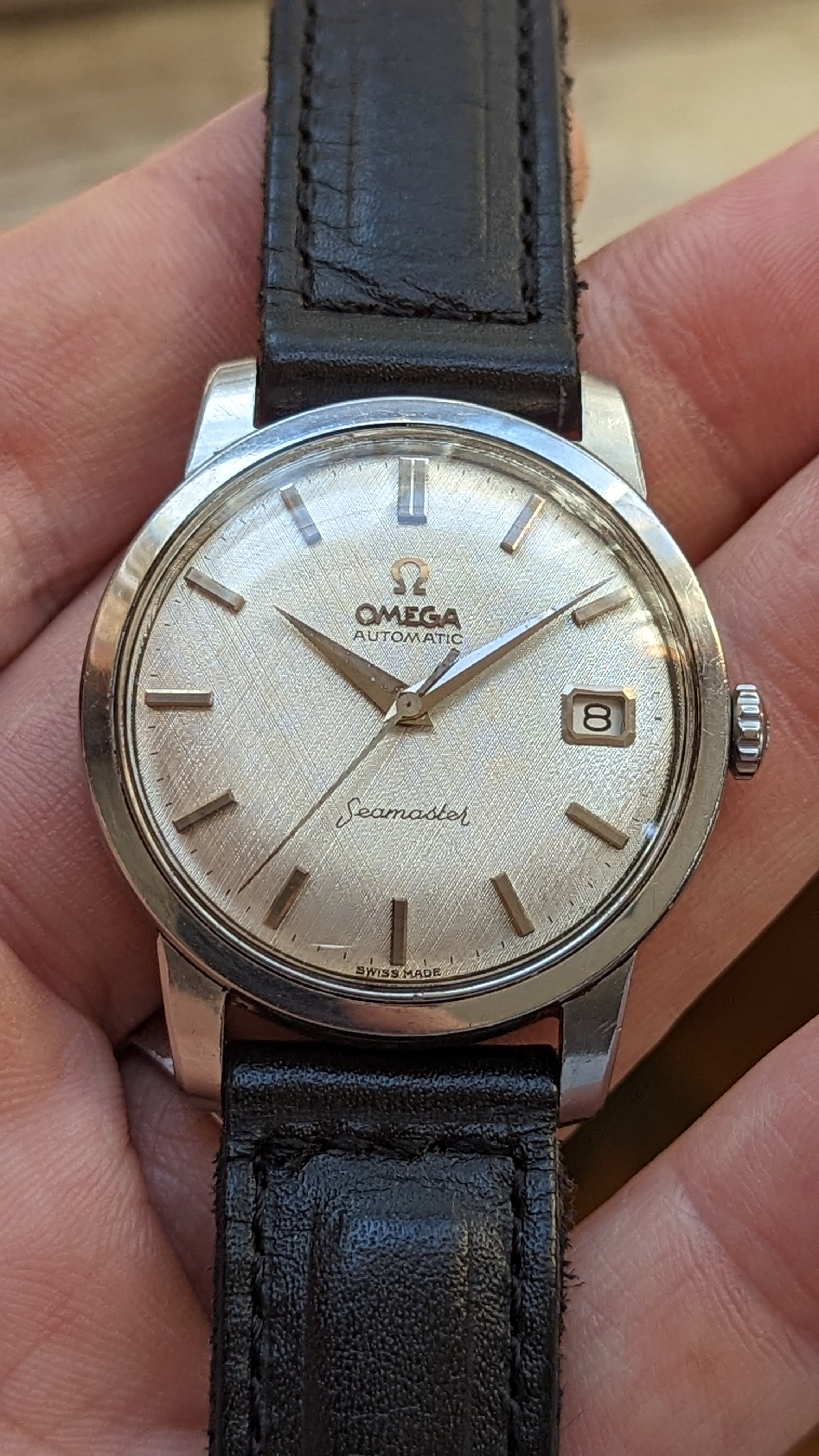 Intro: Up for sale today is a clean stainless steel Omega Seamaster reference 166.011-63 SC sporting a lovely linen dial with a clean 562 movement. Another date window watch that I’d like to move on to a better home.