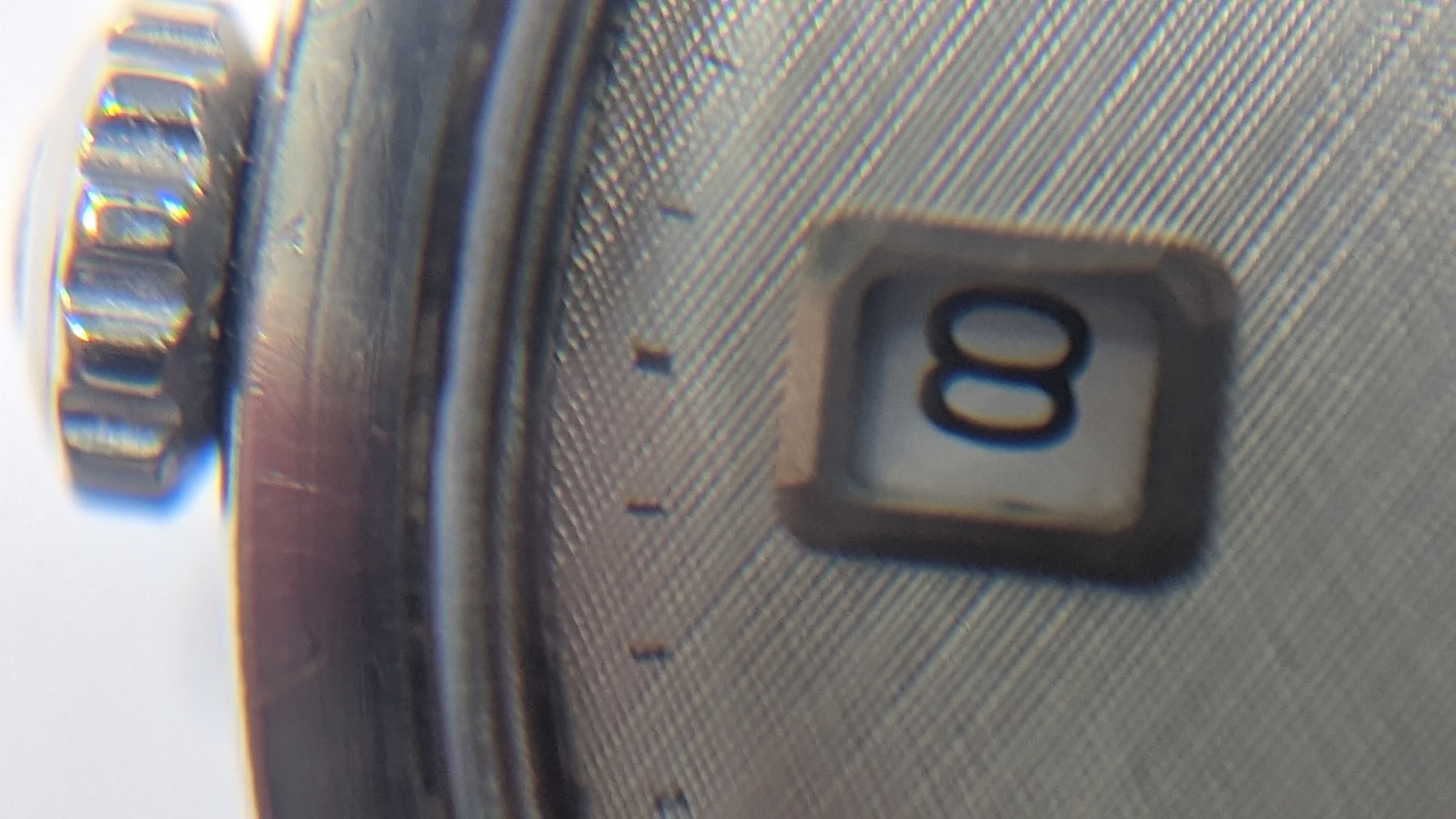 Crystal: Unsigned replacement crystal with minor scuffs and scrapes. Small crack between 6 and 7 marker.