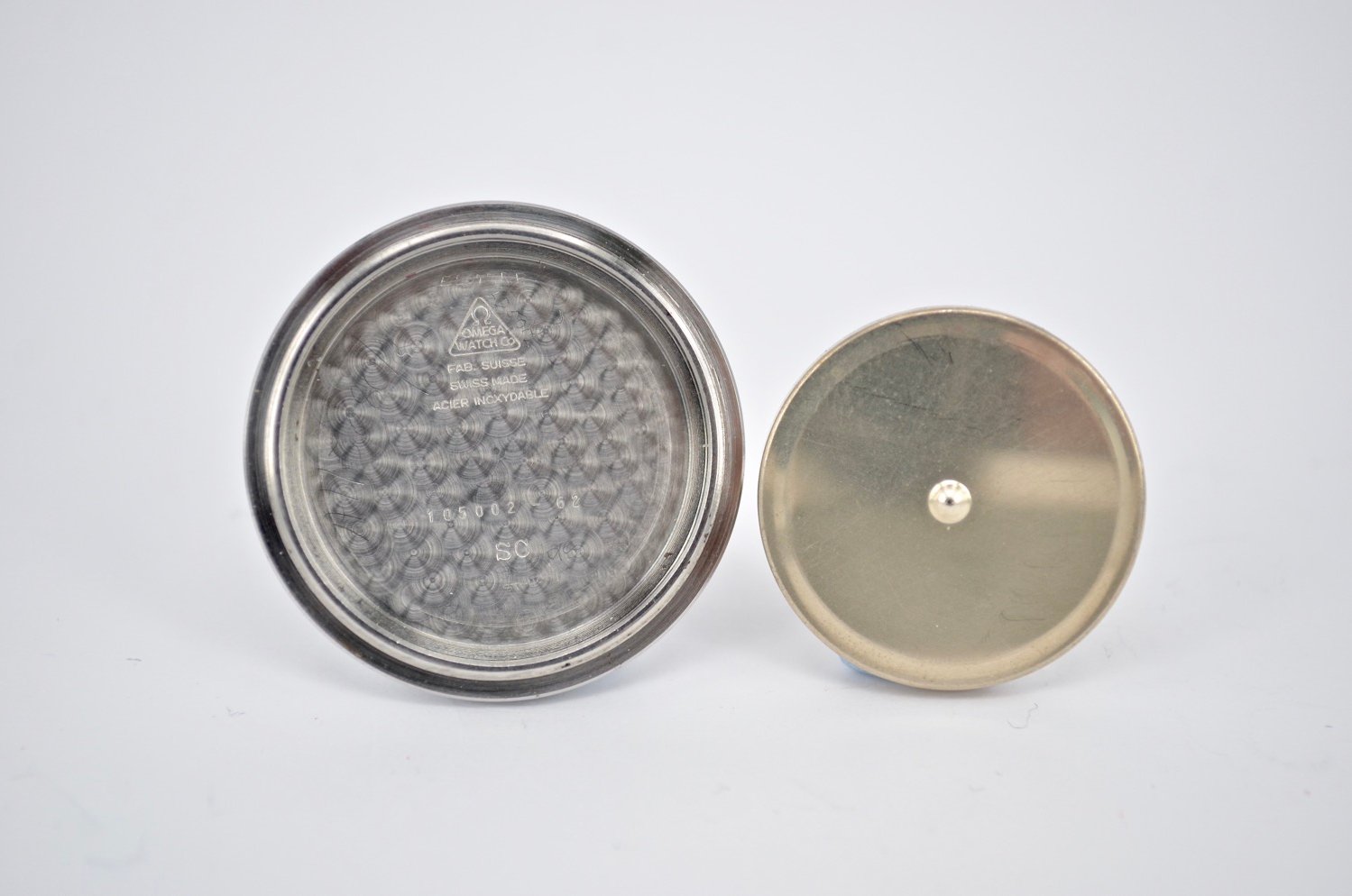 Case Back: Correct double bevel case back with 105.002-62 SC stamped in the reverse