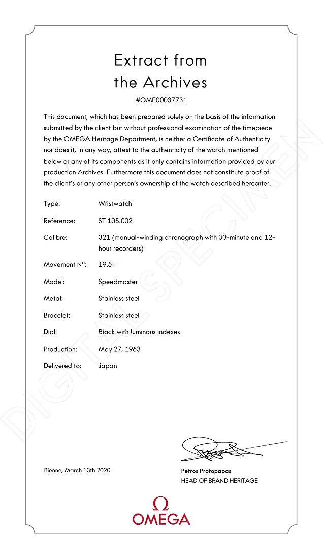 Included with watch: Watch and box as well as an Omega Extract of Archves dating the watch to May 27th 1963 delivered to Japan.