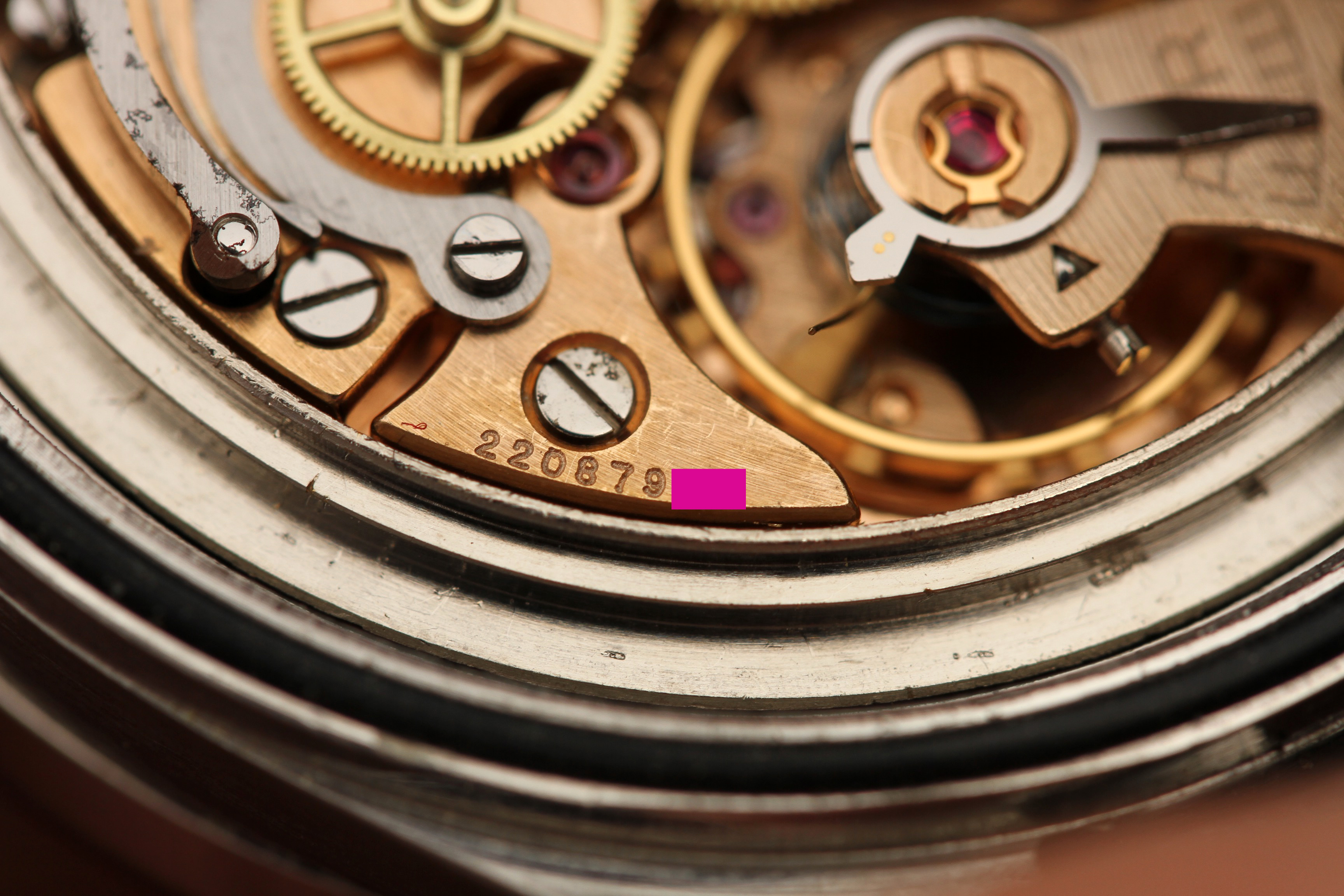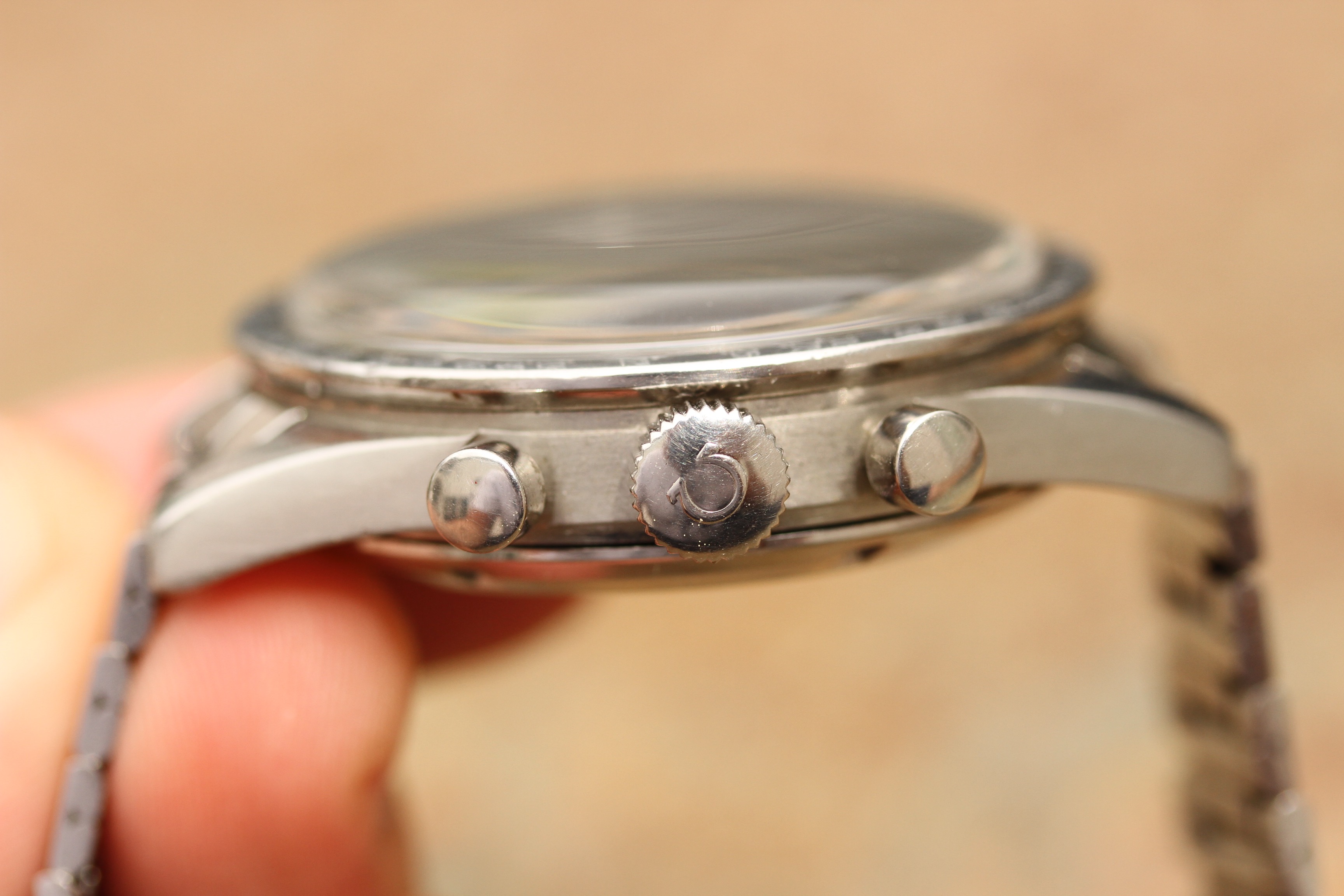 Dial is original, step with applied logo. Dial is damage free with a slight fade to it as seen in pictures. The tritium is mostly gone from plots as seen in pictures. Hands are period correct with drop baton chrono Seconds hand.