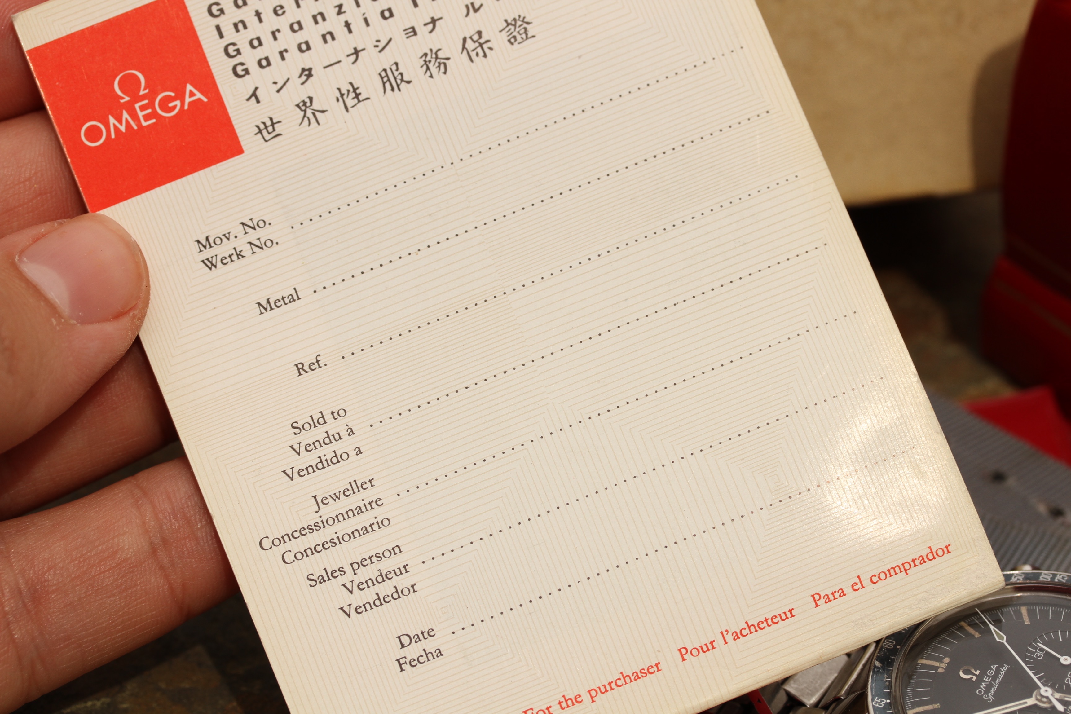 Watch comes with Omega 1964 inner and outer boxes, Omega wallet, Omega guarantee booklet which was never filled out, but print date indicates 1964, manual booklet, and used NATO style strap.