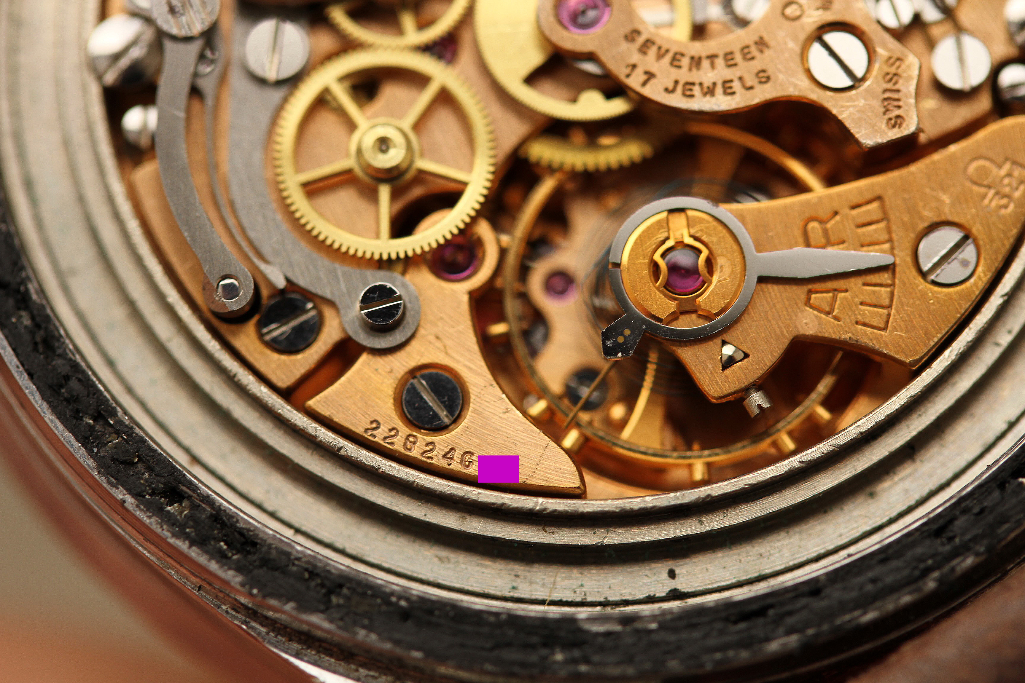 The watch is presented mostly as found, with dry rotted gasket and some dirt on case between lugs and pushers. The crystal had to be replaced as it was badly scratched and hazy from scratches, so this was done prior to taking pictures. The case will be cleaned up and the gasket will be replaced with a new one, but I wanted to present it as "as found" as possible. The generic steel bracelet which the watch came one has been discarded because of condition and overall look of it.