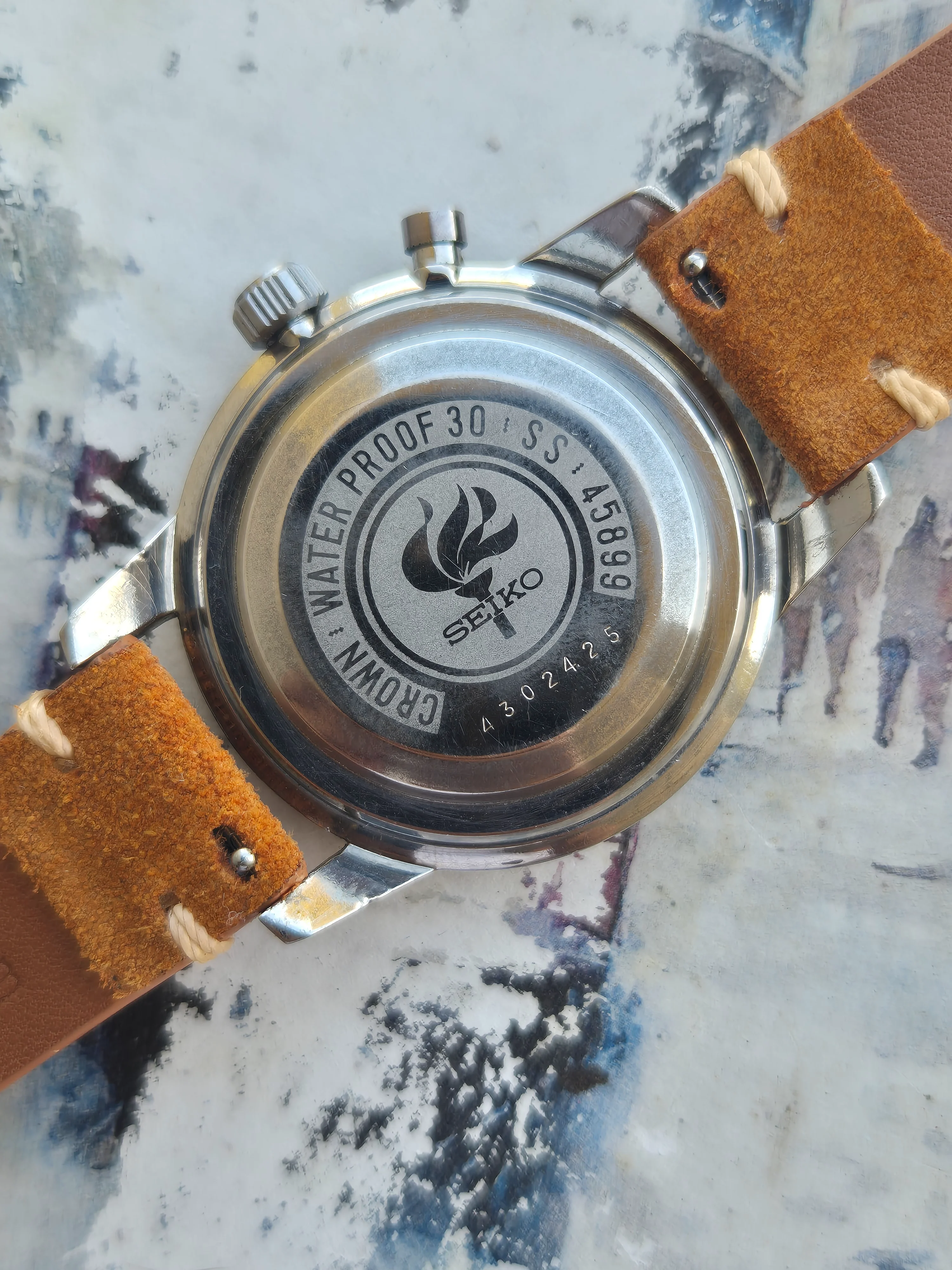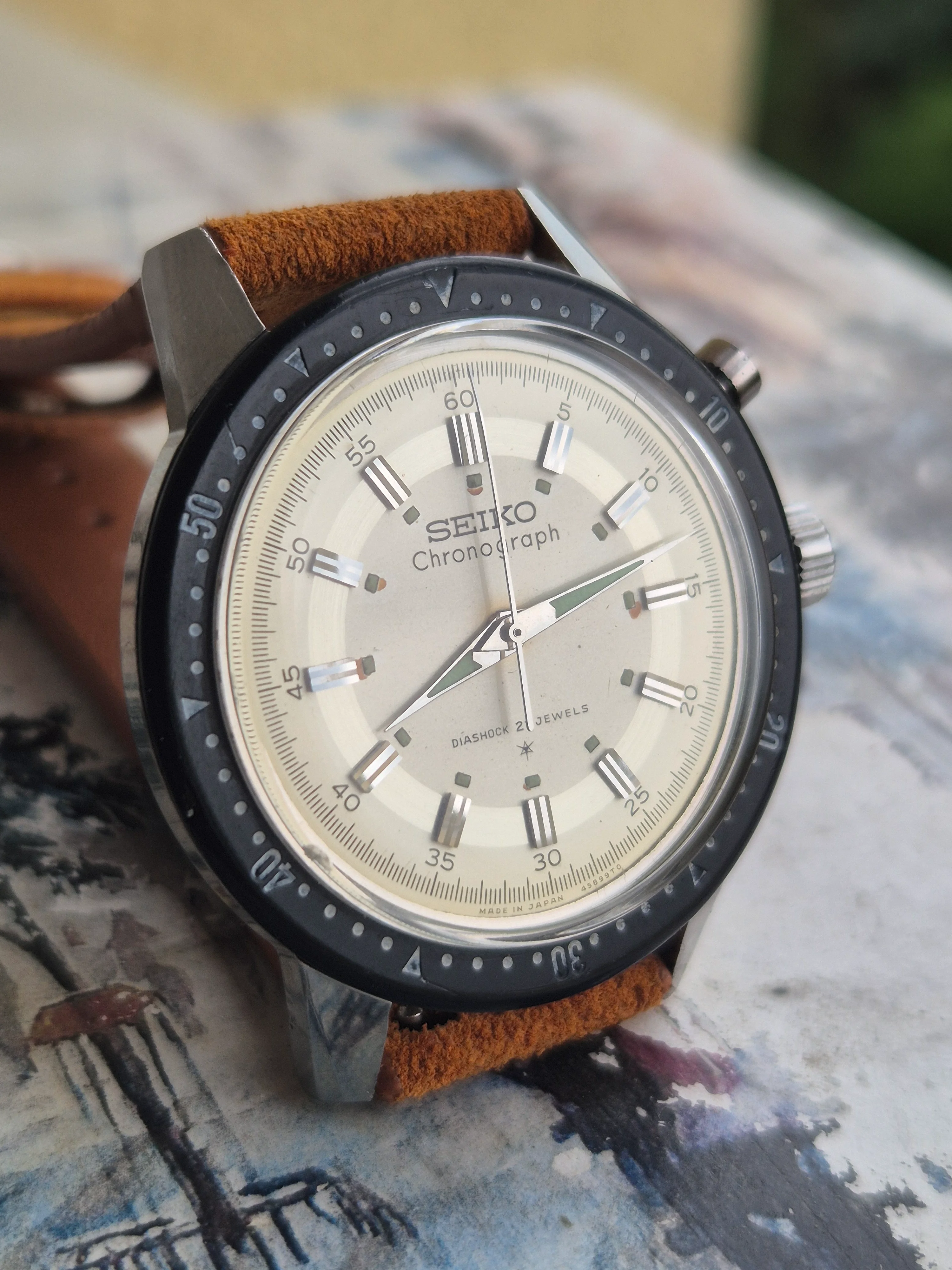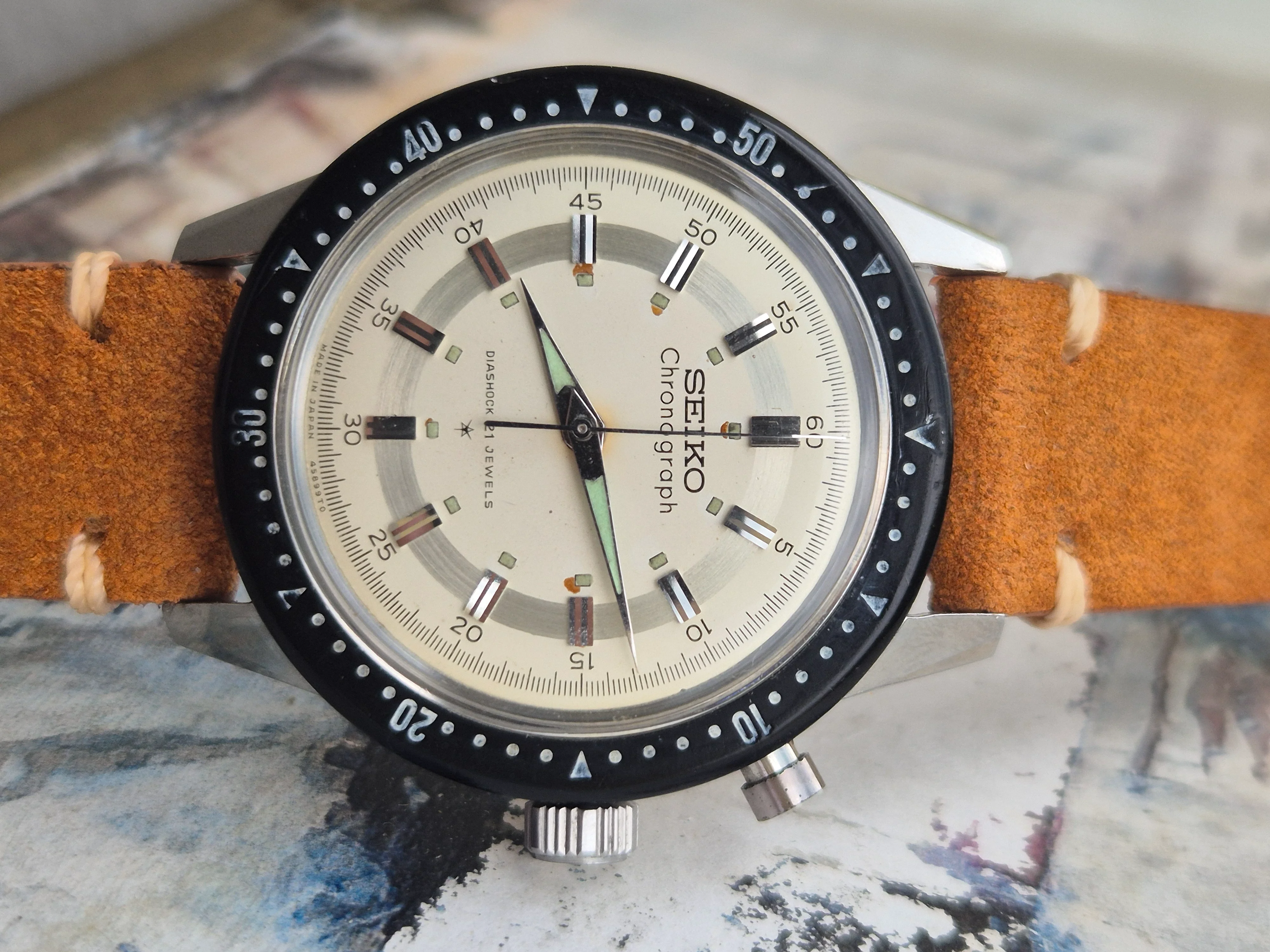 The Seiko 5719/45899 Monopusher Chronograph was only released briefly during and after the Olympics . The Seiko Cal. 5719 was a manual winding column-wheel movement and had only one pusher for all of the chronograph functions. The pusher would start, stop, and reset the chronograph with no chronograph sub-dial, instead tracking elapsed time on the rotating bezel.