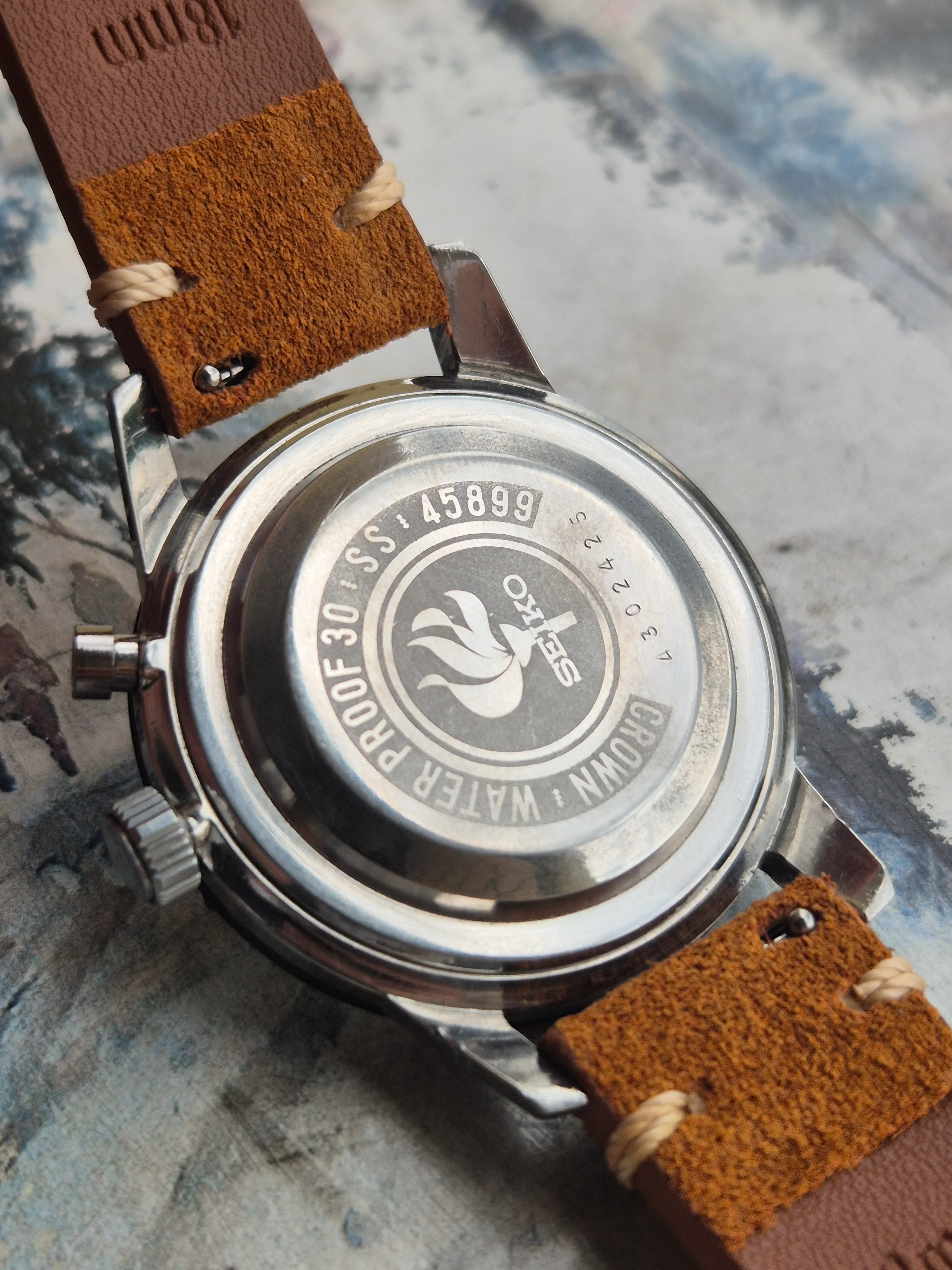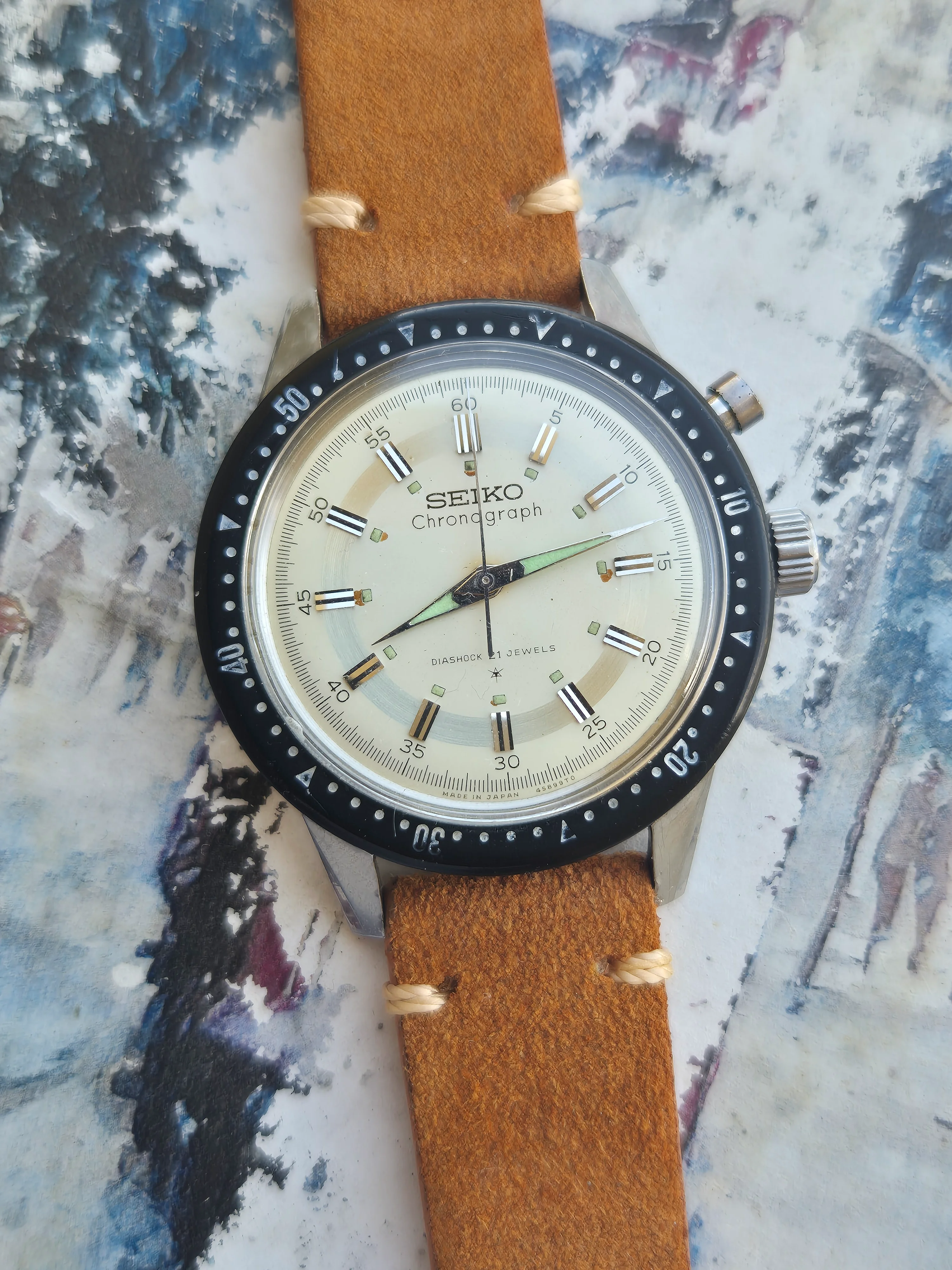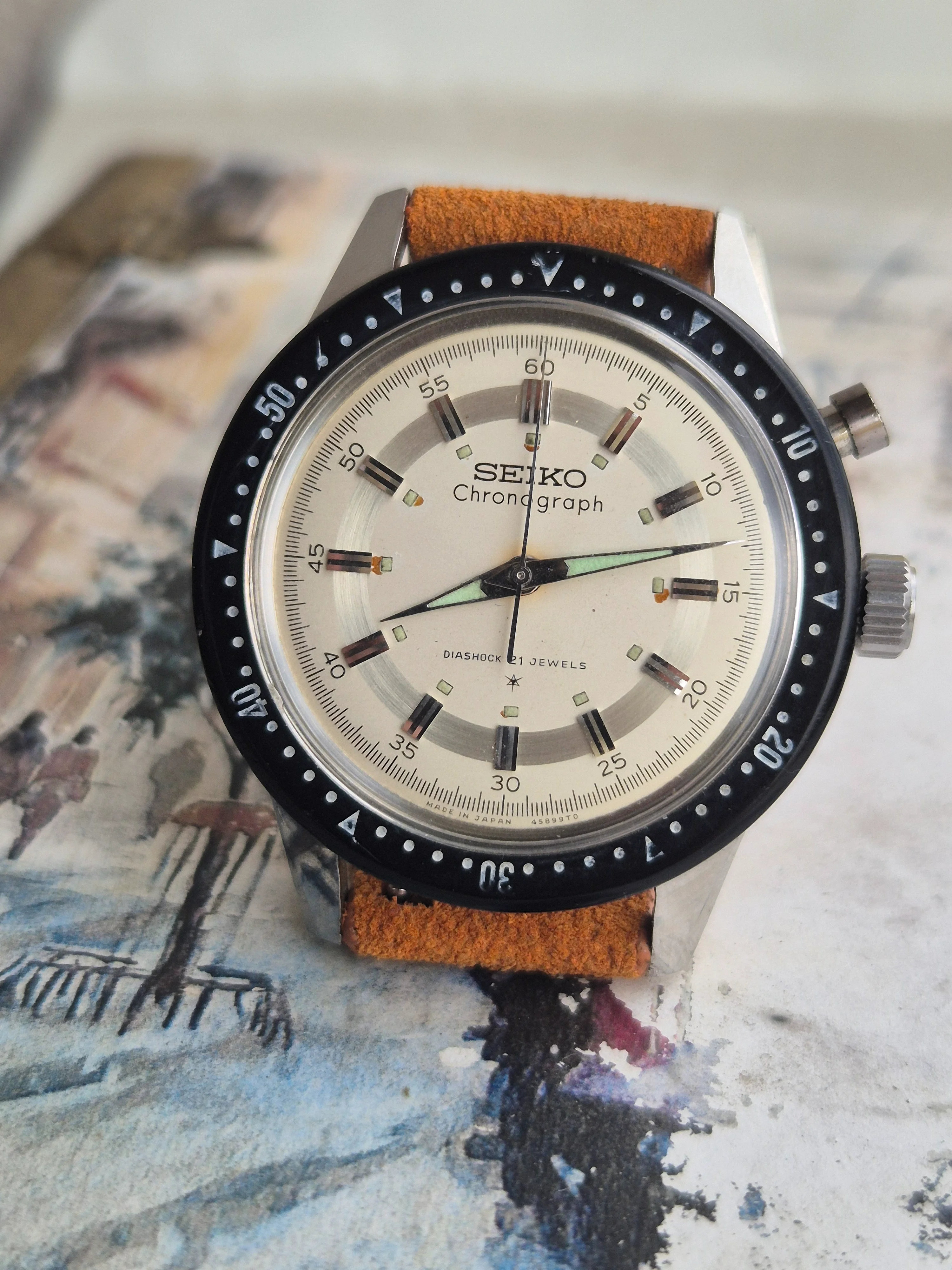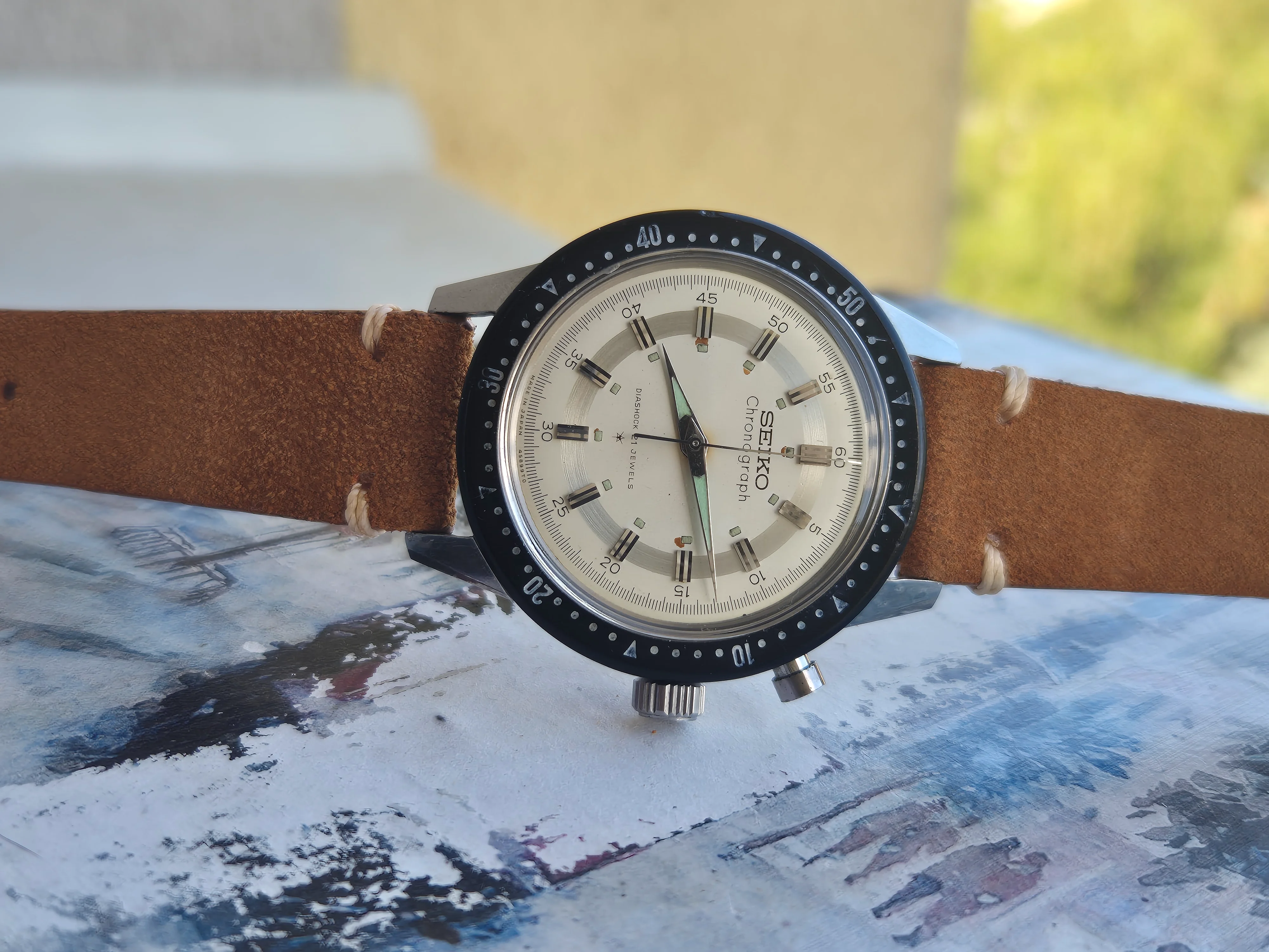 The Seiko 5719/45899 Monopusher Chronograph was only released briefly during and after the Olympics . The Seiko Cal. 5719 was a manual winding column-wheel movement and had only one pusher for all of the chronograph functions. The pusher would start, stop, and reset the chronograph with no chronograph sub-dial, instead tracking elapsed time on the rotating bezel.