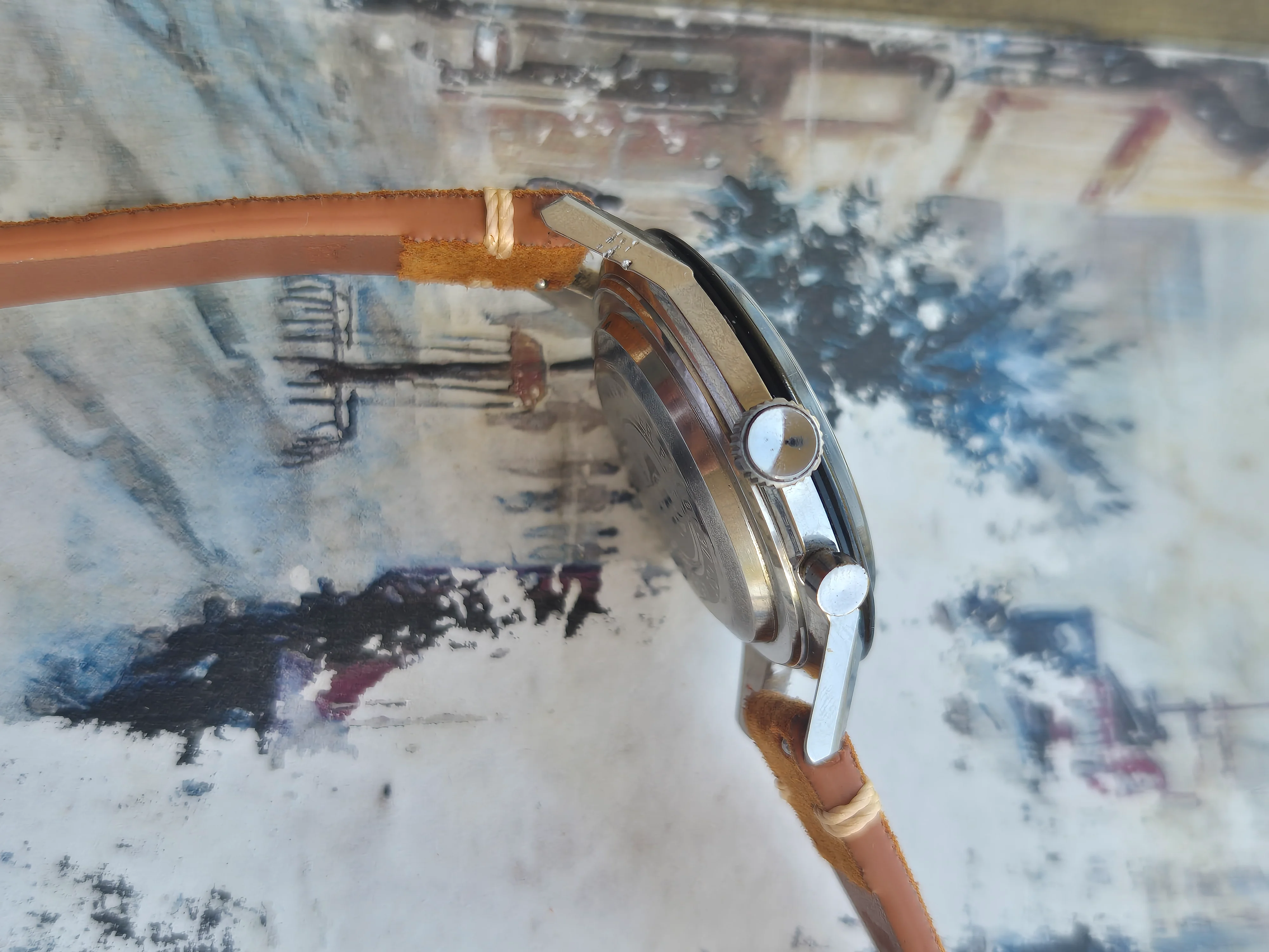 Movement is serviced in 04/2025 and working nice and strong. Chrono works and resets to 0 as needed. Strap and buckle are replacement