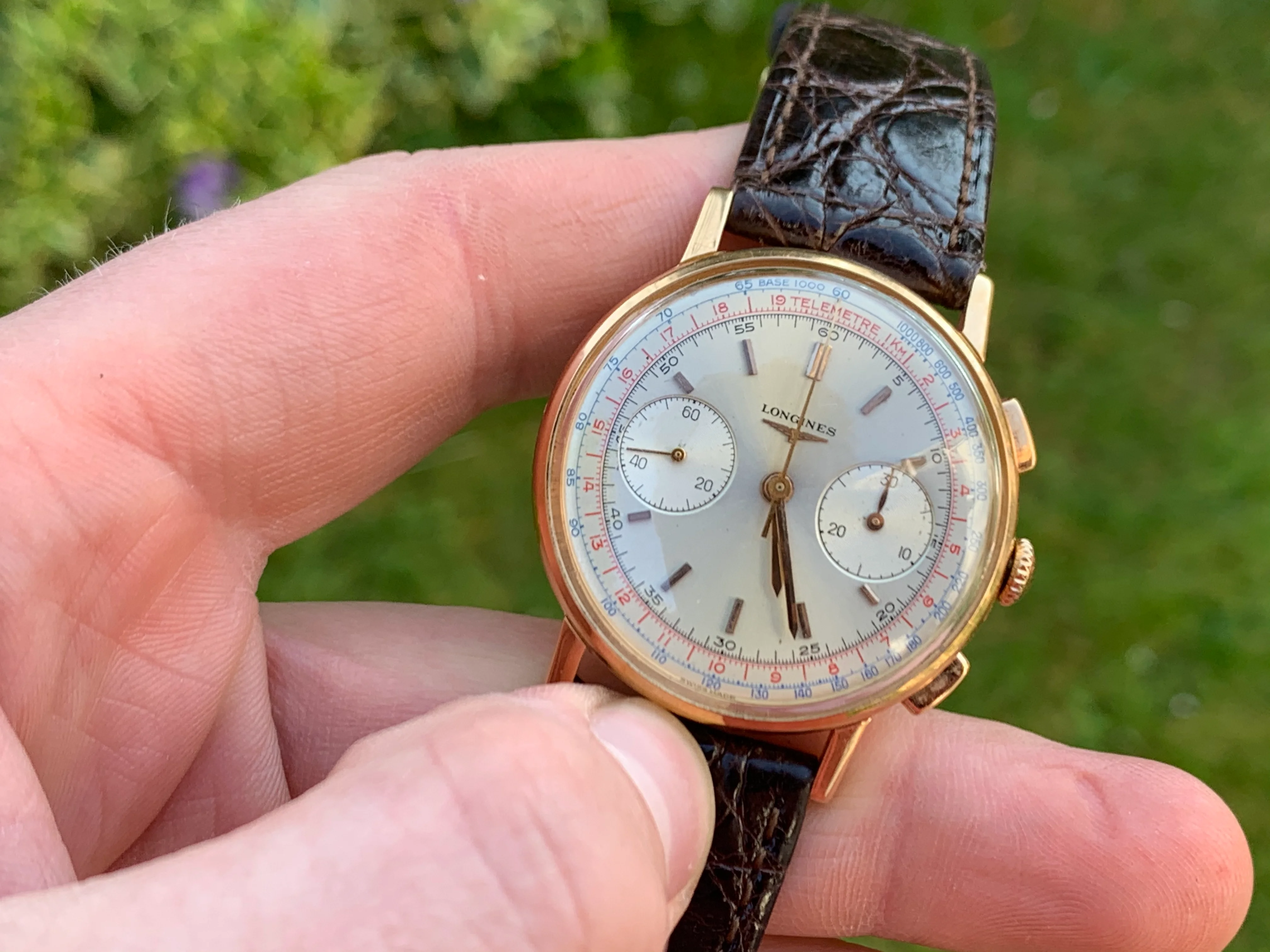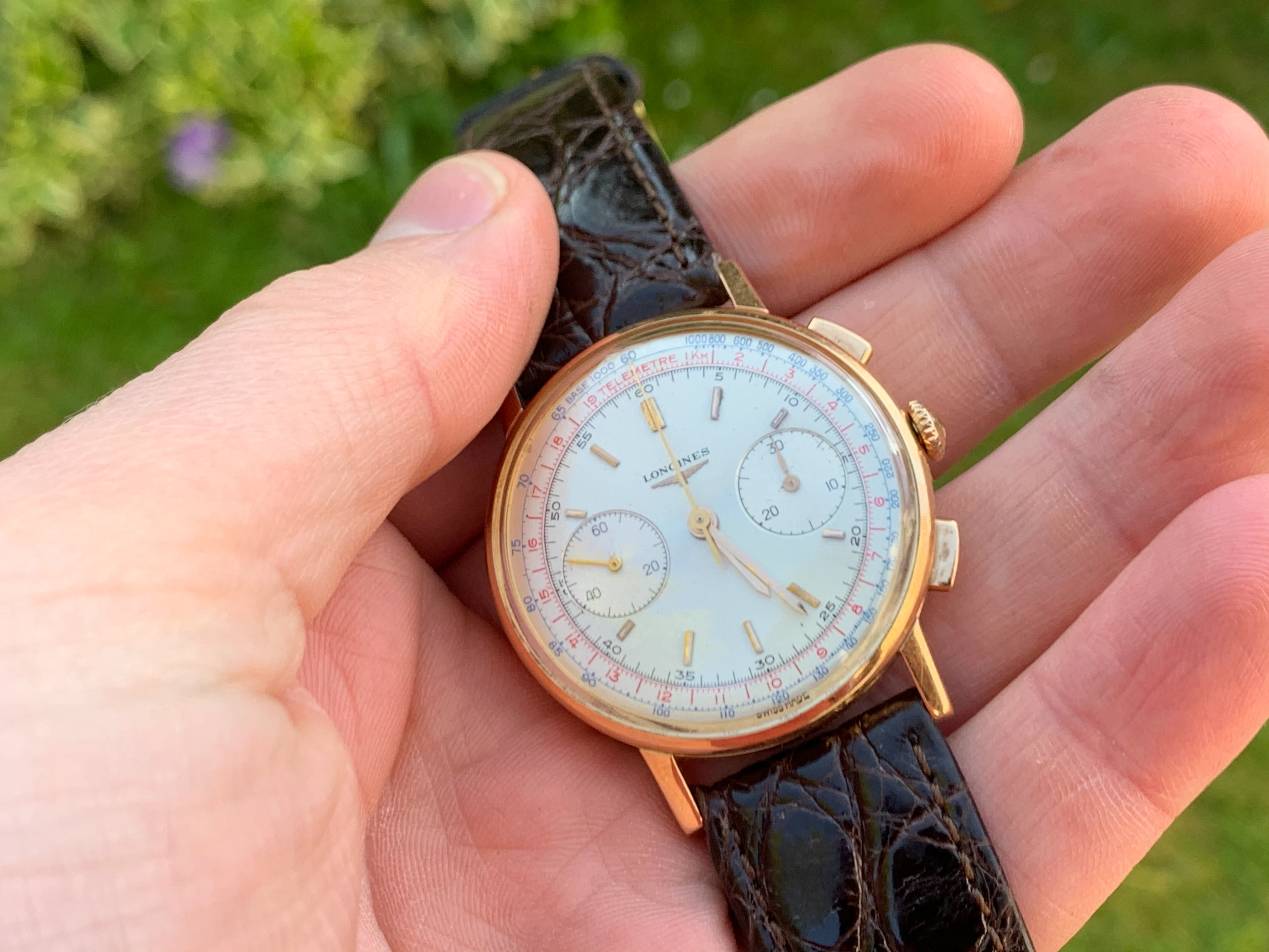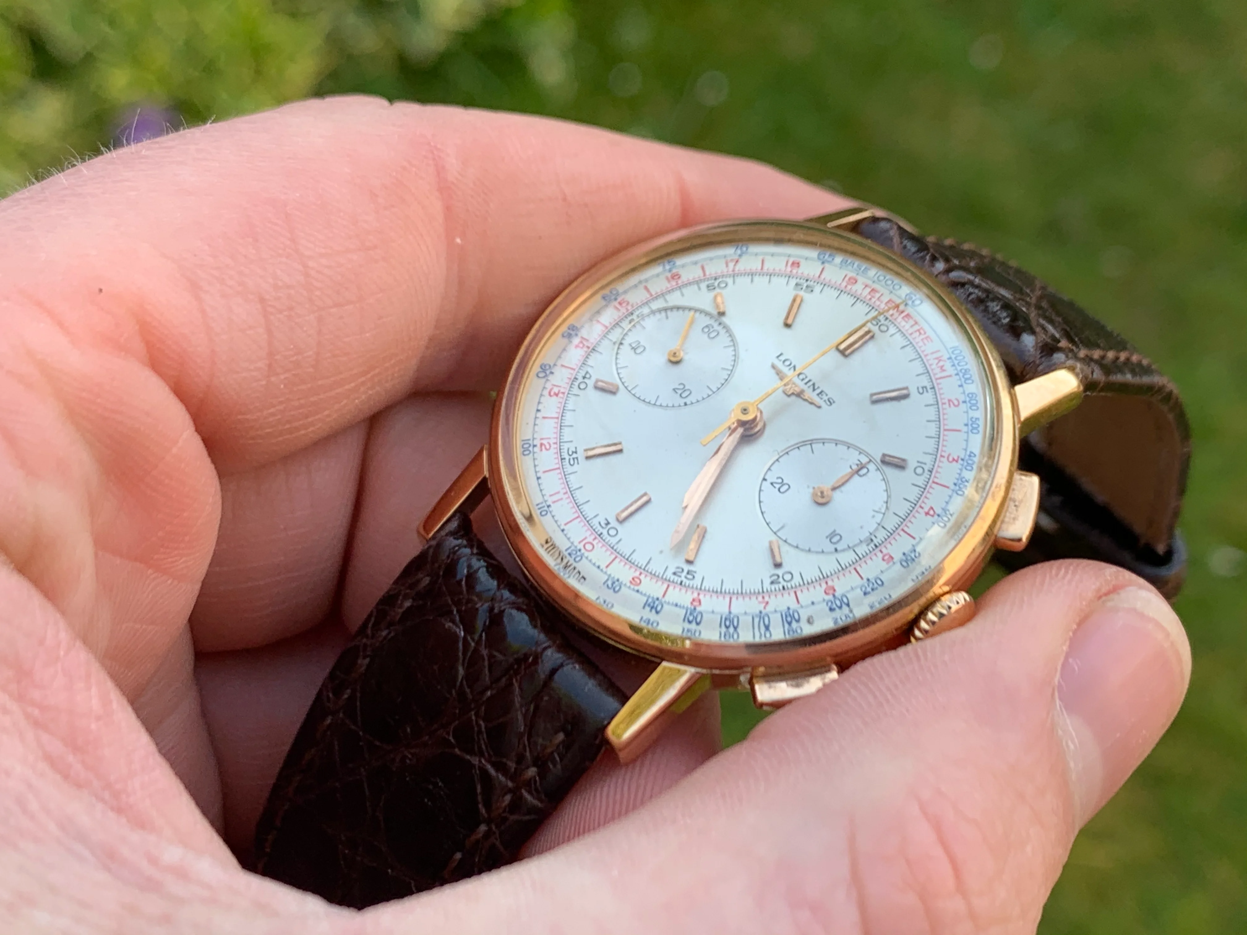 Dial: For an 60 year old watch the dial is in remarkable shape, it is original first and foremost, which is increasingly rare in these models and in very very good condition. The dial has a creamy irridescent tone, which is a delight to behold on a summer's day. That combined, with the glint of reflections from the gold baton hands, and the red and blue scales around the circumference of the dial make for an incredibly attractive and versatile piece, that can be worn for a lunch in the afternoon sun, or an evening affair. Dressed up or down.