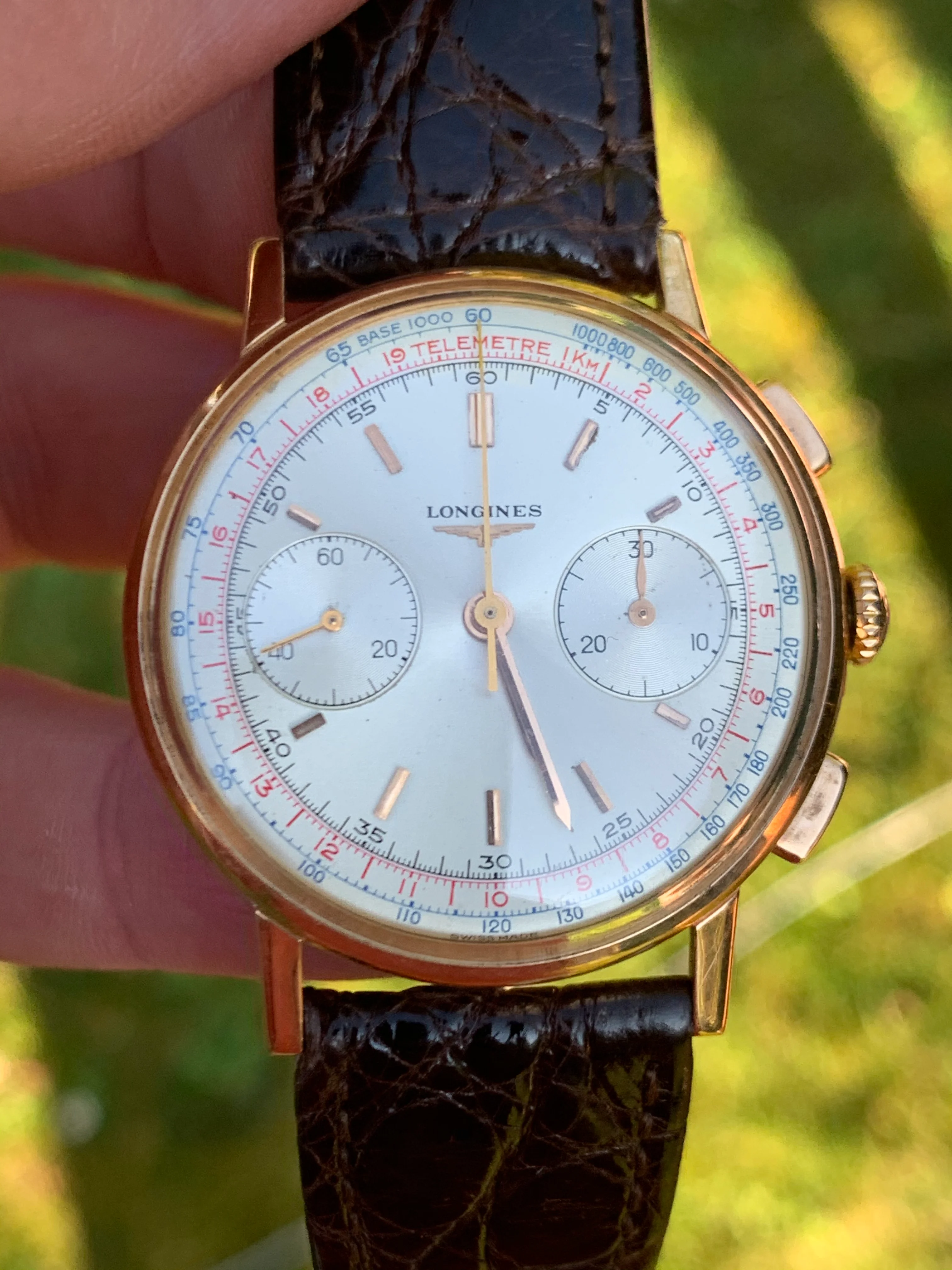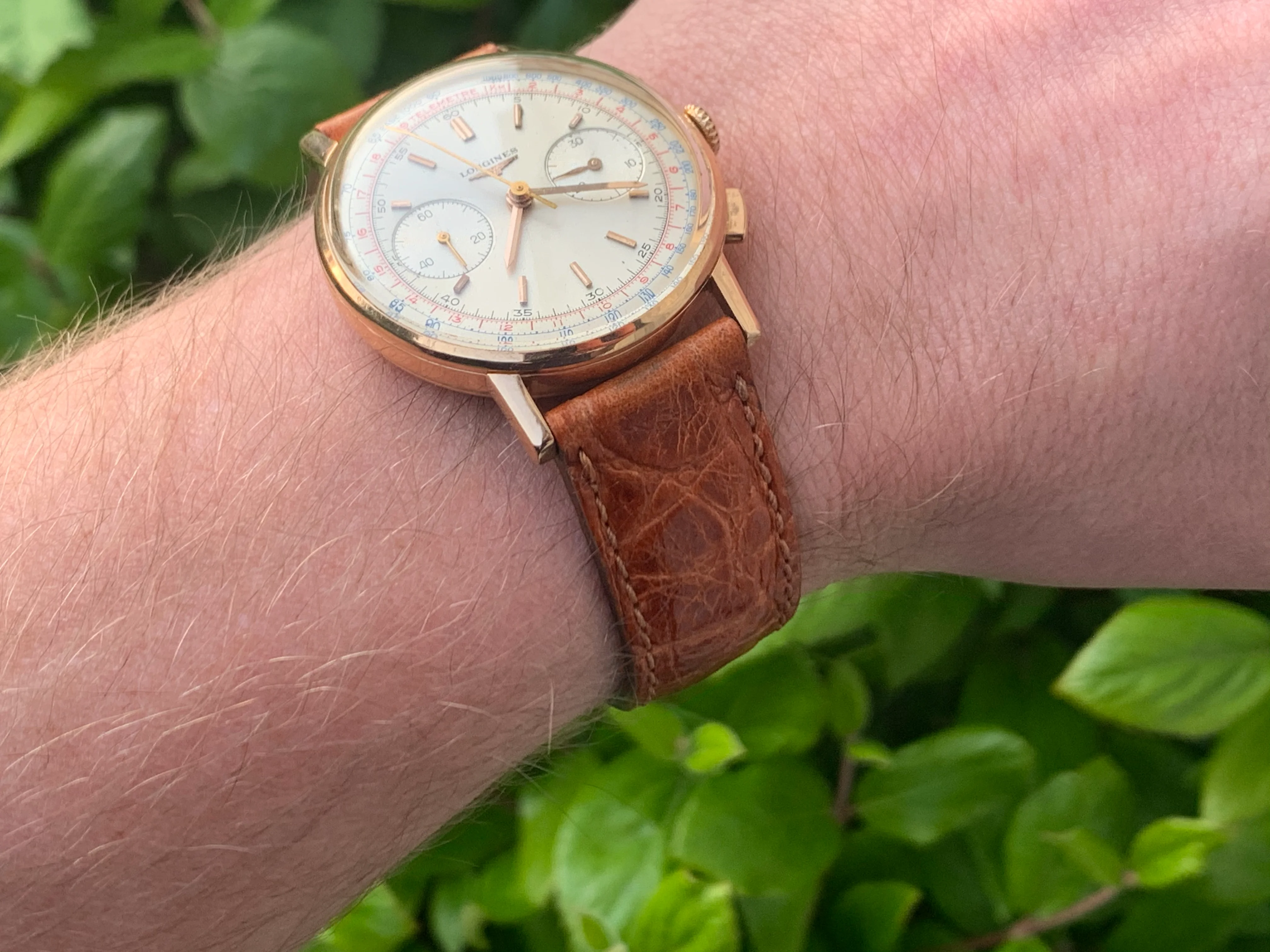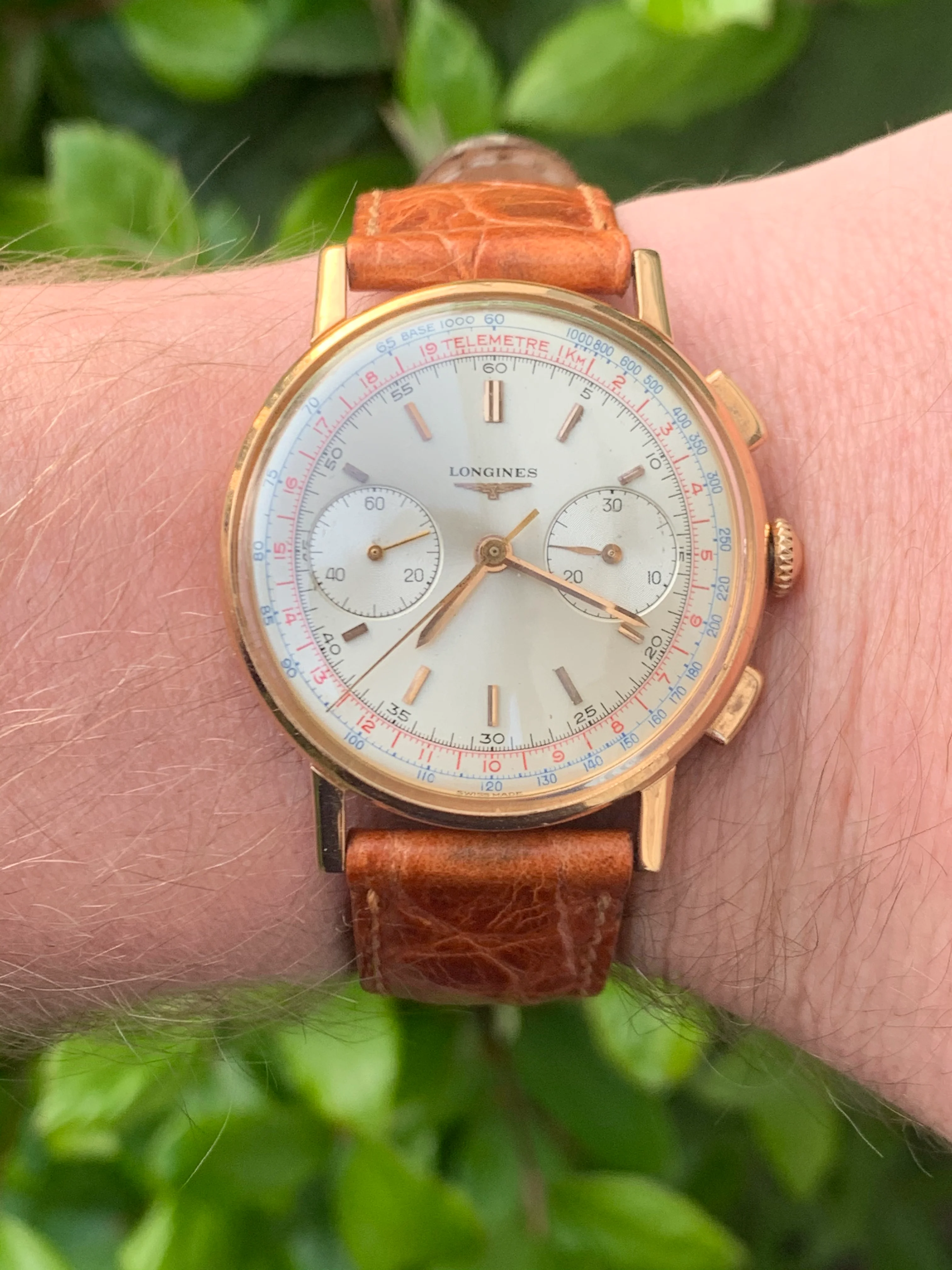 Dial: For an 60 year old watch the dial is in remarkable shape, it is original first and foremost, which is increasingly rare in these models and in very very good condition. The dial has a creamy irridescent tone, which is a delight to behold on a summer's day. That combined, with the glint of reflections from the gold baton hands, and the red and blue scales around the circumference of the dial make for an incredibly attractive and versatile piece, that can be worn for a lunch in the afternoon sun, or an evening affair. Dressed up or down.
