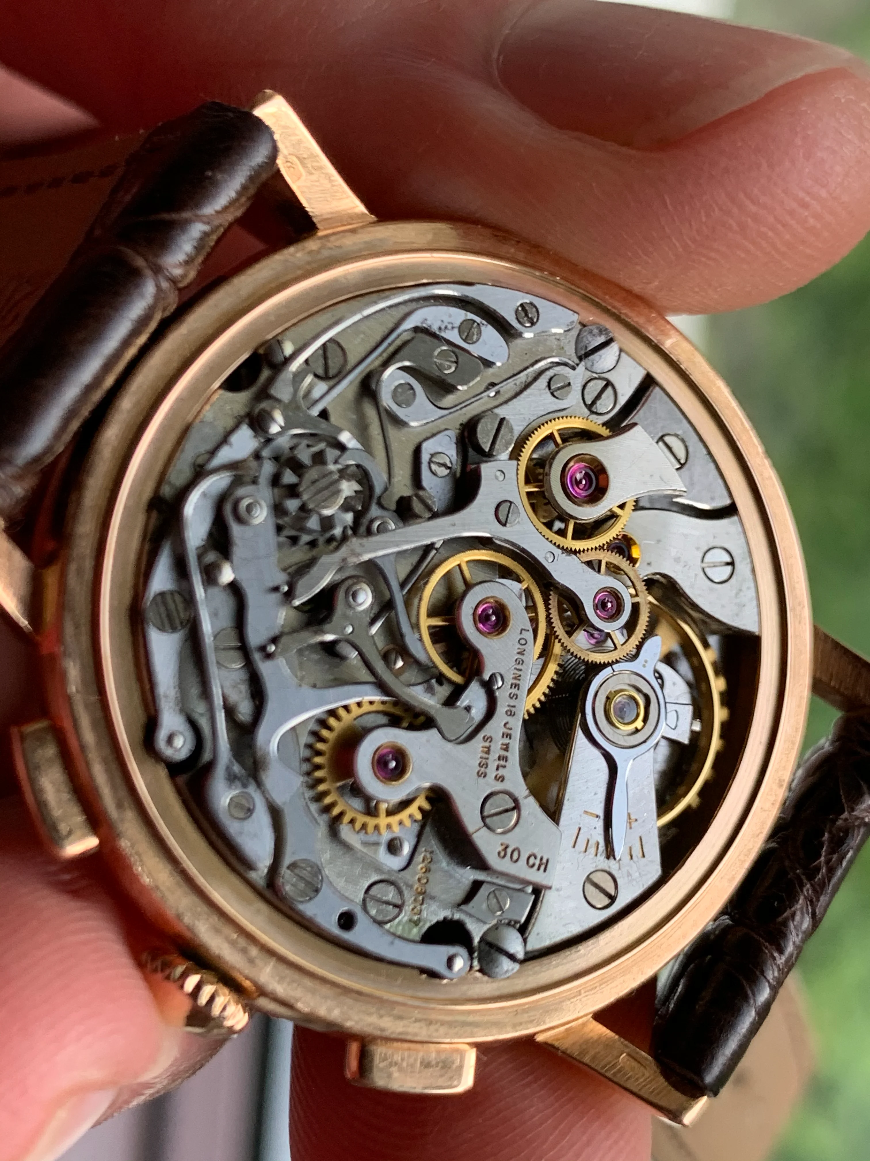 Case: The 18K gold case is in nice shape and measures 36mm without crown. It appears to be have seen some polishing over it's lifetime, as is often the case with gold watches. Needless to say it is not perfect, but overall the condition is commensurate to the age of the watch and the many years of enjoyment I am sure it has shared with its owners. The crown appears to be original. A great size watch, with strong presence given it's more larger size than many vintage watches.