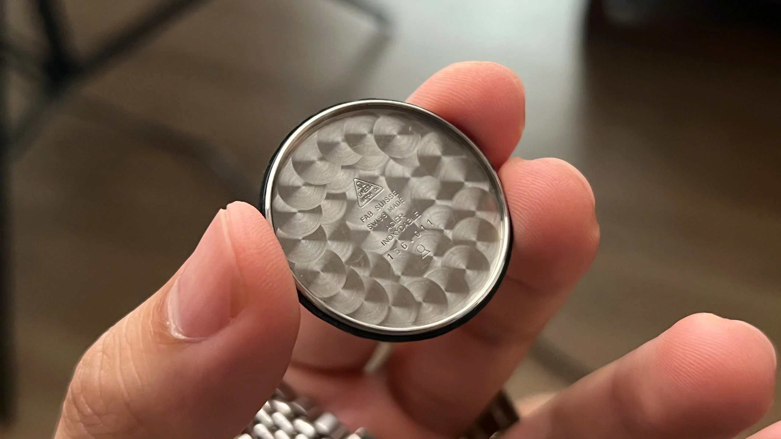 Dial: Original grey crosshatch linen texture, showing light aging and oxidation on indices and hands.