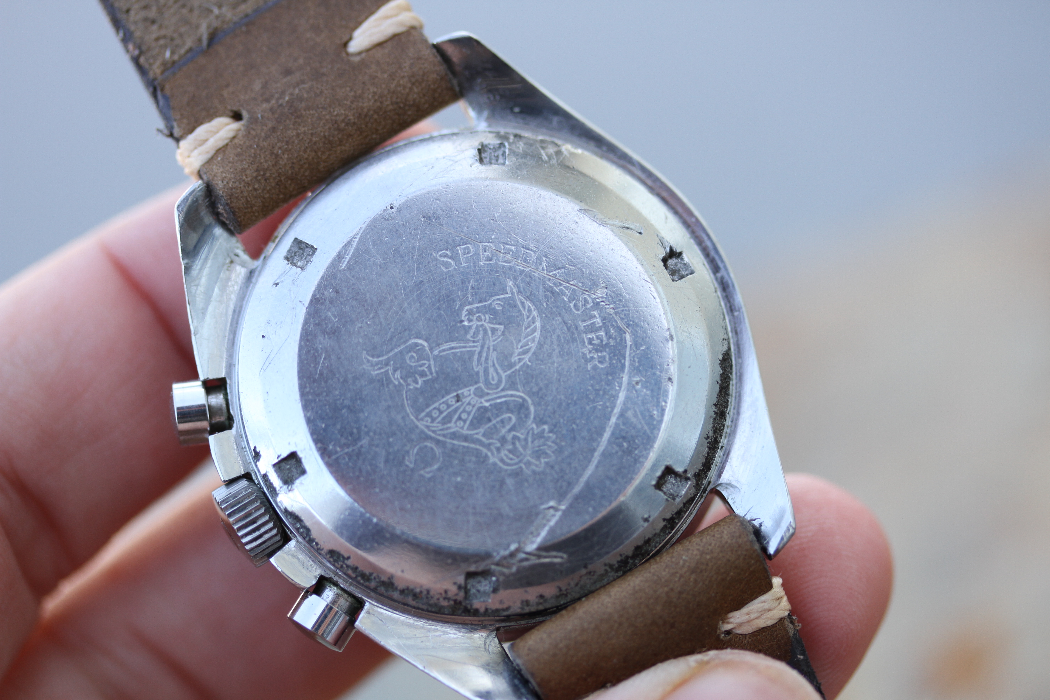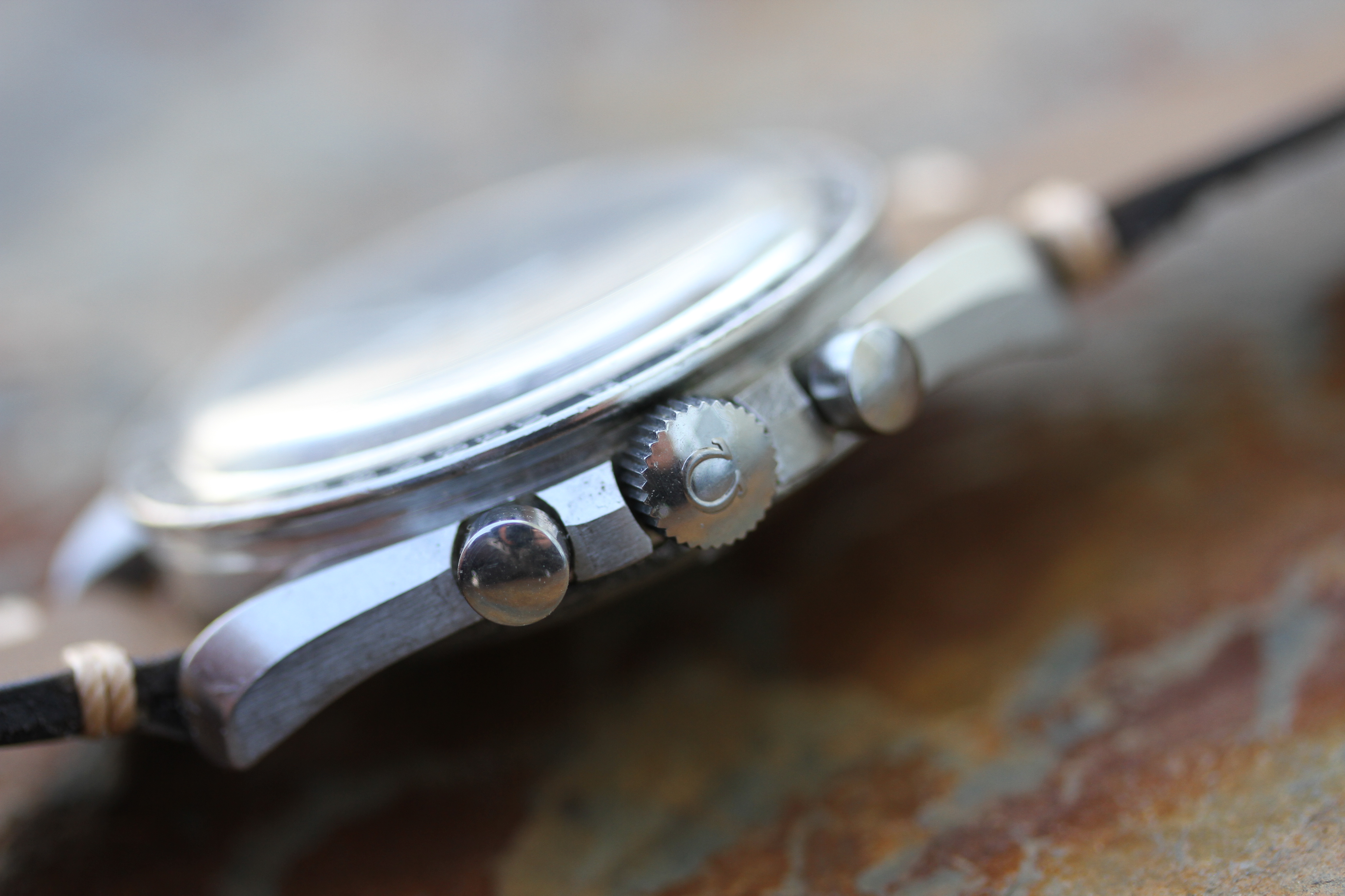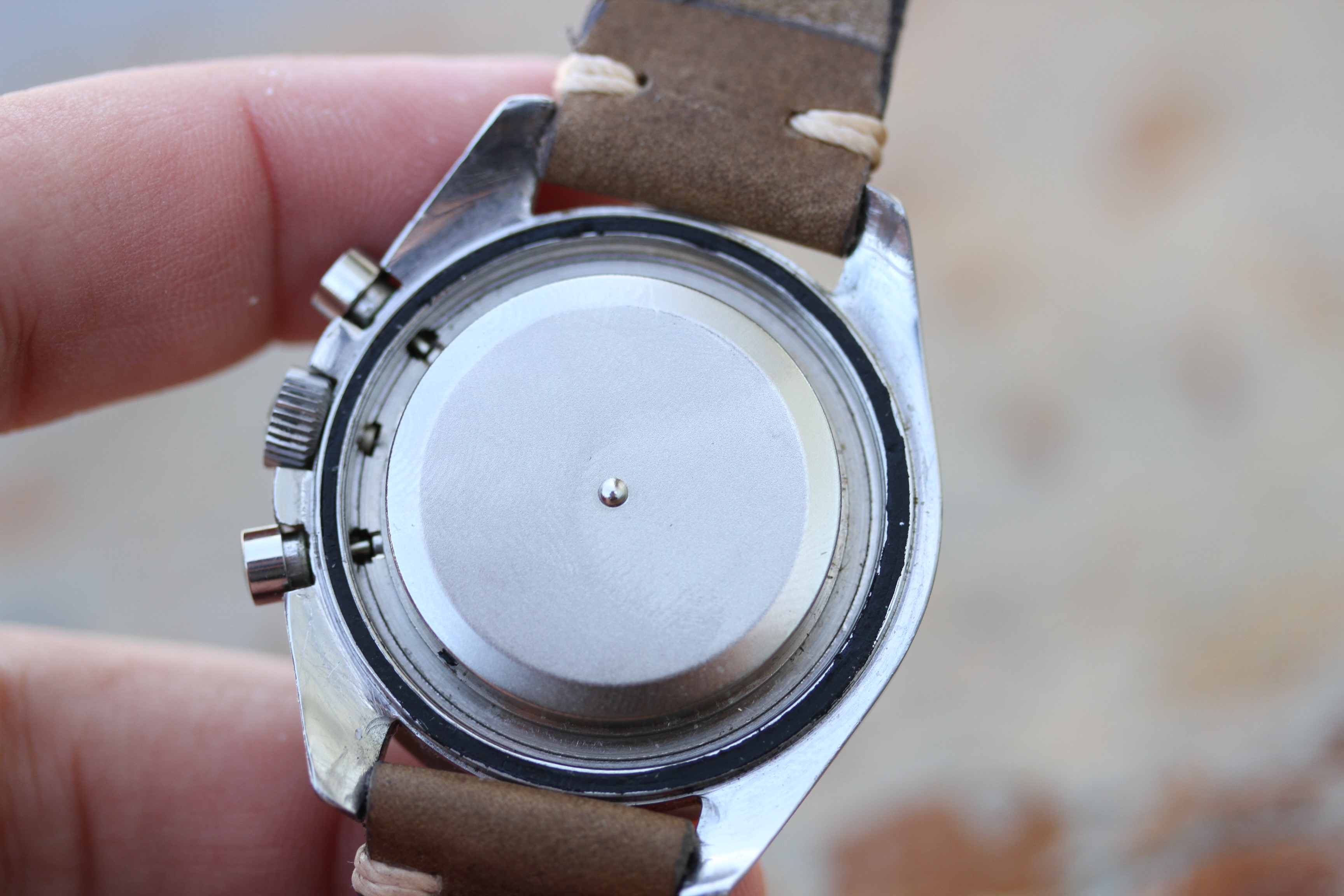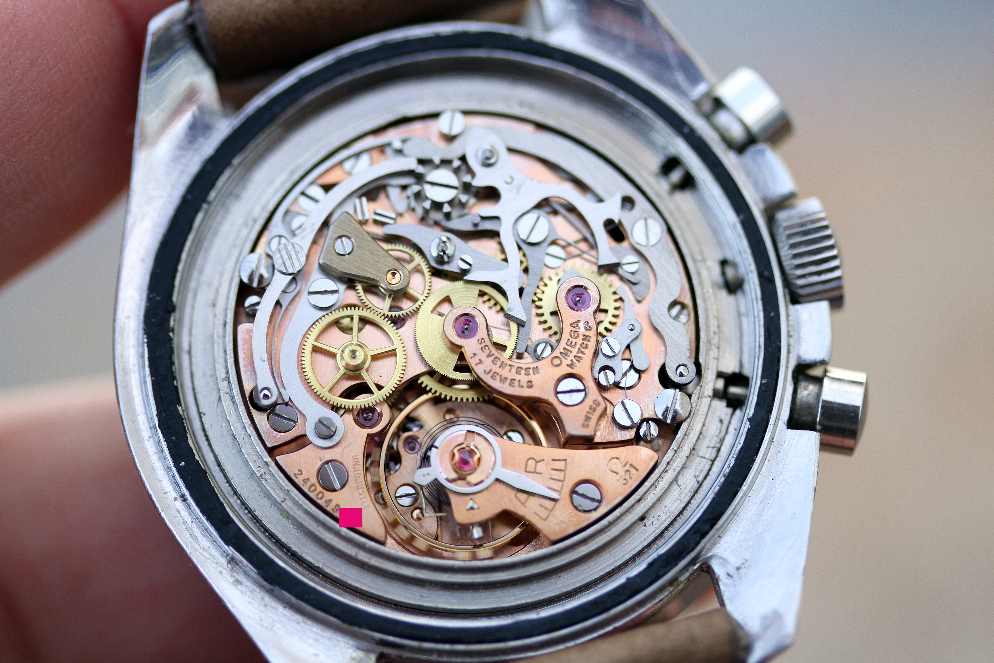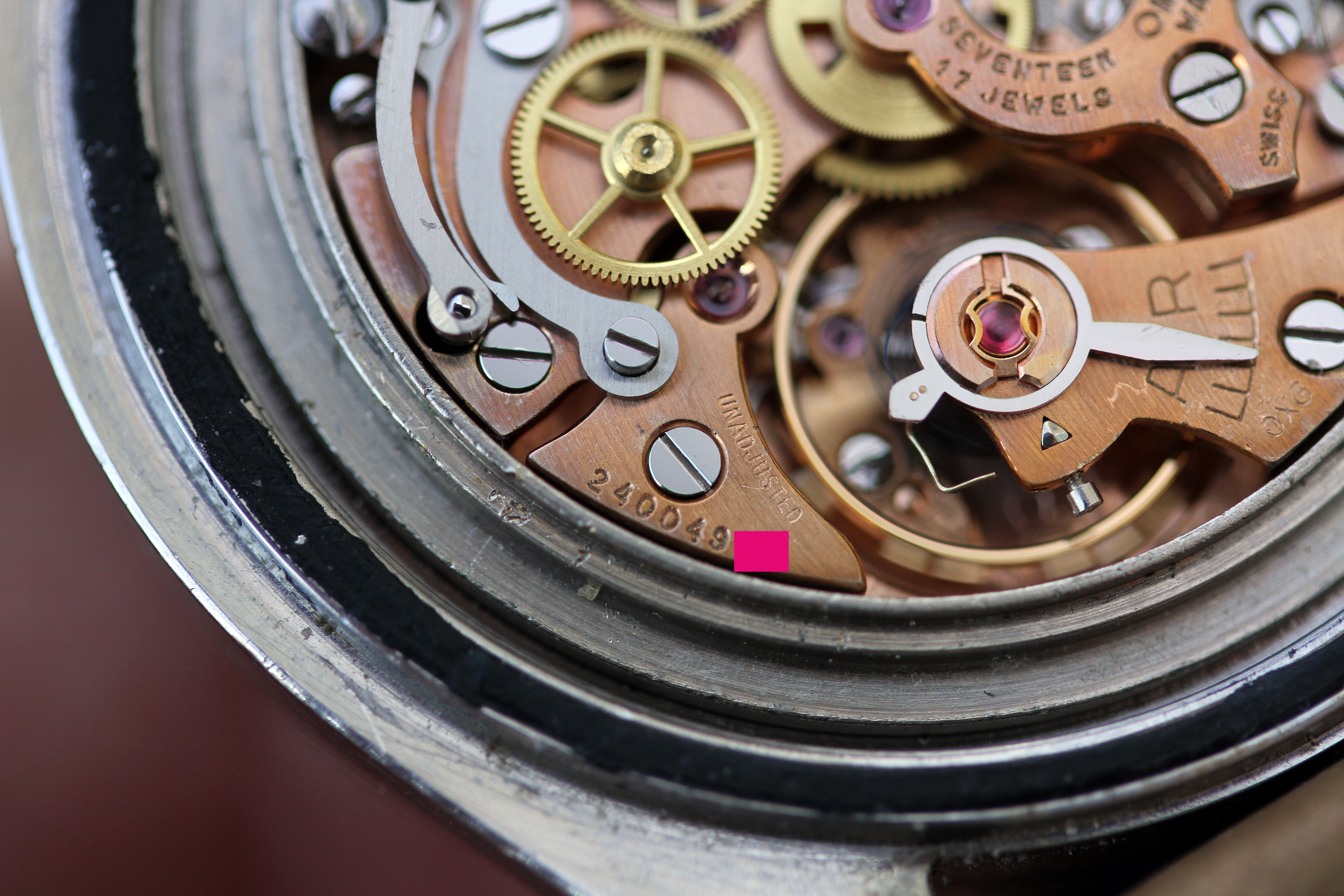 Cal. 321 movement looks to be in excellent physical condition. The caseback shows several service markings. The watch winds, runs, chrono runs, but when you press the top pusher to stop it, it resets it back to zero. I do not have timekeeping or amplitude information for you.
