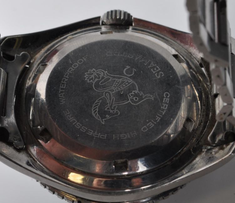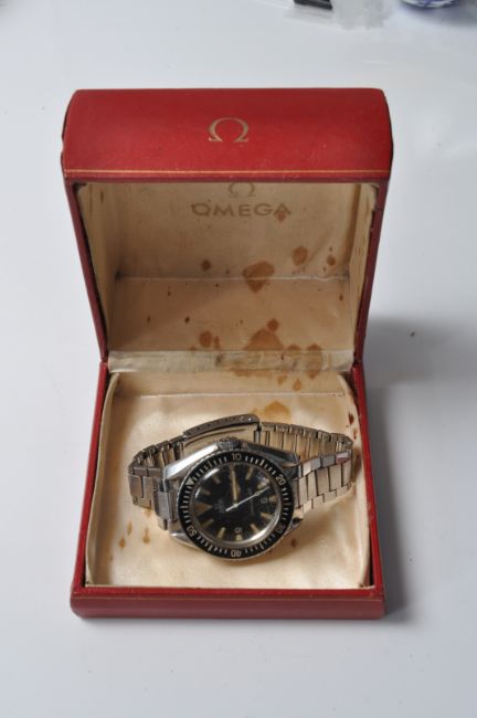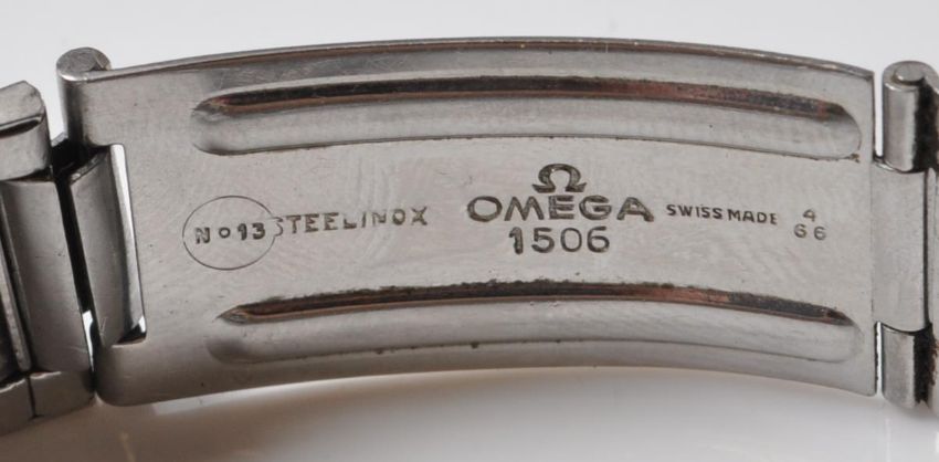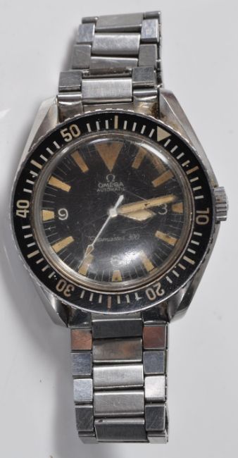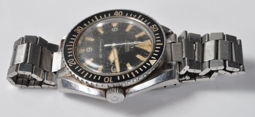 "A vintage 1960's Omega Seamaster 300 ' Big Triangle ' having a stainless steel case with a black enamelled face with white baton numerals to the chapter ring, black enamelled rotating bezel, sea master emblem to the case back, on a stainless steel Omega 1506 strap, Omega symbol to crown. Movement marked 24 jewels, model no. 552, serial no. 24187180. Bracelet marked Omega No. 1506. Condition; general wear and tear, scratches and crazing to the face, bezel rotates correctly, winds correctly, ticking at time of cataloguing, bracelet and case has minor surface scratches and in need of a clean. Please note all watches are sold as untested."