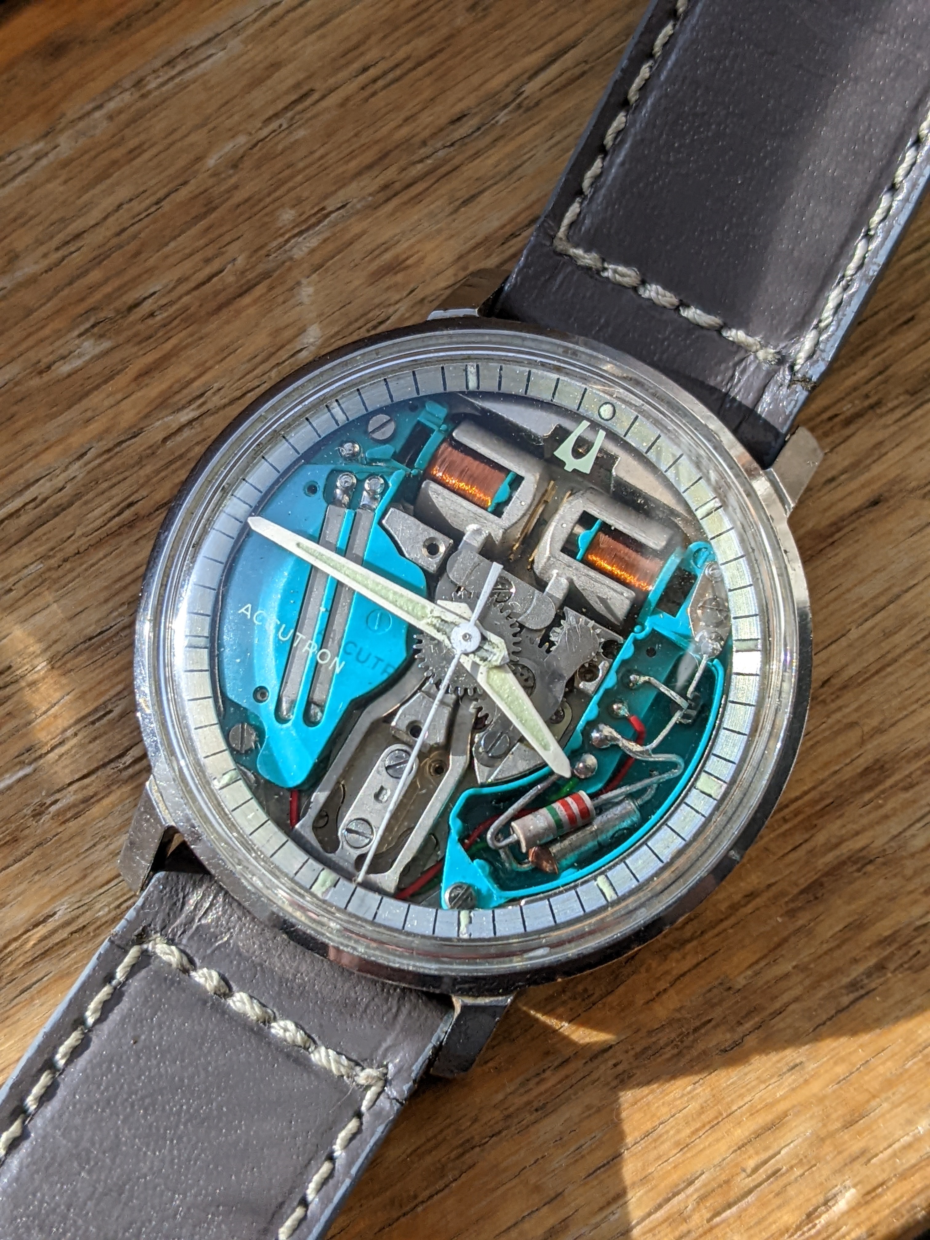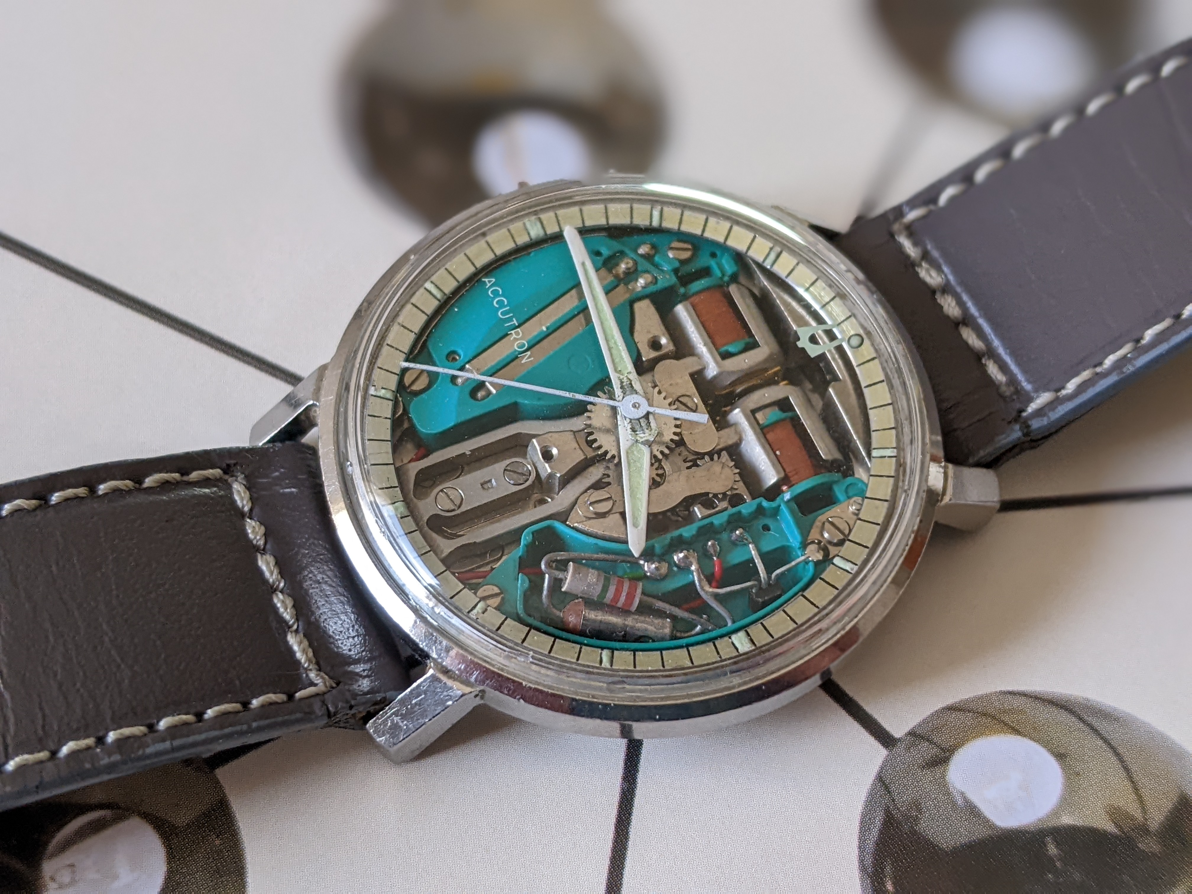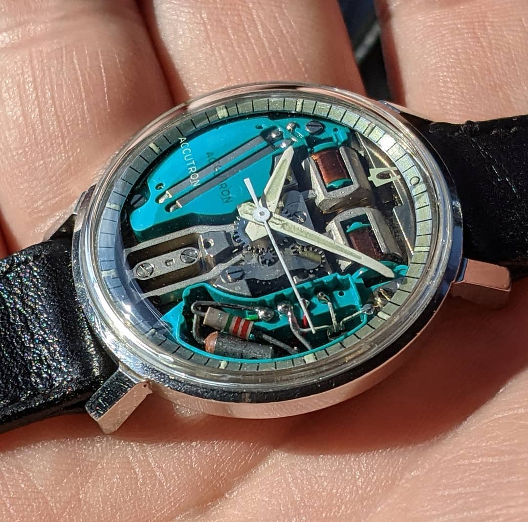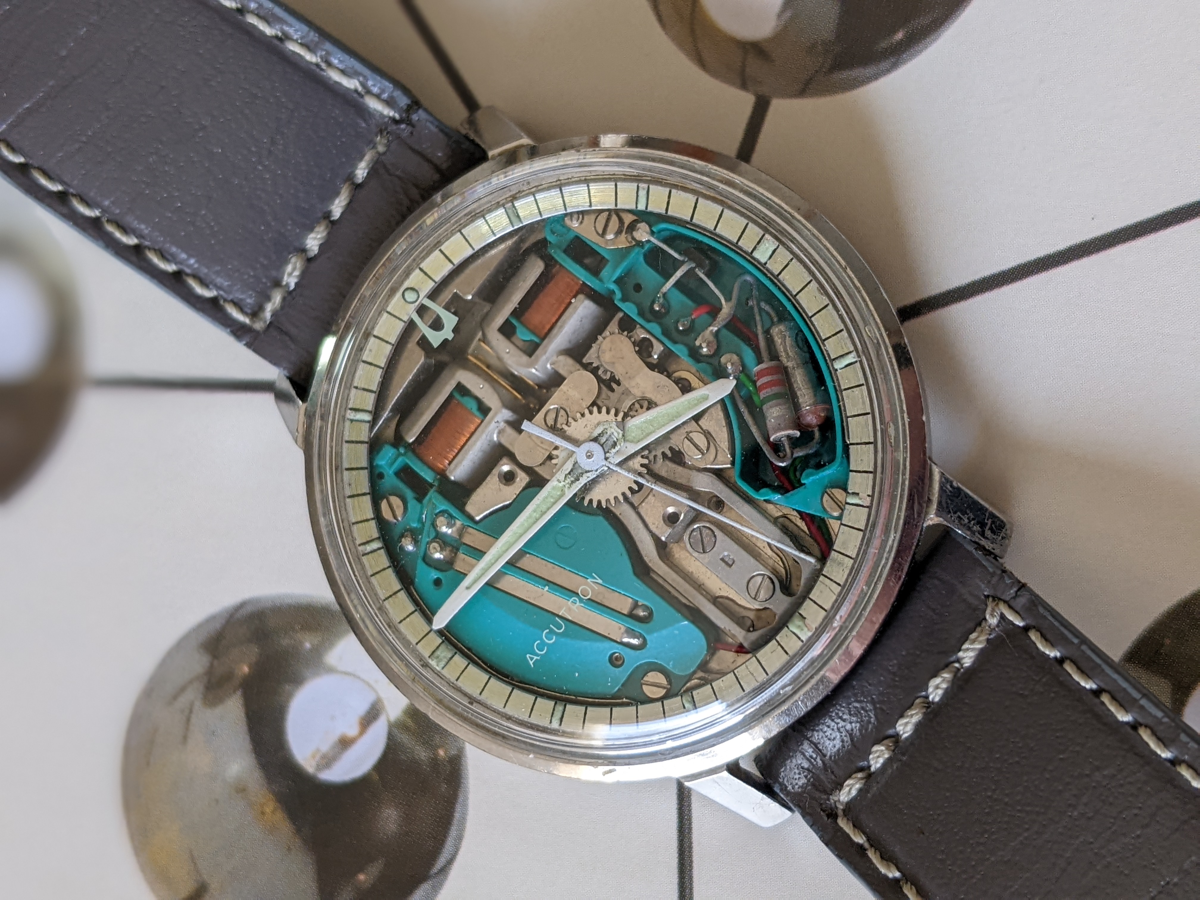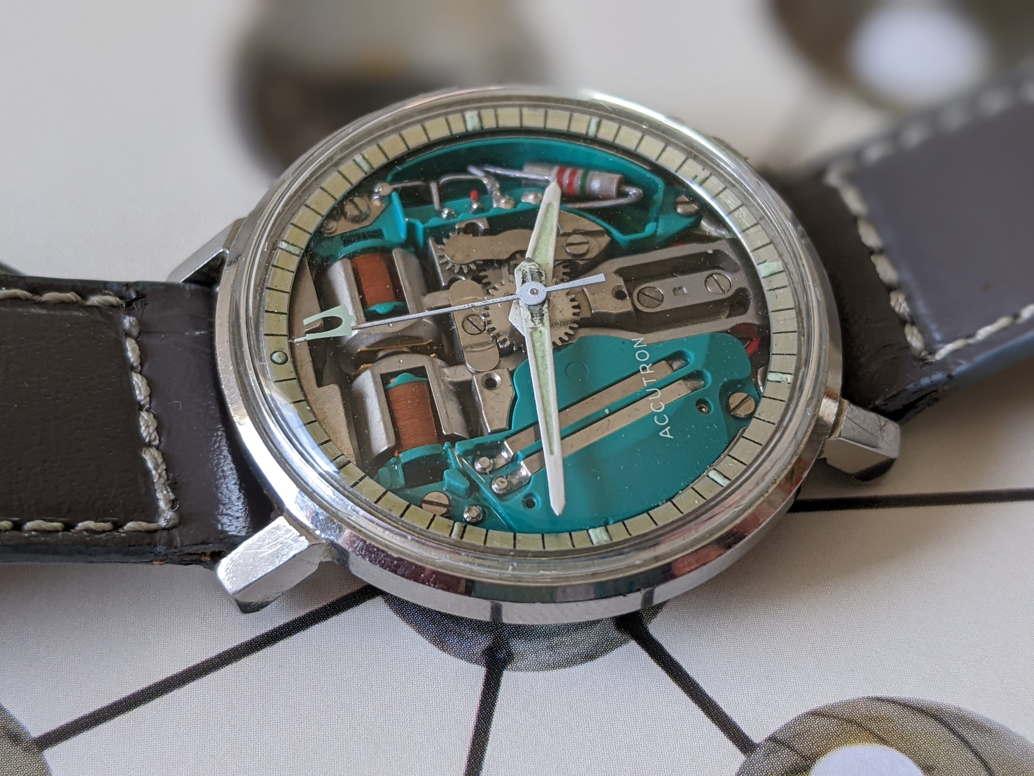 ·Here we have a 1966 Accutron Spaceview 214, Chapter Ring style. This is an original Spaceview, not a conversion that you see many of. It keeps good time, although I do not know the service history. The case measures 34.75mm in diameter, 18mm lug width. It has the initials "MG" engraved on the back. I have it on a vintage gray Kreisler 11/16" strap. I'm asking $525 or best offer. Returns accepted if not as described. Plenty of positive feedback on here and other forums. Please PM me for inquires.