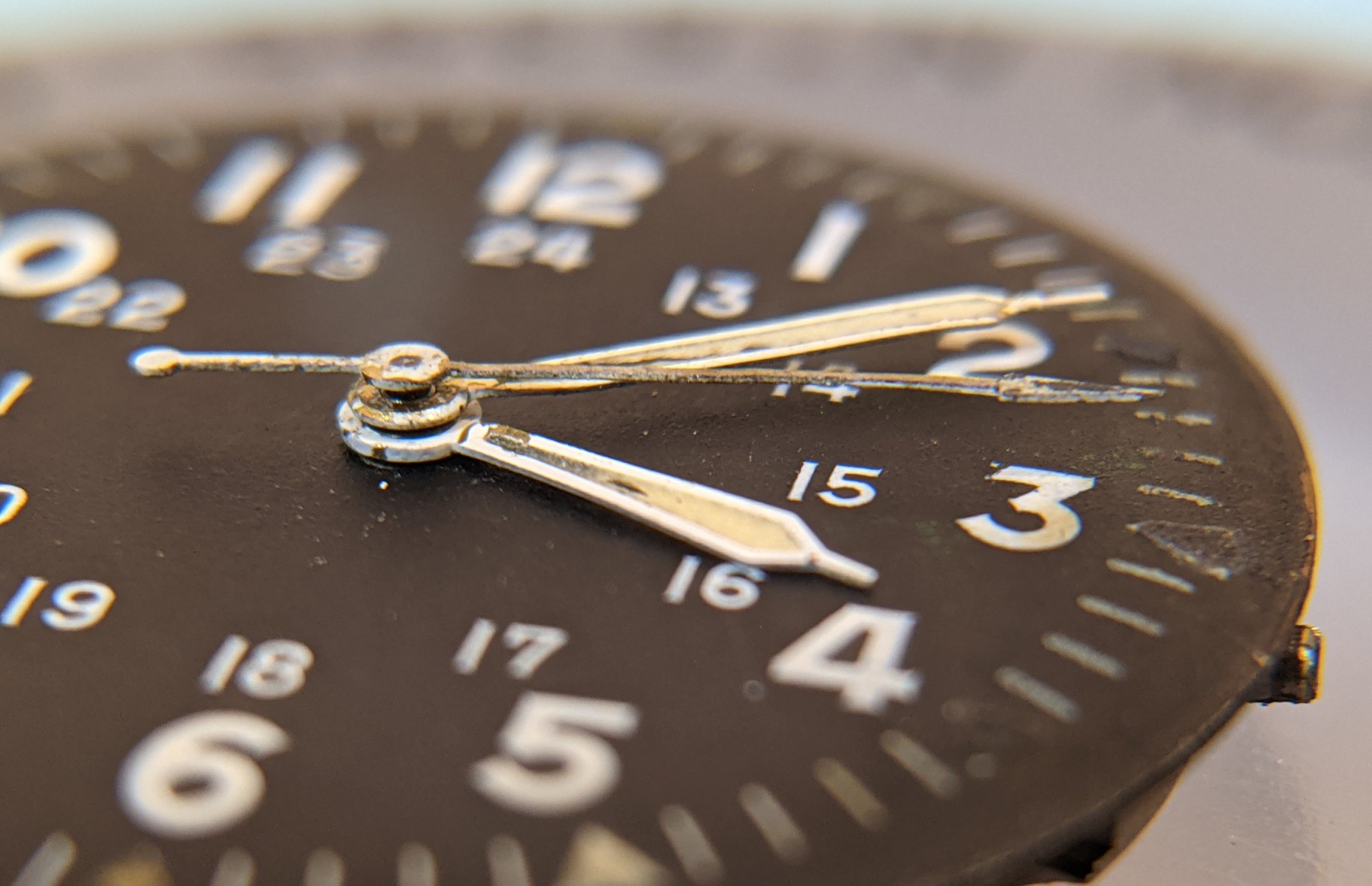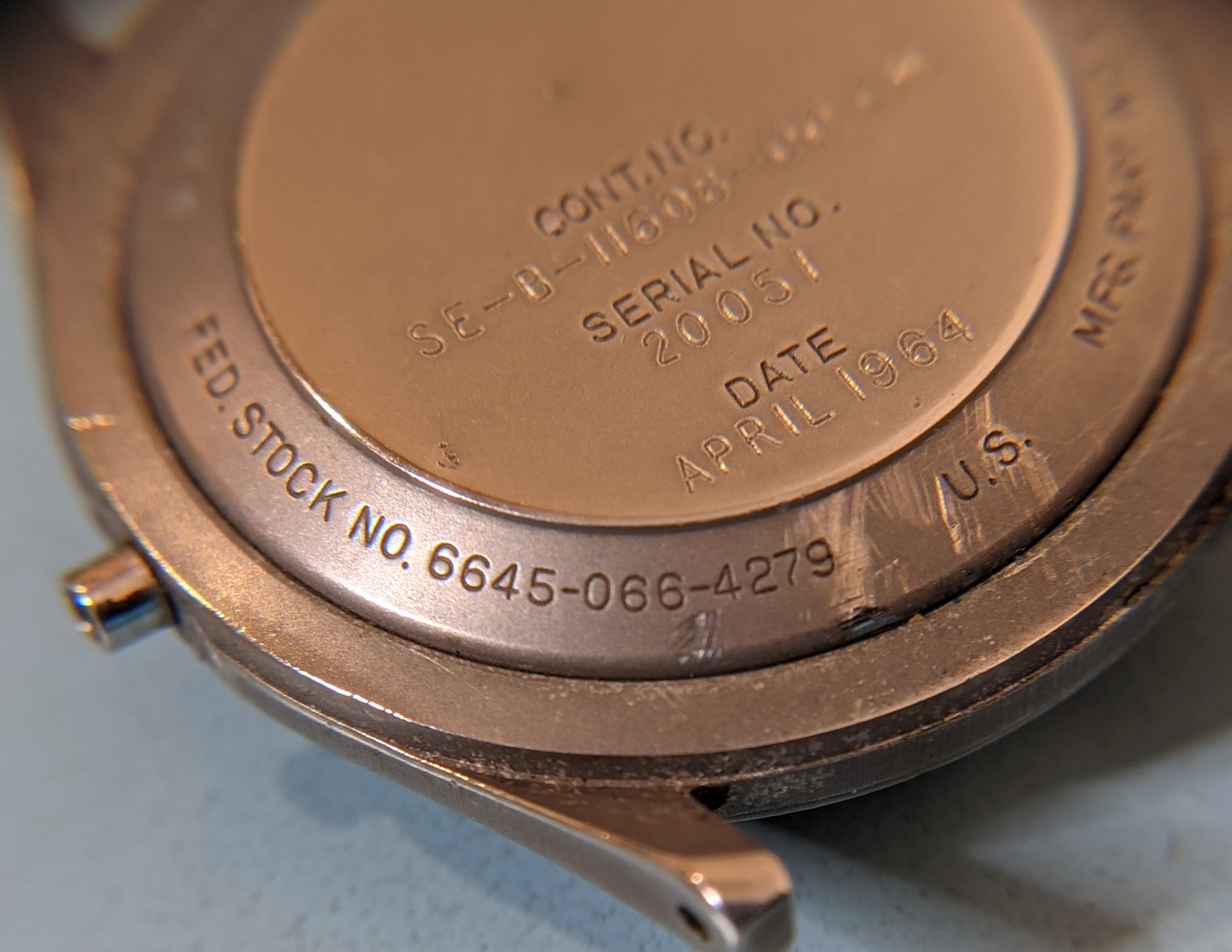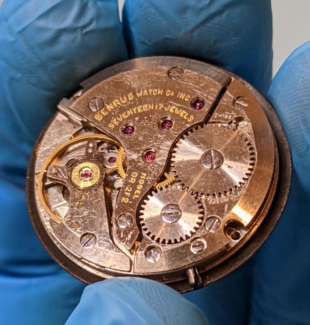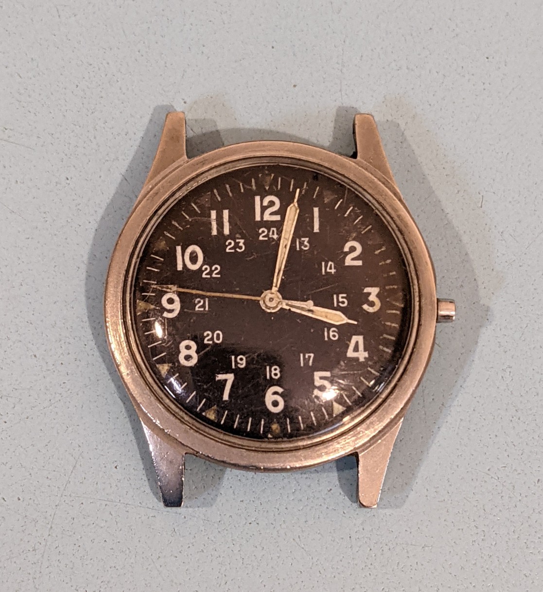 路$22 from an estate sale, missing crown & male-half of the split stem. Not running at the time of purchase, but that was due to the seconds hand being fouled by the crystal. Started right up upon removing the crystal.