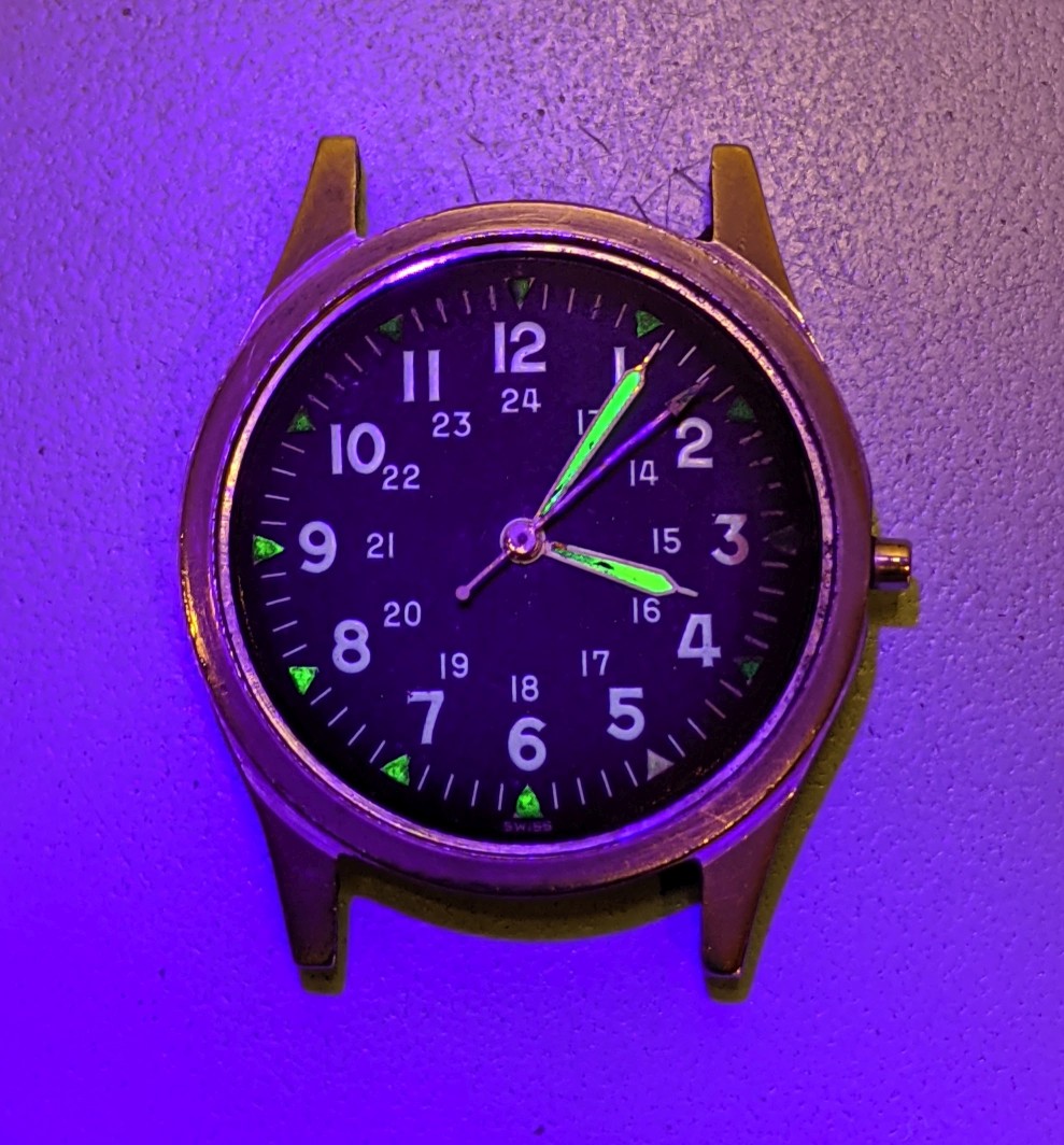 Was surprised that it did not set off the Geiger Counter, but I expect it has been (crudely) relumed at some point in the distant past. Glows under the UV, but I'll plan on cleaning this up & try & get it looking better.