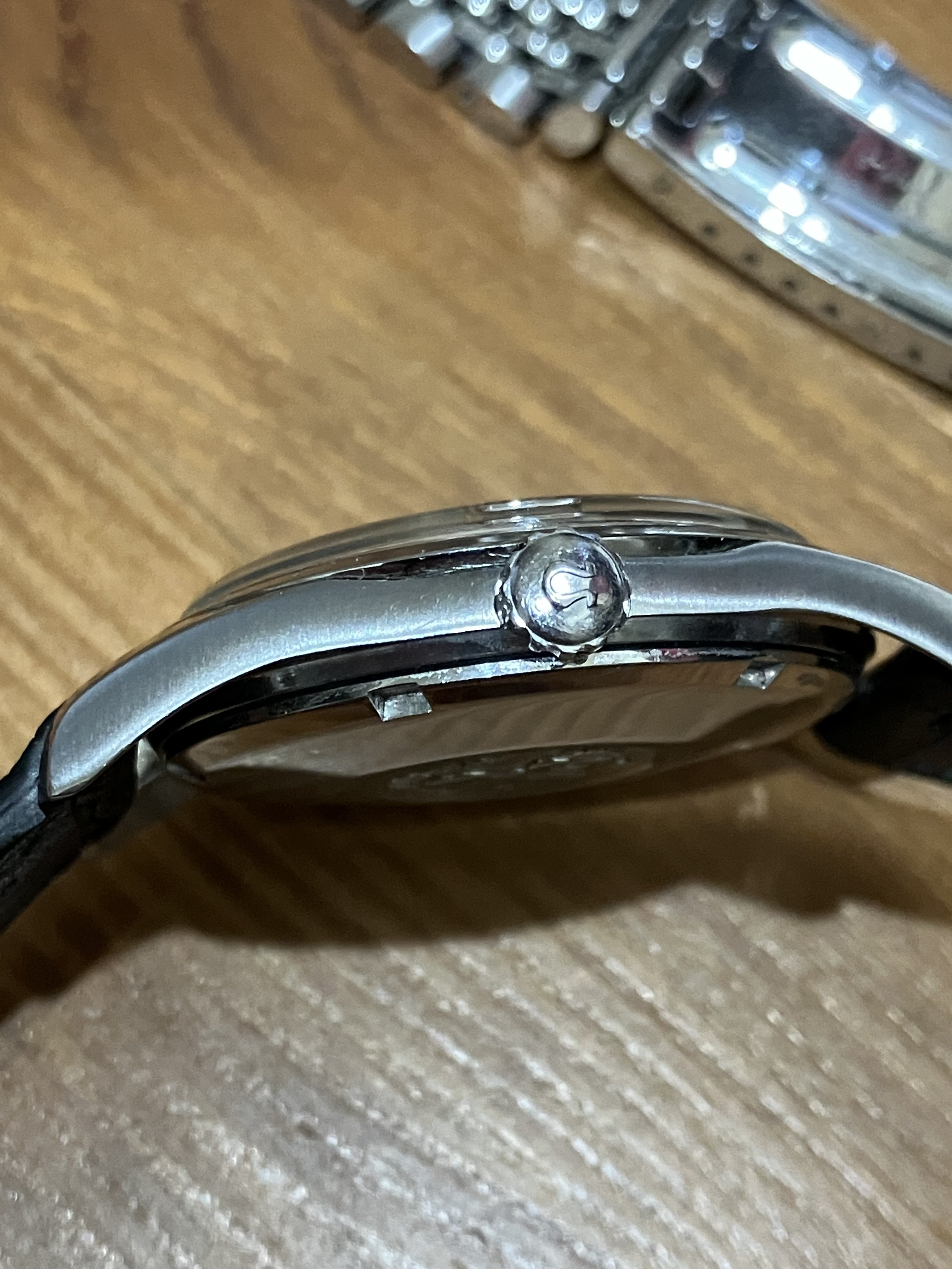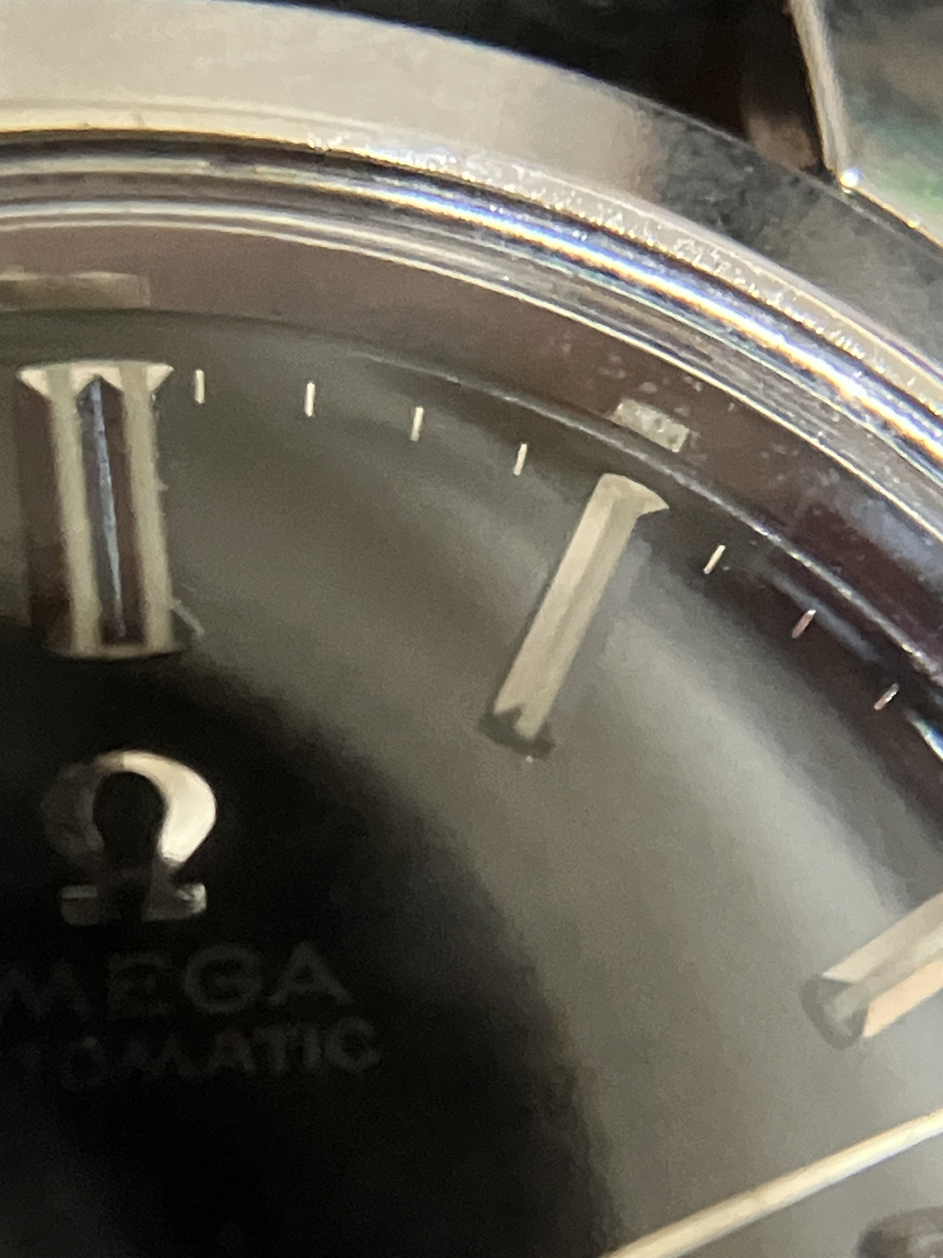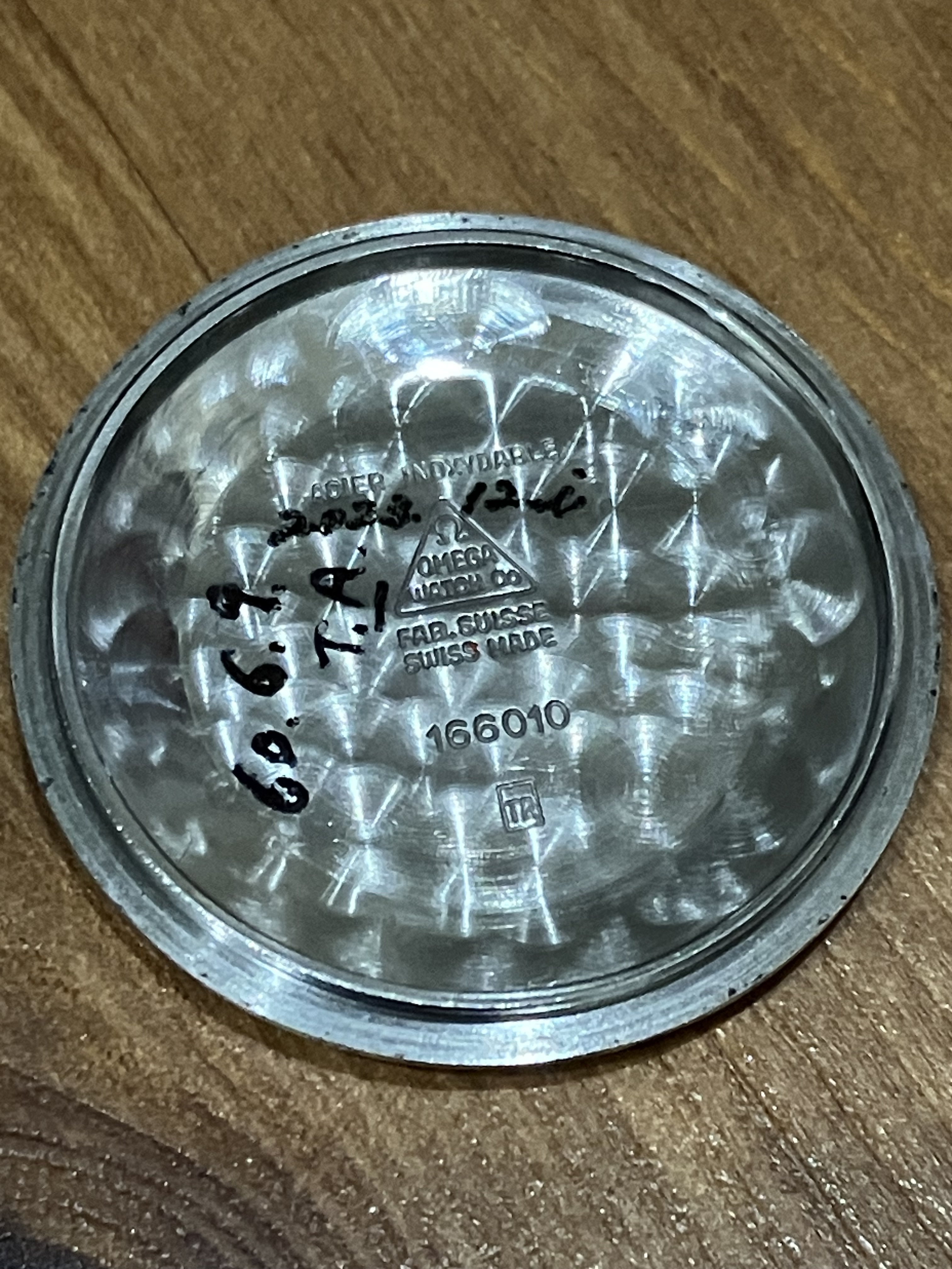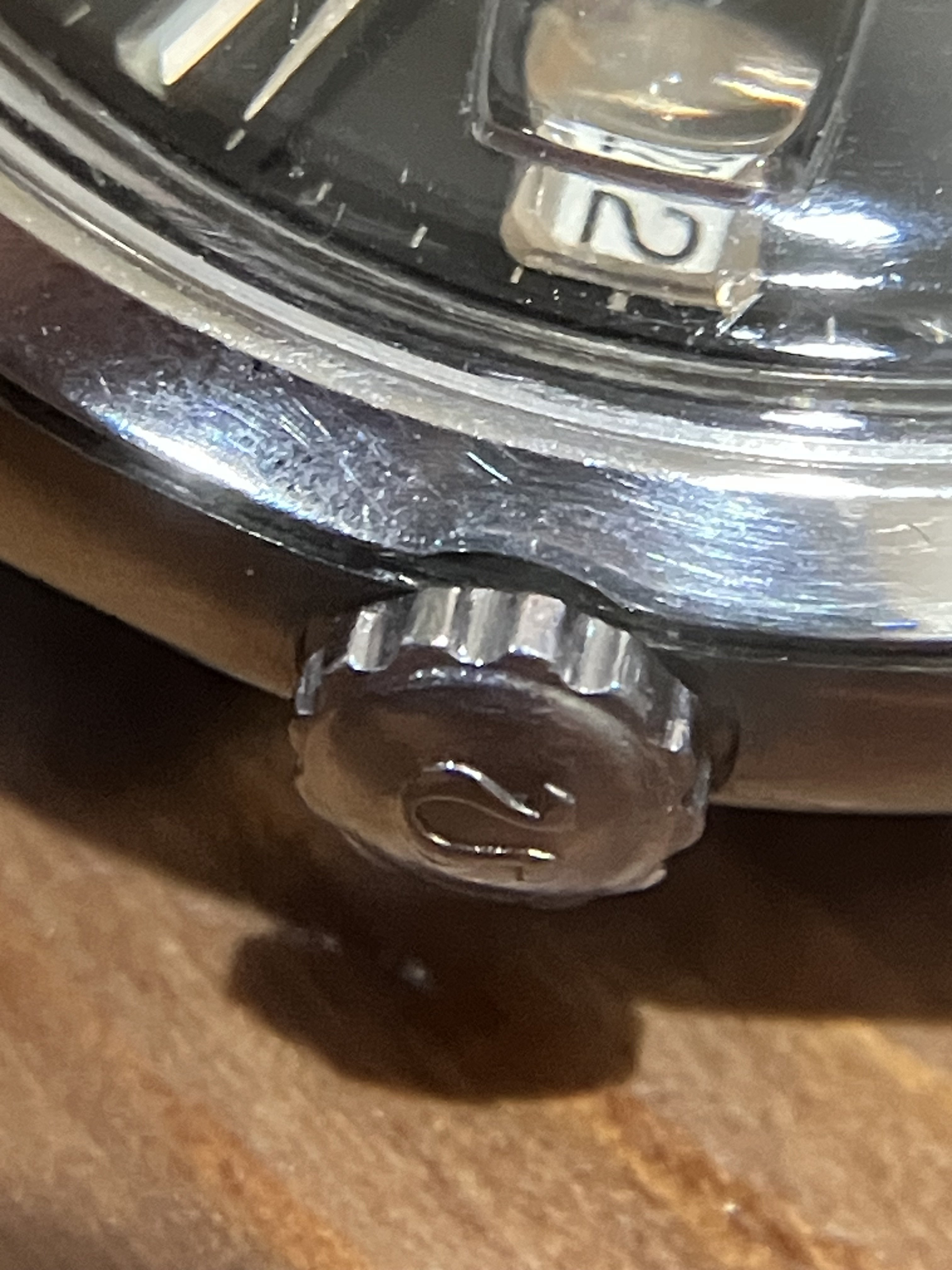 The 166.010 is a classic design, which I’ve owned a number of examples of. I was stoked to find this one, which not only has a genuinely scarce original black dial with no deterioration, but also sports the model’s original thin scalloped crown. Ikeda-san at Ayase Opt in Tokyo painstakingly shored up the packing on this no-longer-available crown to make it more water-resistant. The case may be unpolished, and has visible vertical brushing on the sides. I have tried to document the few dings I can see through a loupe. The glossy dial is a challenge to photograph but seems to be in wonderful shape. The hands have become a little grainy when viewed under magnification. The crystal has the Omega logo in the center and has no significant scratches—the white visible in the photos are all lint and/or rampant reflections from the dial and the cyclops lens. The cyclops crystal is not considered correct for the 166.010, but is extremely prevalent on these models in Japan. One more rare feature: Look at all the zeroes in the serial number.
