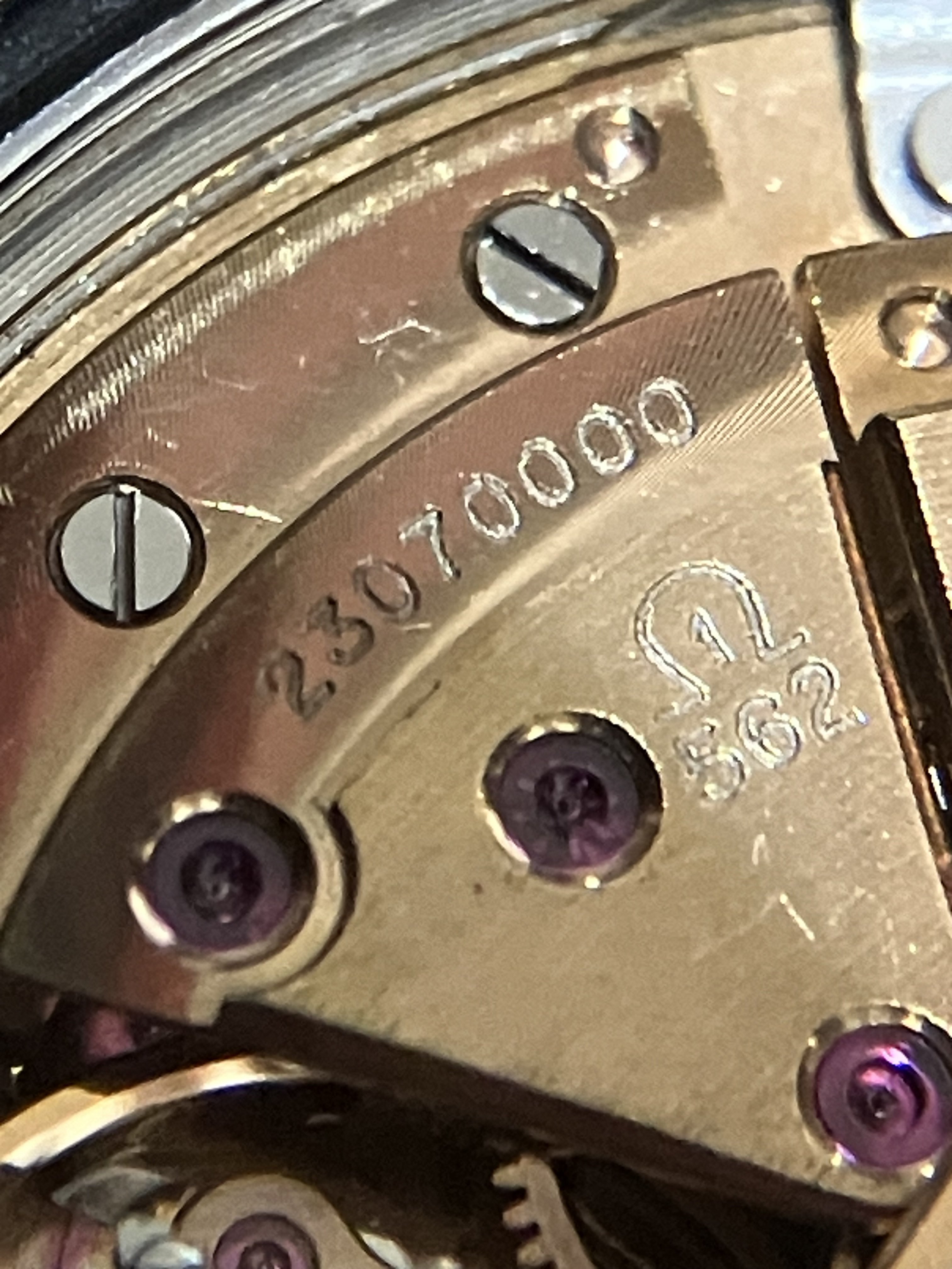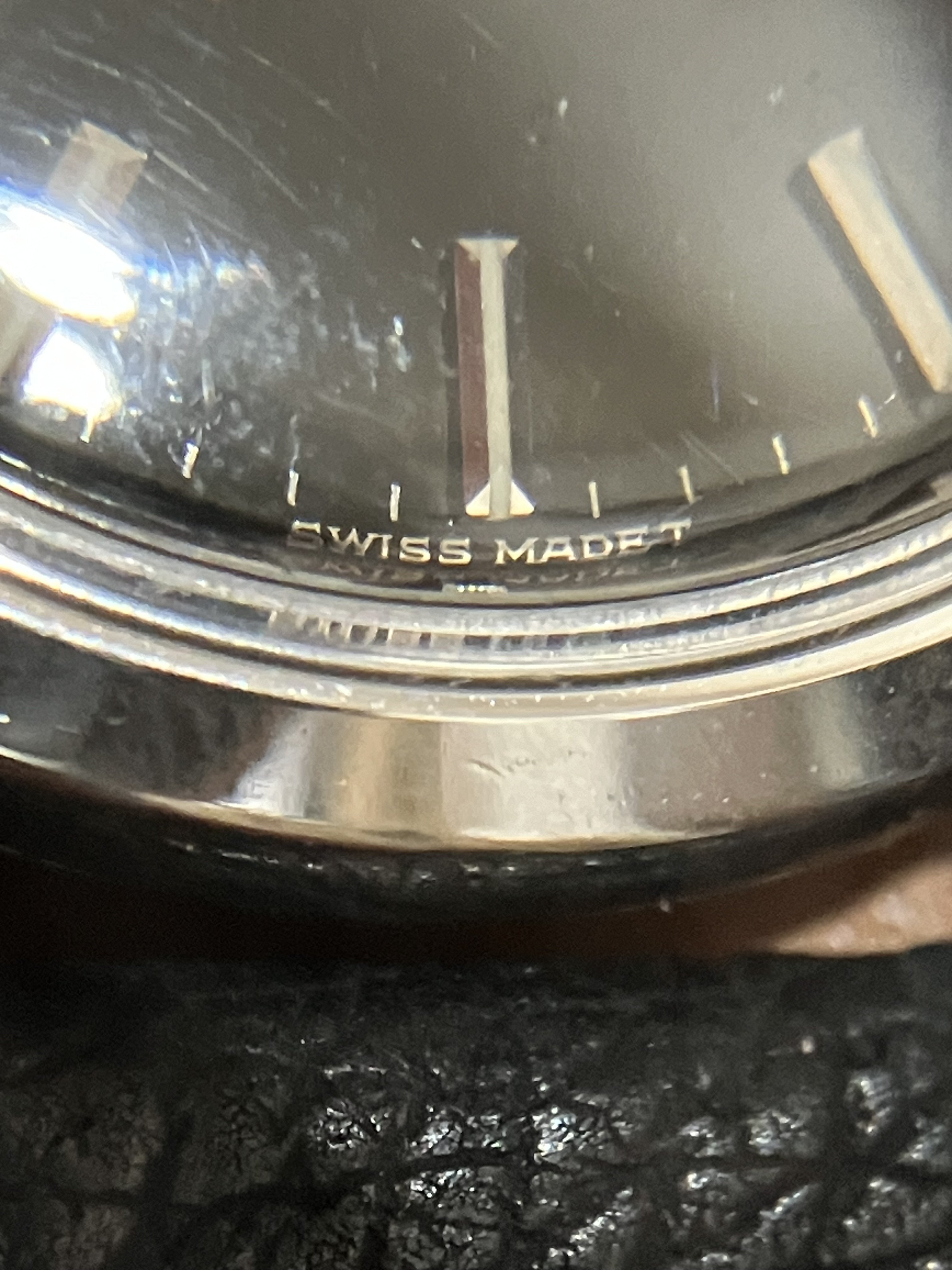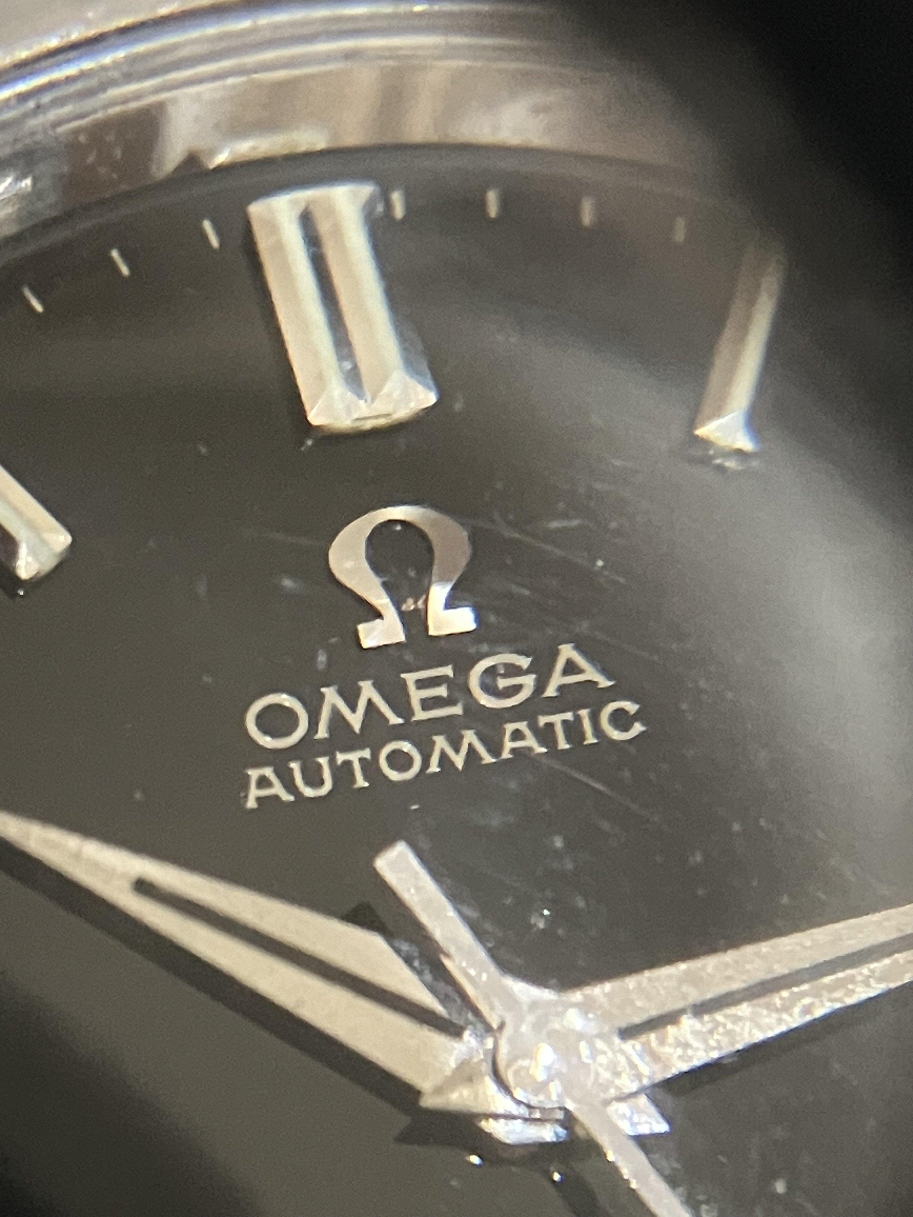The 166.010 is a classic design, which I’ve owned a number of examples of. I was stoked to find this one, which not only has a genuinely scarce original black dial with no deterioration, but also sports the model’s original thin scalloped crown. Ikeda-san at Ayase Opt in Tokyo painstakingly shored up the packing on this no-longer-available crown to make it more water-resistant. The case may be unpolished, and has visible vertical brushing on the sides. I have tried to document the few dings I can see through a loupe. The glossy dial is a challenge to photograph but seems to be in wonderful shape. The hands have become a little grainy when viewed under magnification. The crystal has the Omega logo in the center and has no significant scratches—the white visible in the photos are all lint and/or rampant reflections from the dial and the cyclops lens. The cyclops crystal is not considered correct for the 166.010, but is extremely prevalent on these models in Japan. One more rare feature: Look at all the zeroes in the serial number.