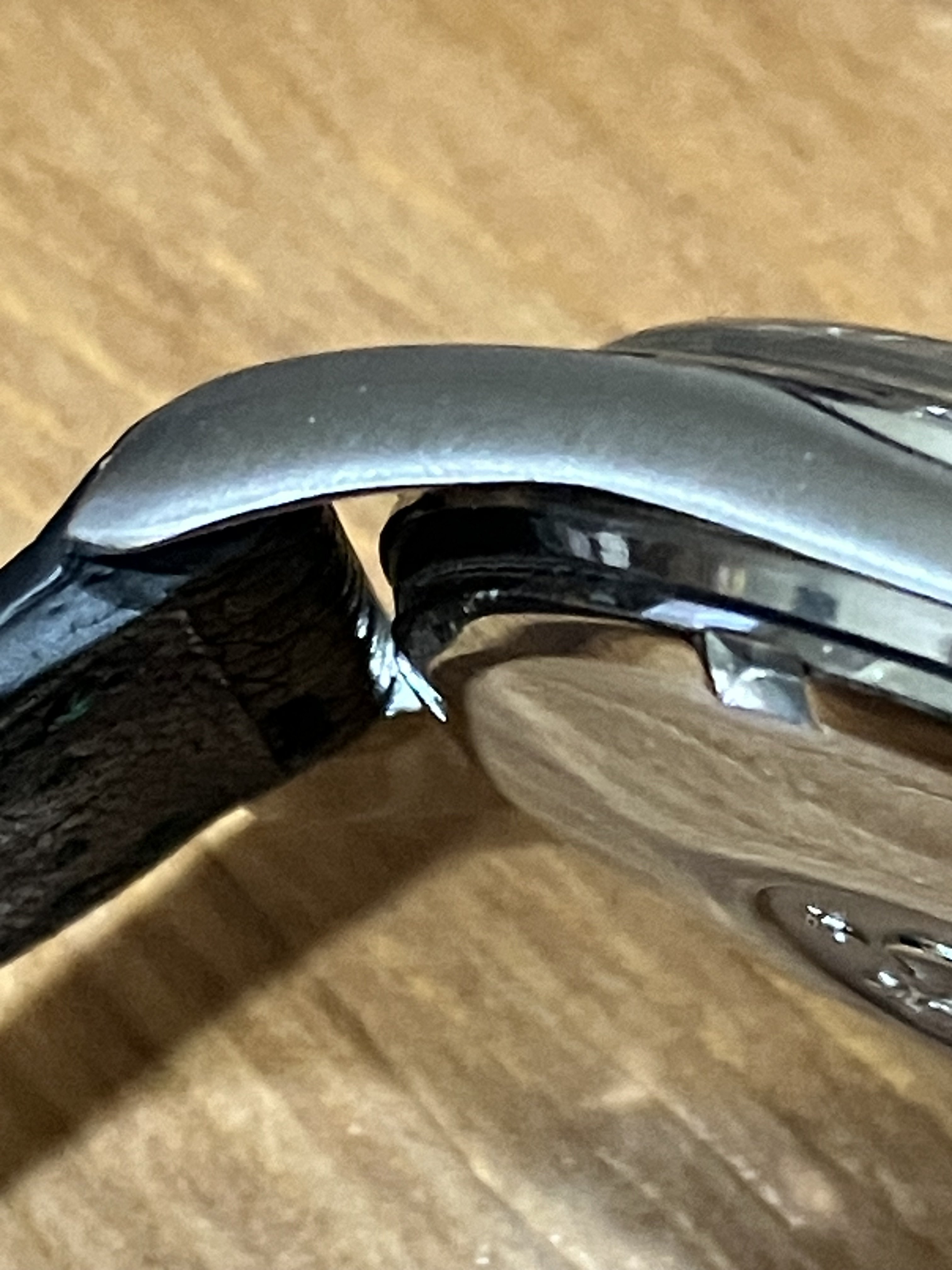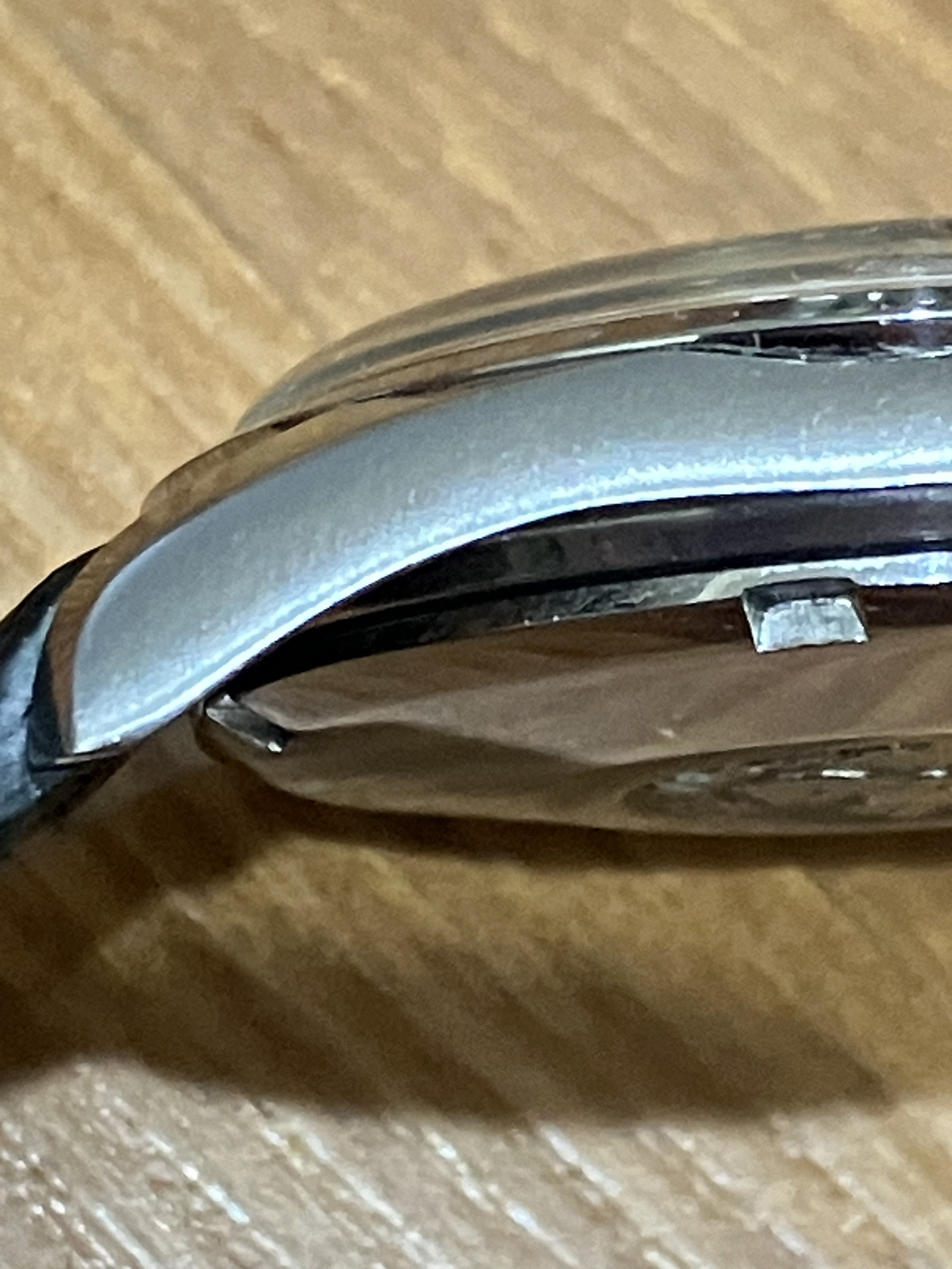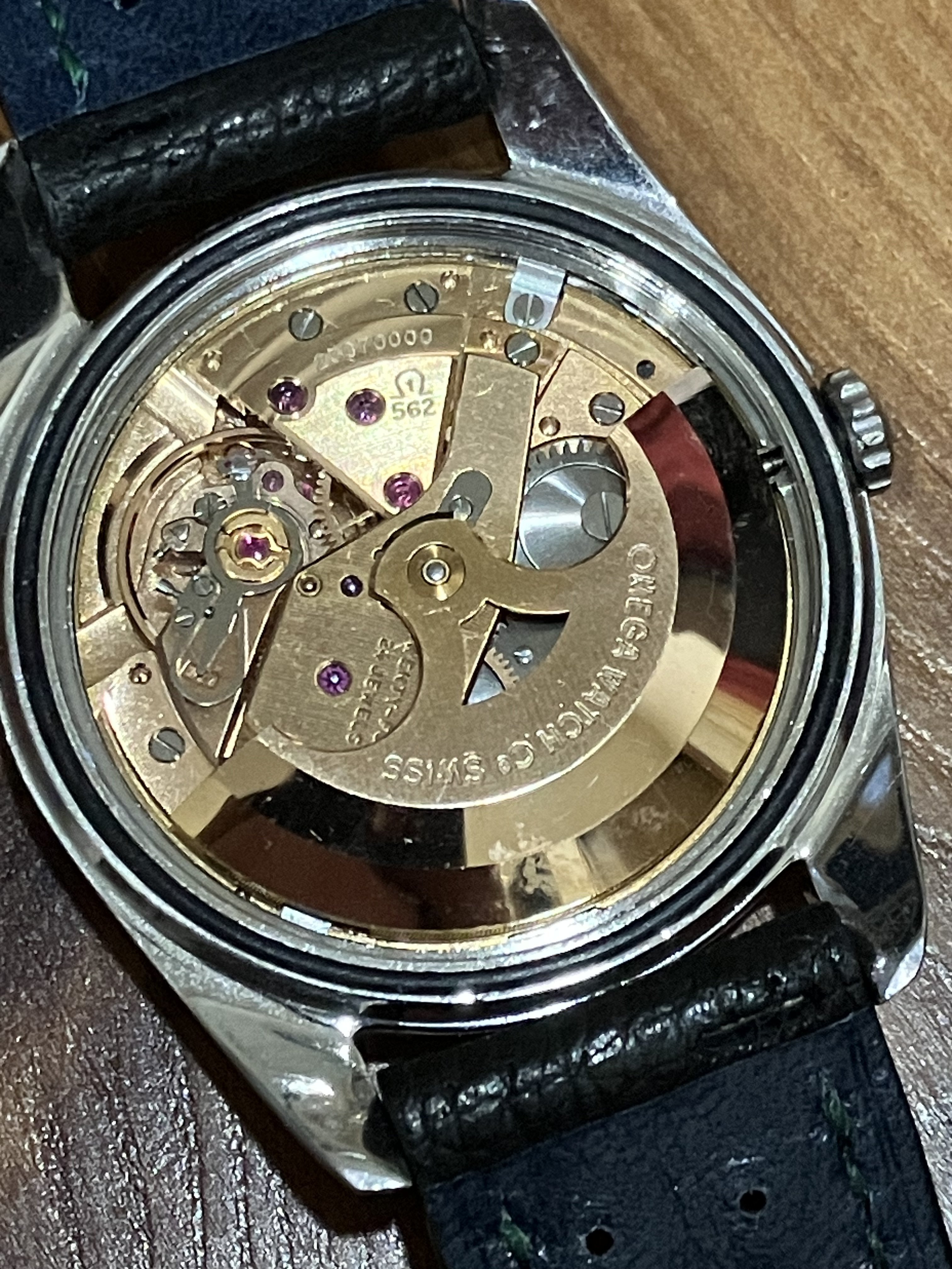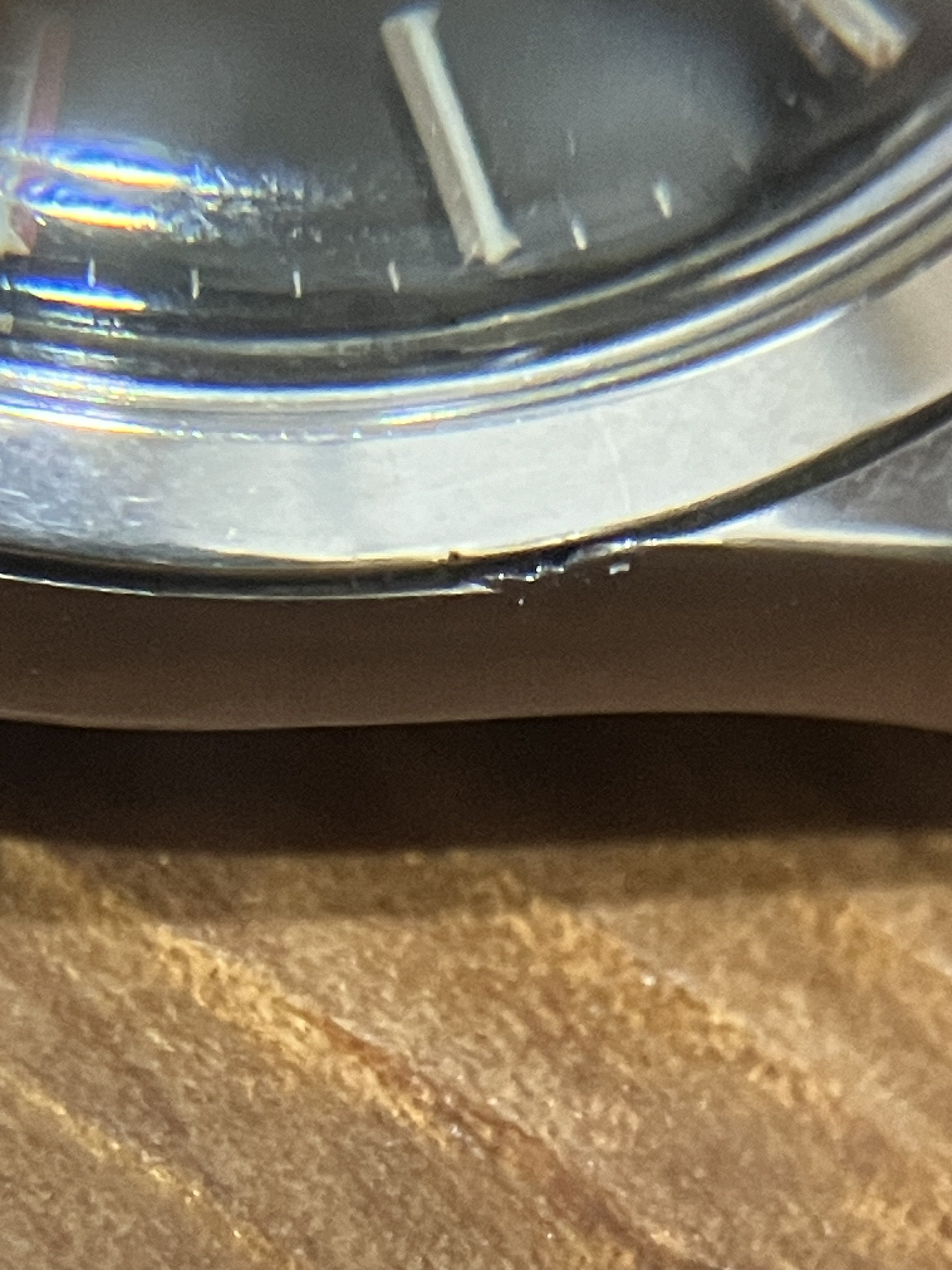 The 166.010 is a classic design, which I’ve owned a number of examples of. I was stoked to find this one, which not only has a genuinely scarce original black dial with no deterioration, but also sports the model’s original thin scalloped crown. Ikeda-san at Ayase Opt in Tokyo painstakingly shored up the packing on this no-longer-available crown to make it more water-resistant. The case may be unpolished, and has visible vertical brushing on the sides. I have tried to document the few dings I can see through a loupe. The glossy dial is a challenge to photograph but seems to be in wonderful shape. The hands have become a little grainy when viewed under magnification. The crystal has the Omega logo in the center and has no significant scratches—the white visible in the photos are all lint and/or rampant reflections from the dial and the cyclops lens. The cyclops crystal is not considered correct for the 166.010, but is extremely prevalent on these models in Japan. One more rare feature: Look at all the zeroes in the serial number.