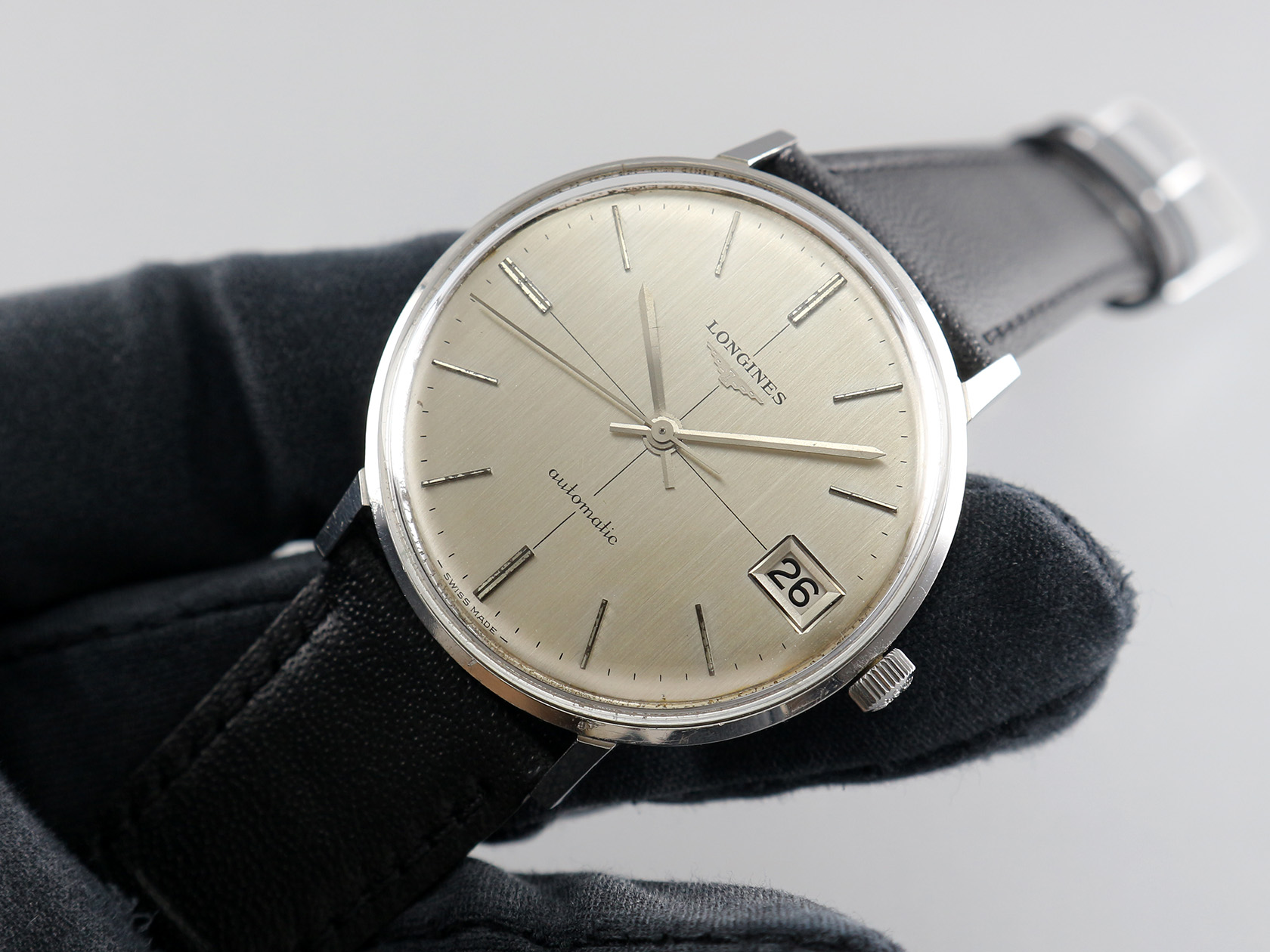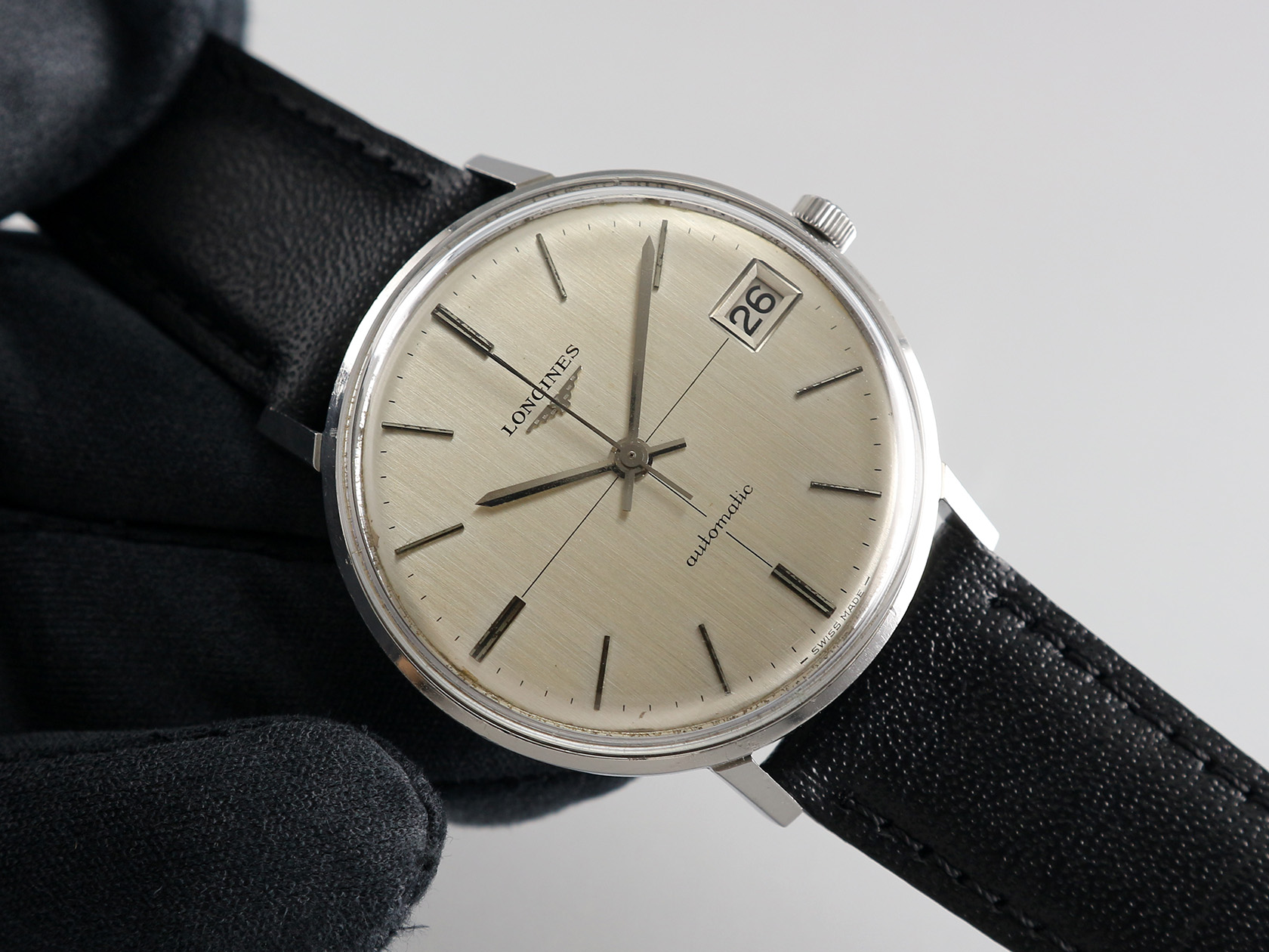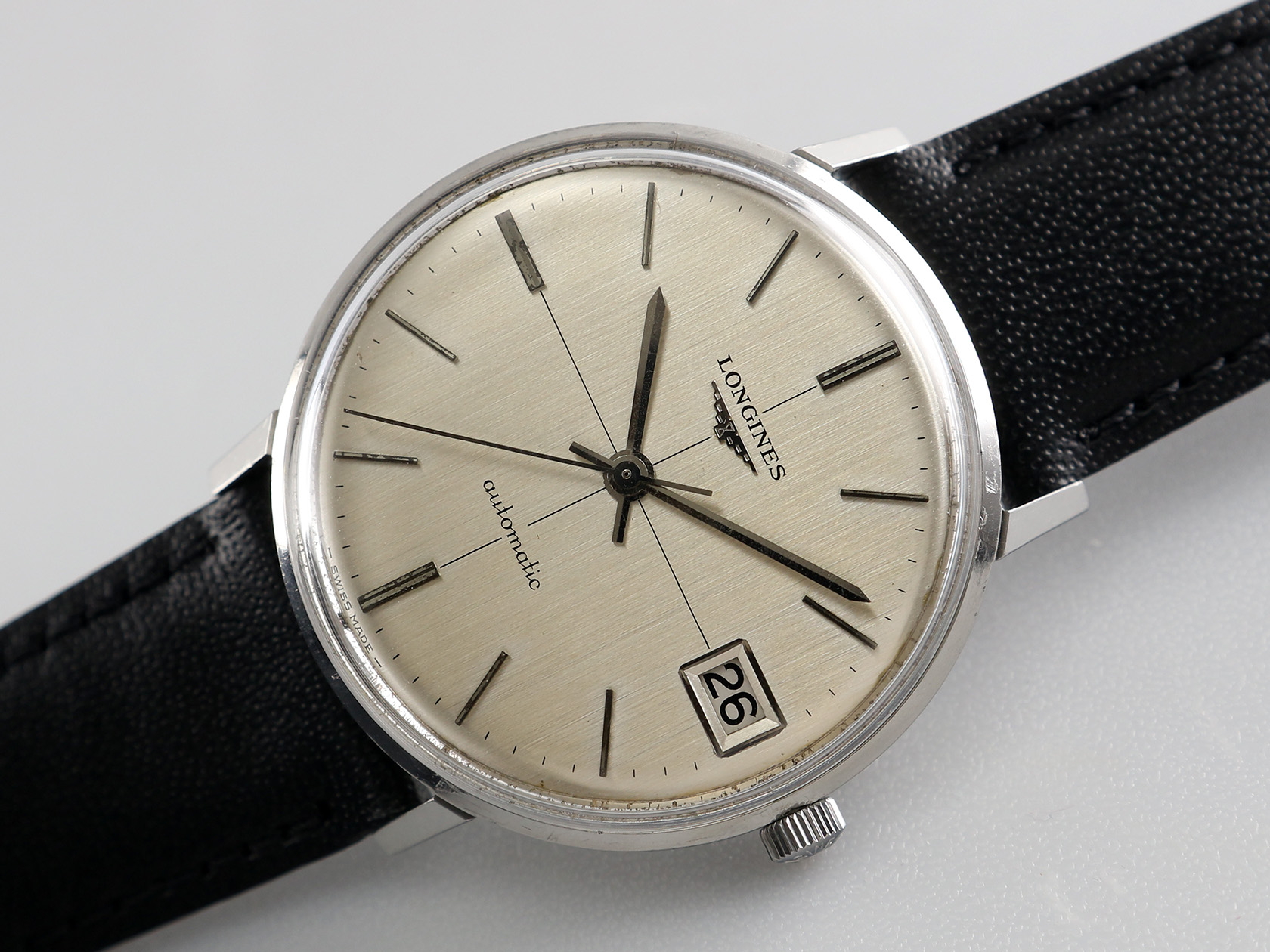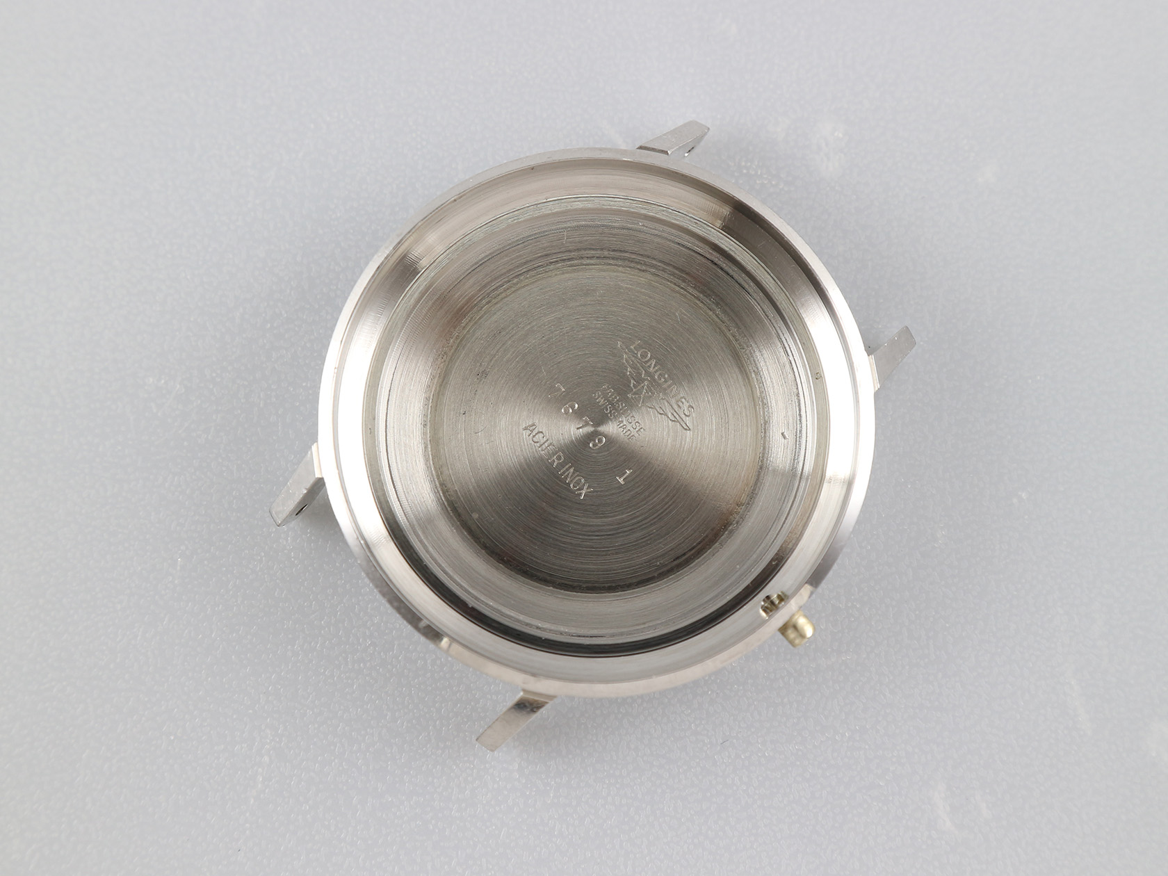 ·Up for sale is a very nice Longines dress watch Ref. 7679. The silver brushed dial + cross-hair looks elegant. The case is unpolished and in good shape plus the original crown. It is measures 35.8mm wide without crown and 39.8mm lug to lug, lug width is 19mm. Inside is the Longines cal. 345, service history unknown but still running strong & keeping time.