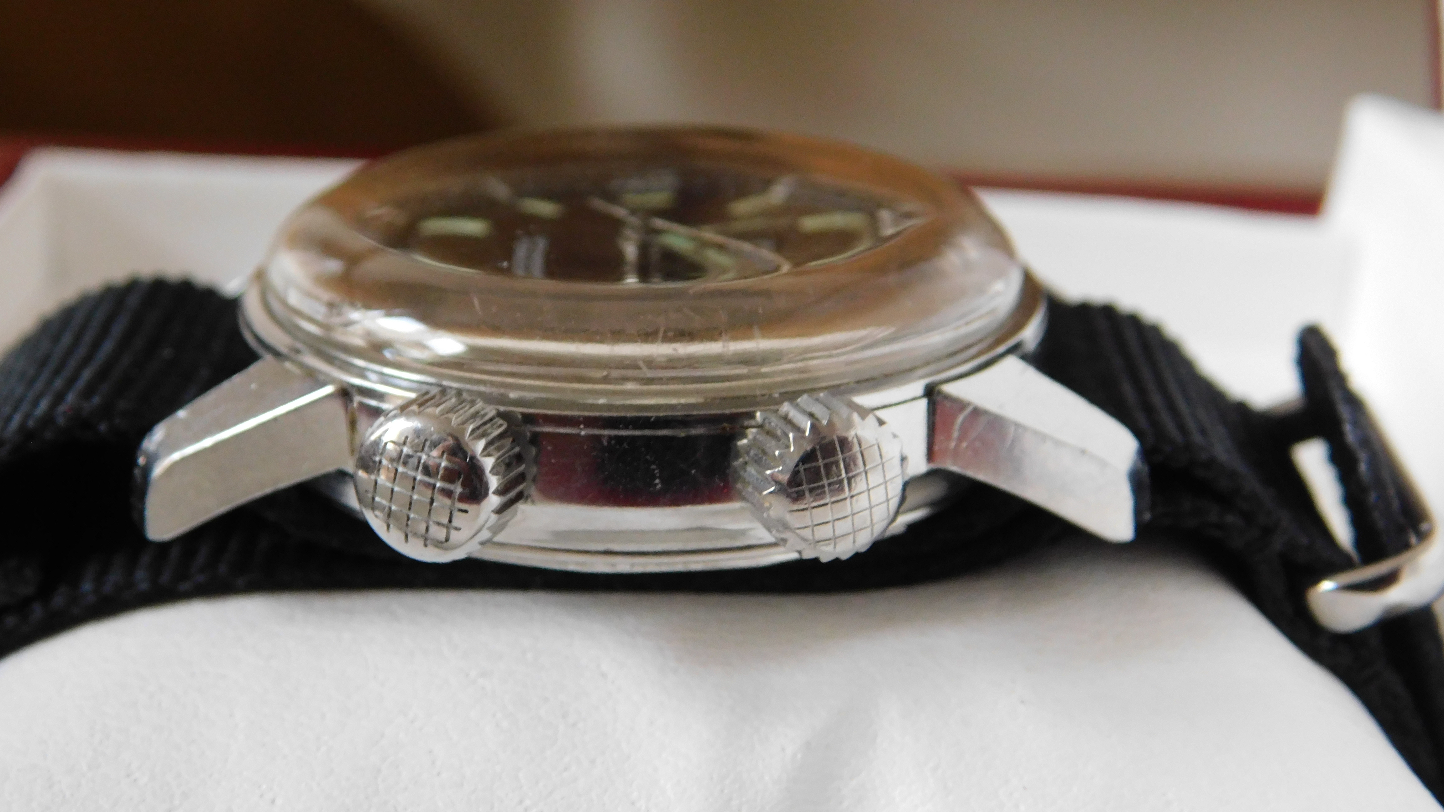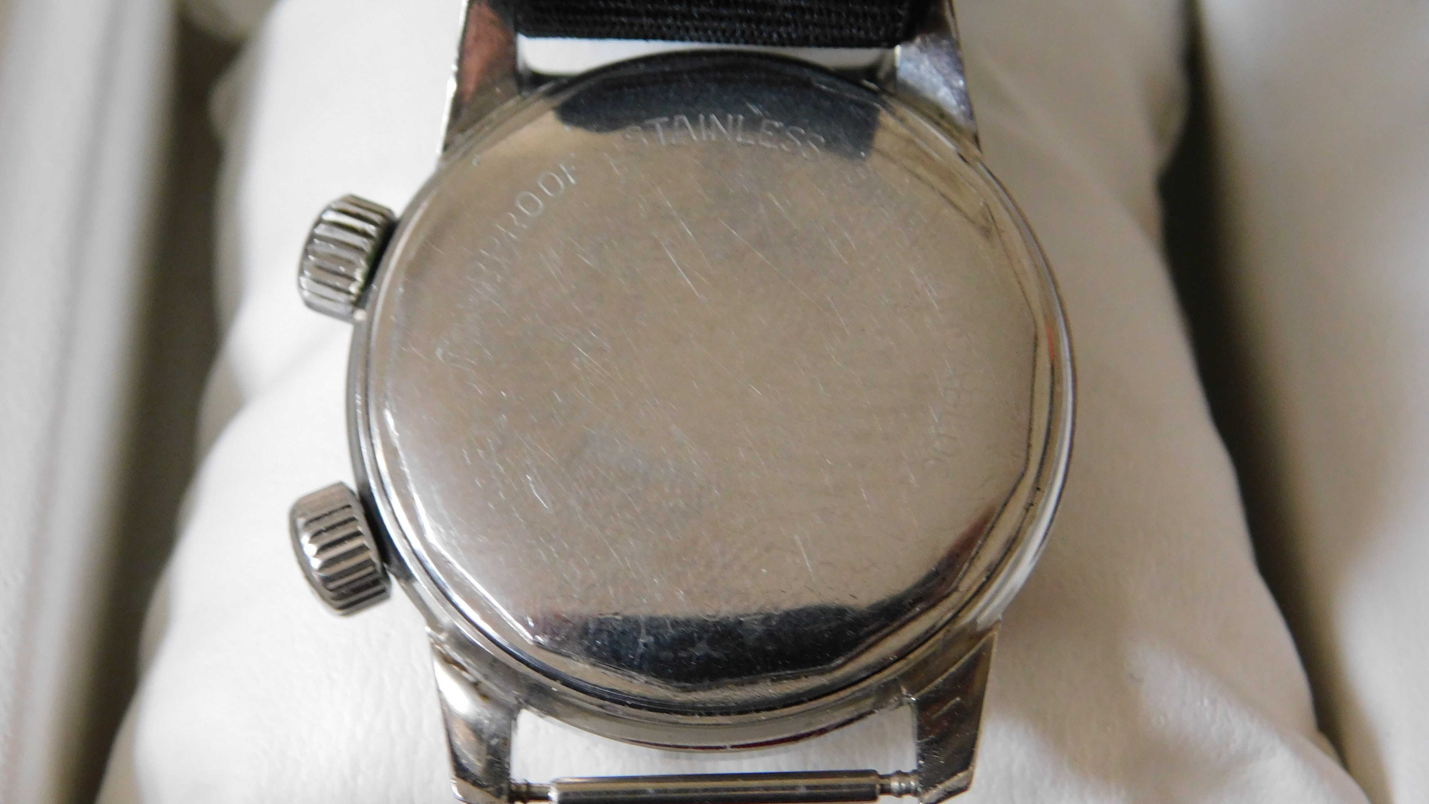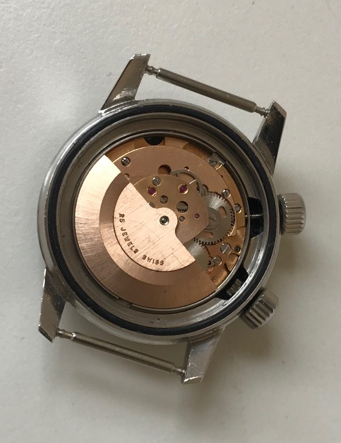 Glossy black dial is lovely, lugs are sharp, case is unpolished. Caseback shows signs of normal wear, but the lightly-etched lettering is still visible. These casebacks tend to be quite plain, though sometimes the ESPA "diver's helmet" is on the outside, rather than the inside, as in this case.