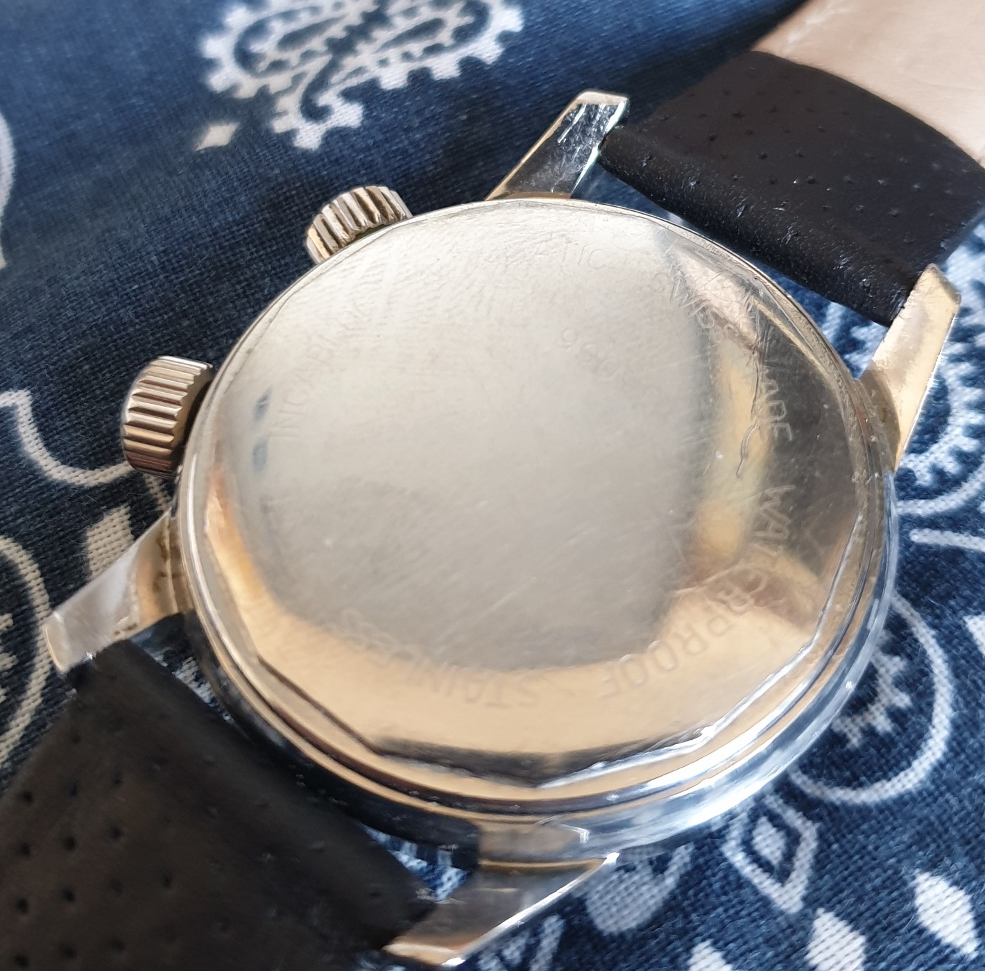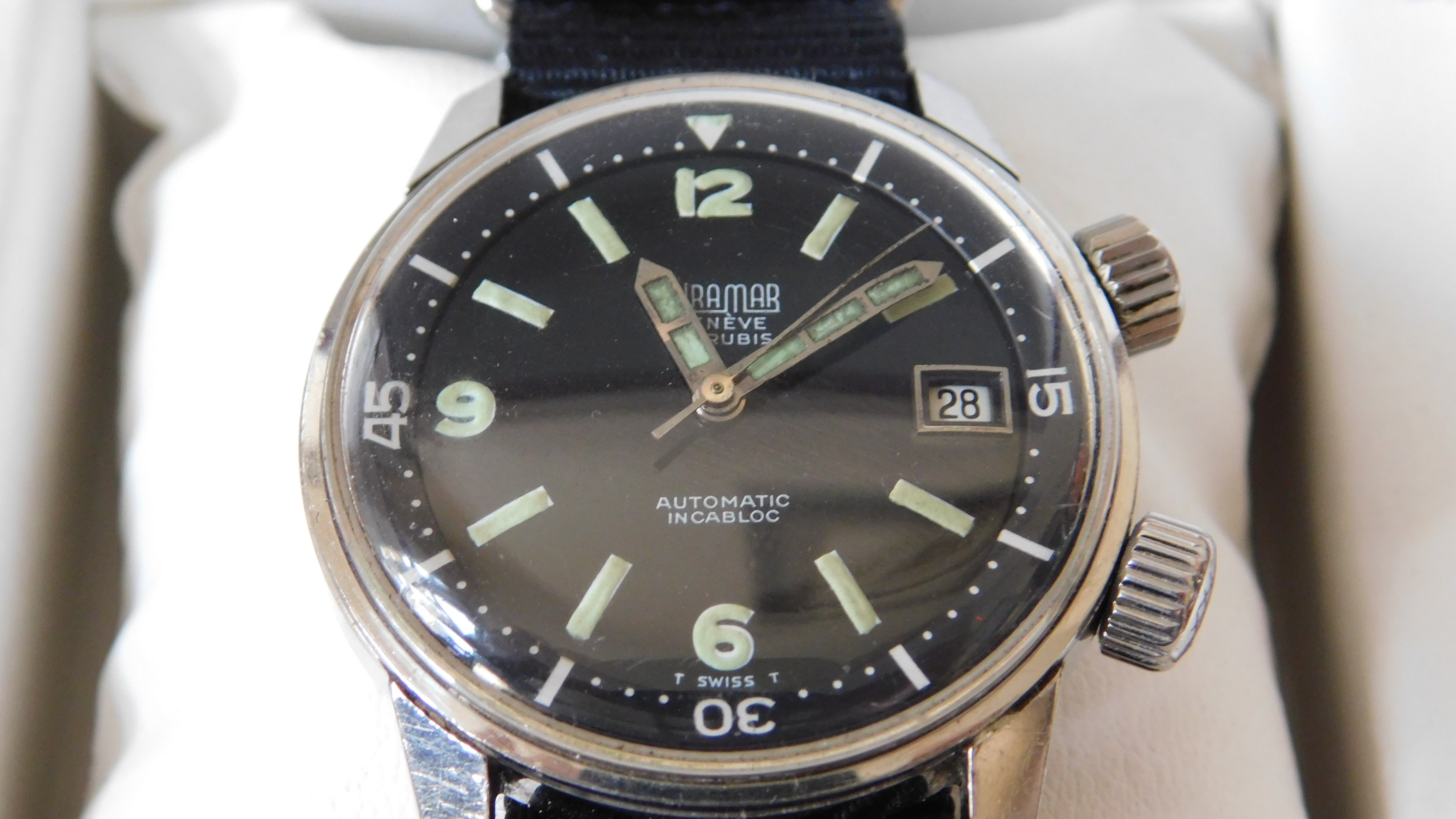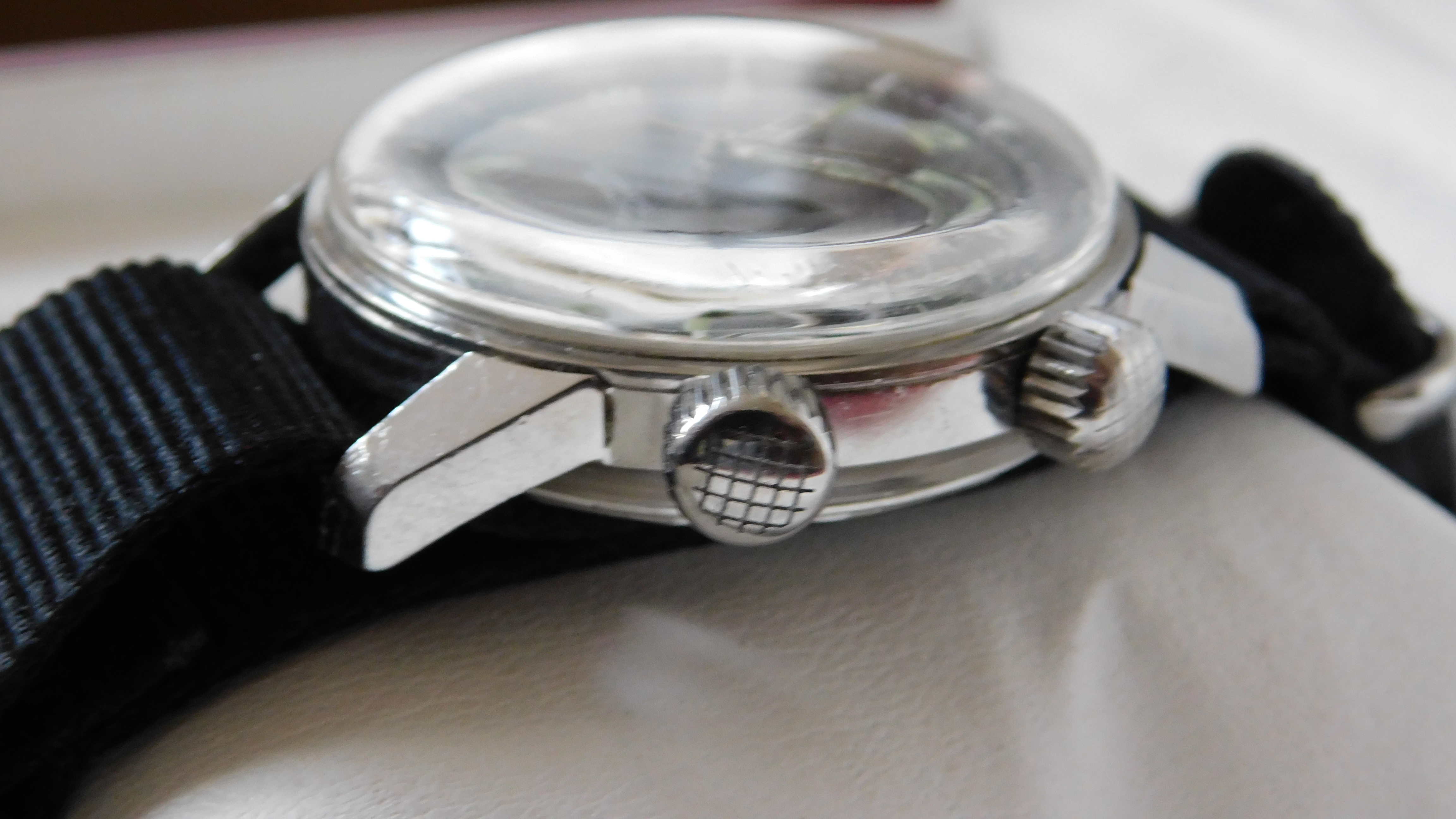 Glossy black dial is lovely, lugs are sharp, case is unpolished. Caseback shows signs of normal wear, but the lightly-etched lettering is still visible. These casebacks tend to be quite plain, though sometimes the ESPA "diver's helmet" is on the outside, rather than the inside, as in this case.