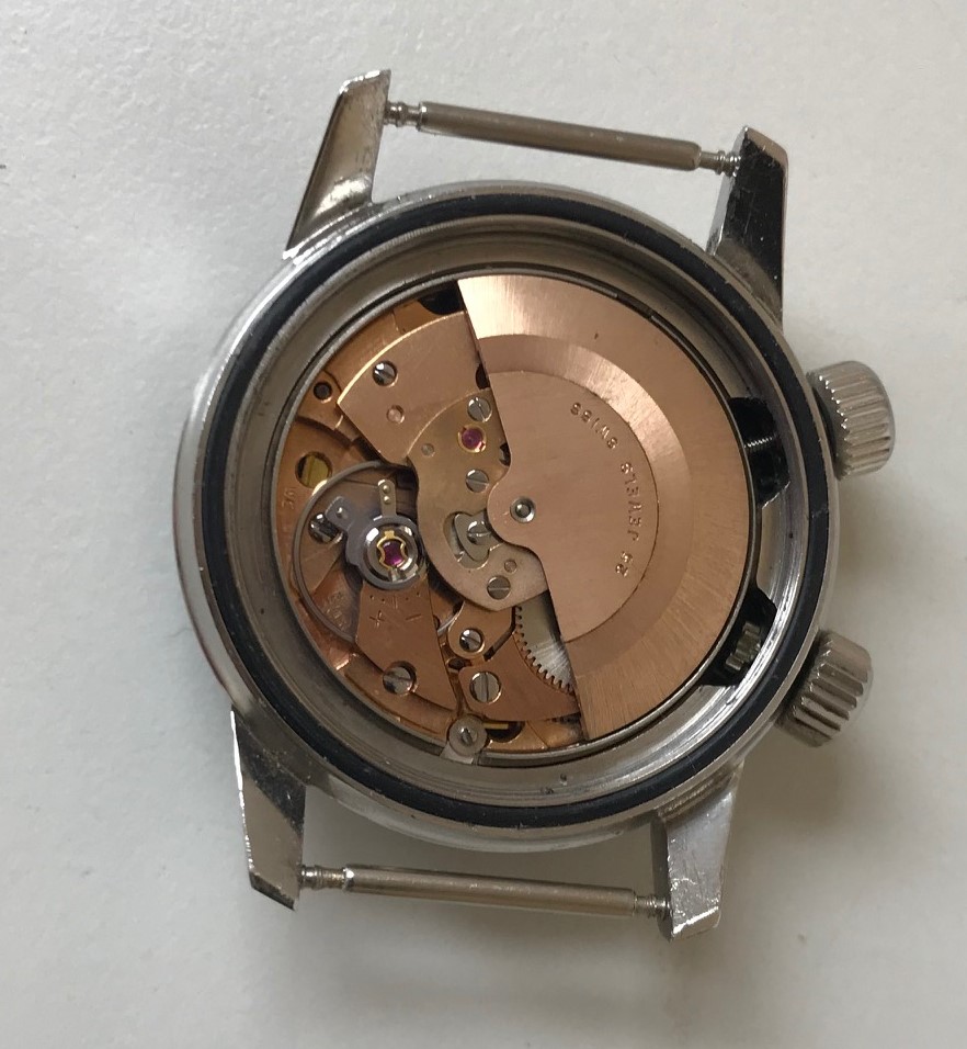 The watch is all original, including dial, hands, lume, domed crystal, and dual cross-hatched crowns. The upper crown, employing a star-shaped gear (visible in the movement pic below) rotates the interior bezel birectionally, while the lower crown winds and sets the watch (including a quickset date feature).