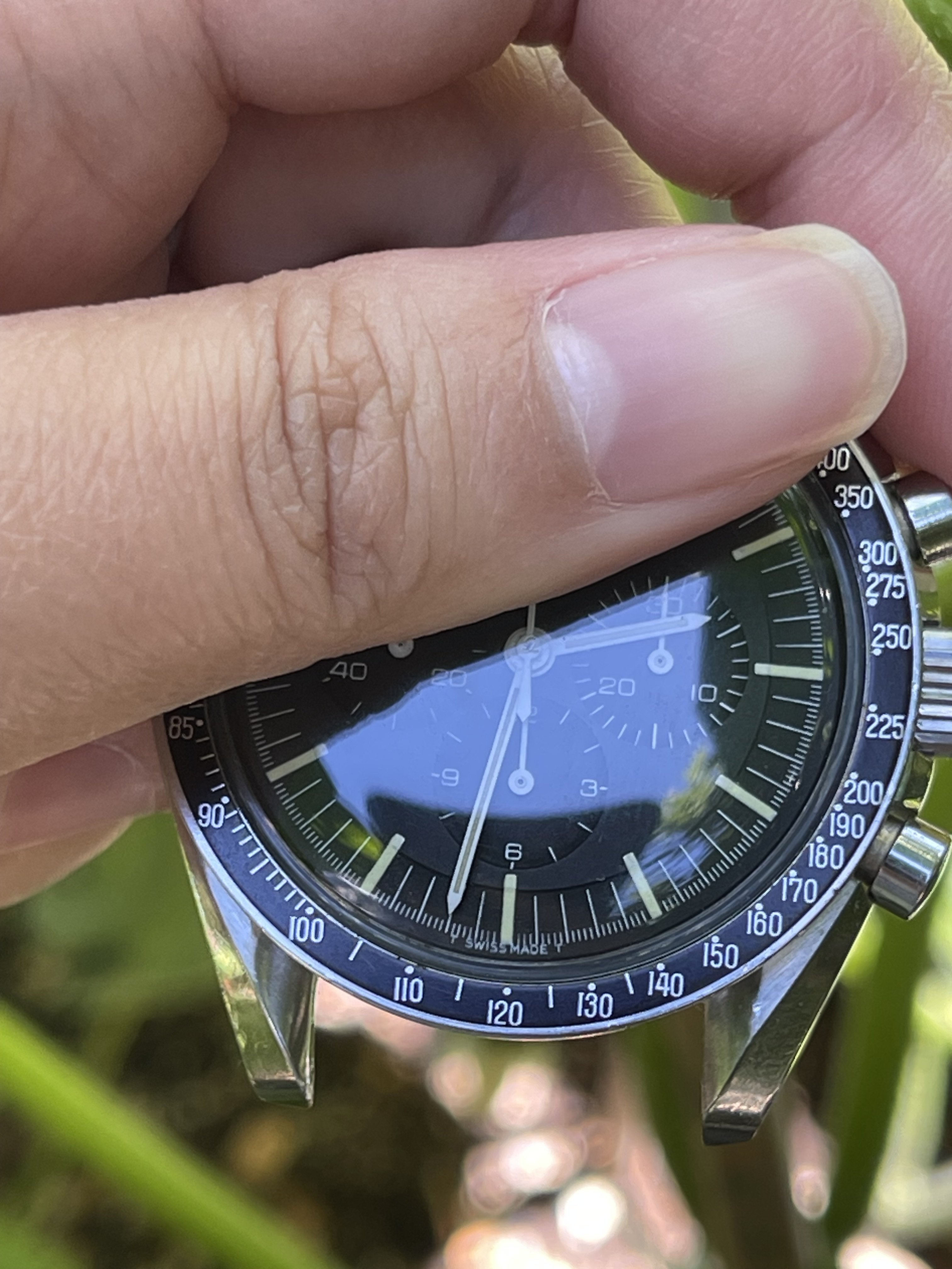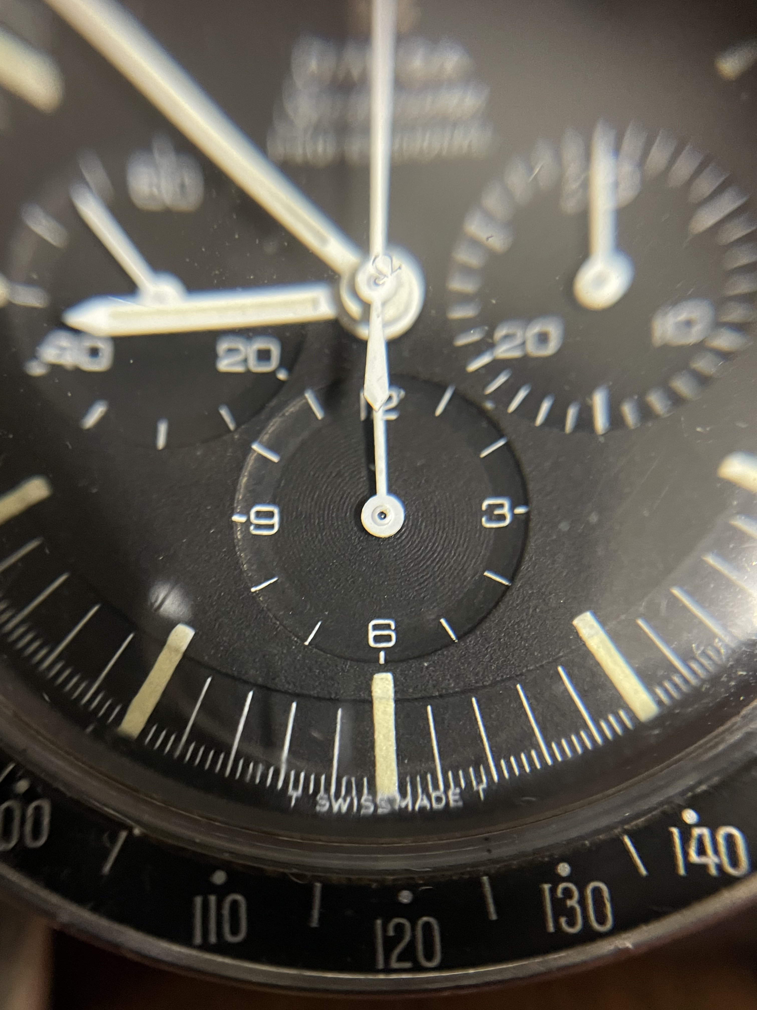 The dial is a stepped dial and has the applied logo. It’s a classic iconic look. Most speedy dials are flat now. The tritium on the dial and hands are perfect. They are well intact. Slightly aged to a lemon yellow. Look at the center of the hands, the white paint is untouched. Most centers are scratched and the metal is exposed.