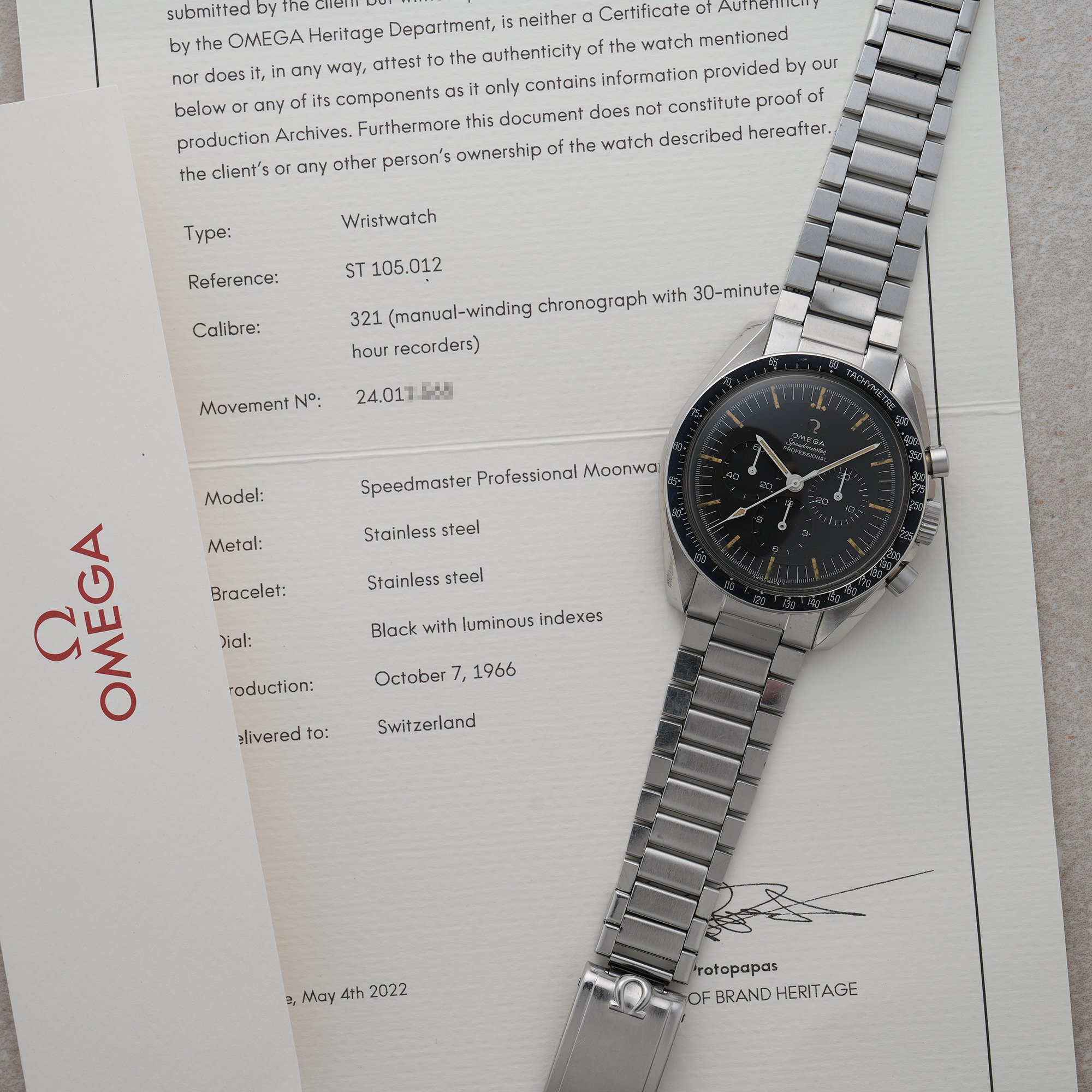 Notes: The Speedmaster Professional reference 105.012-65 is arguably the most important reference of them all as it is the exact same one used by the Apollo XI astronauts on their historic mission. Such a lovely crisp example of this reference is hard to find, and for the true Speedmaster enthusiast such prime example of the "True Moonwatch" is not to be missed!