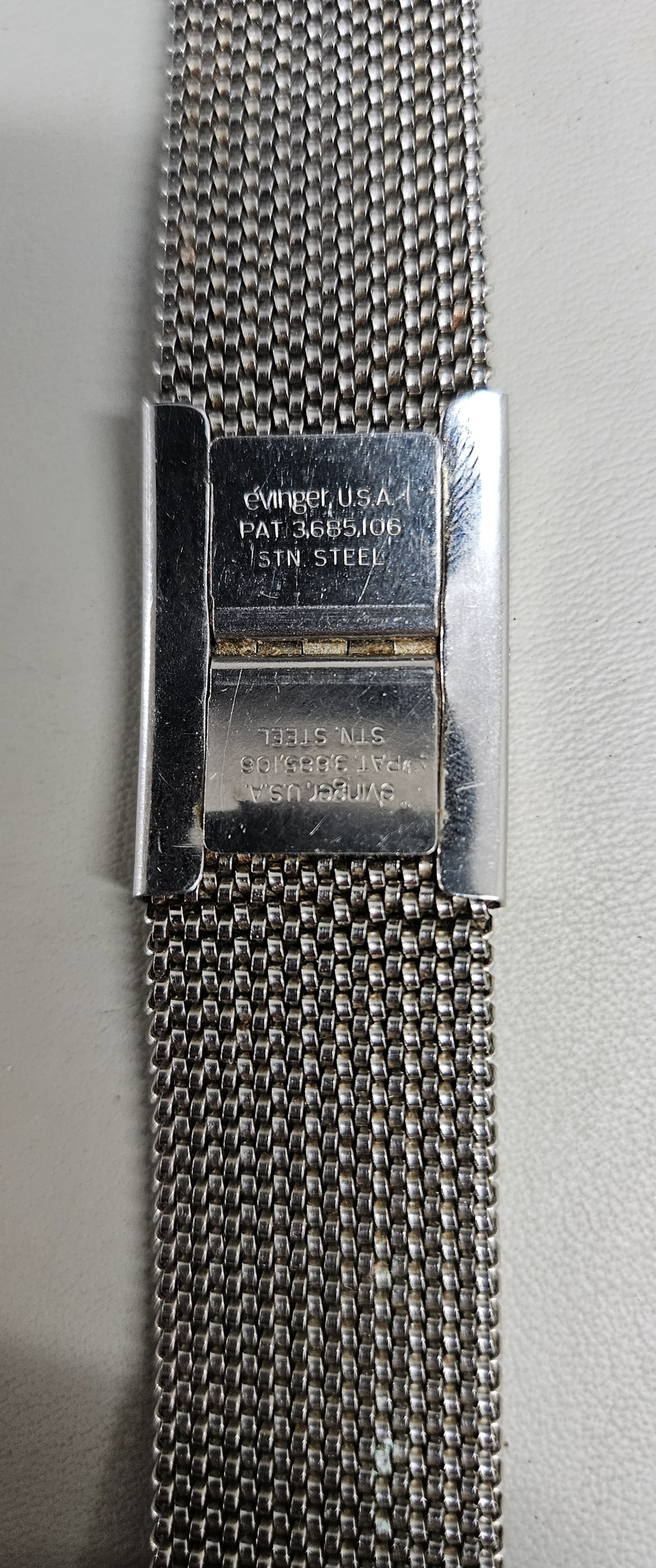 It came with an Evinger expanding bracelet that was unfortunately broken. If anyone has a lead on a replacement, I would also be interested.