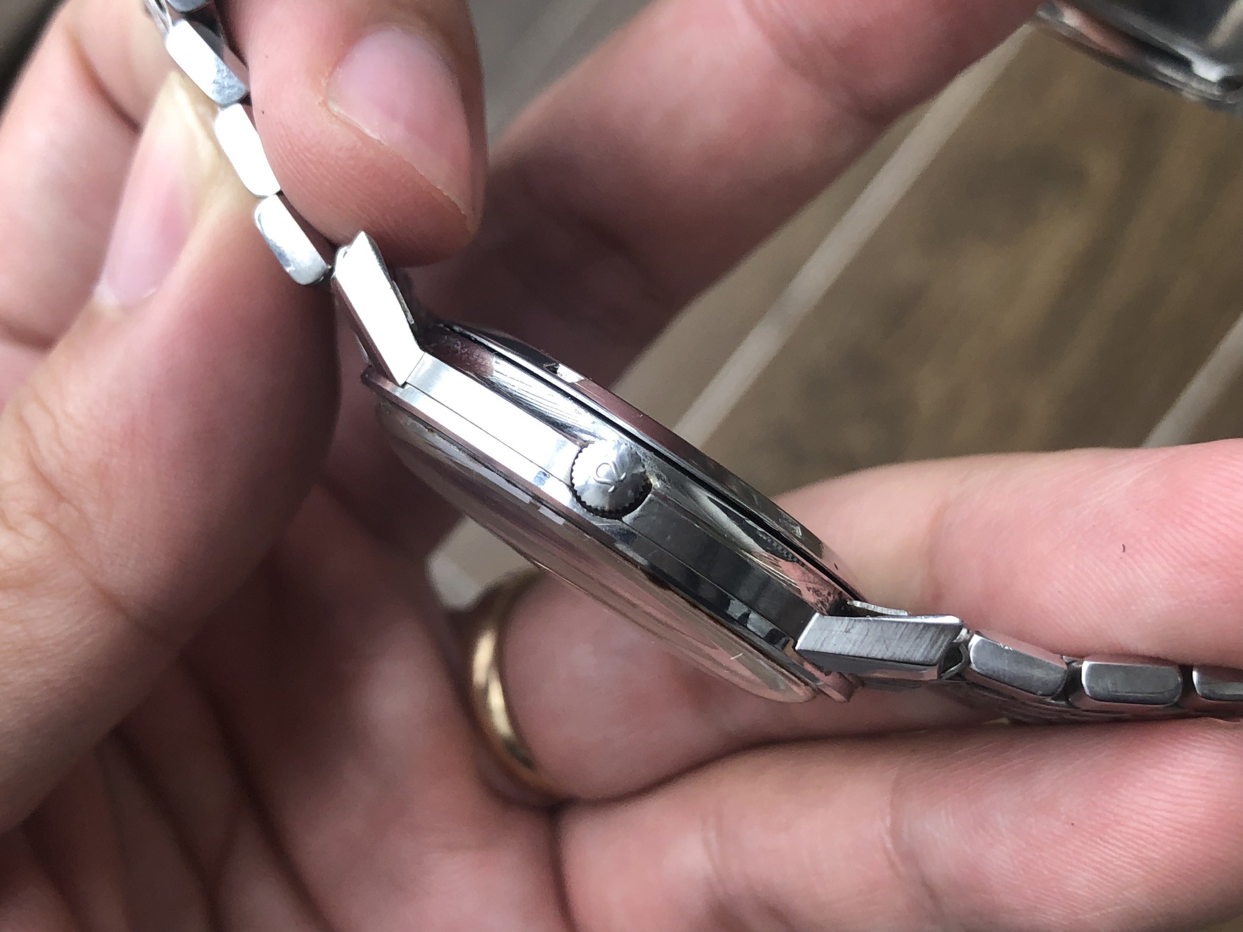 - Case: Sharp case, likely unpolished with sign of agings and wears (minor scratches on the lugs and tiny dings.)